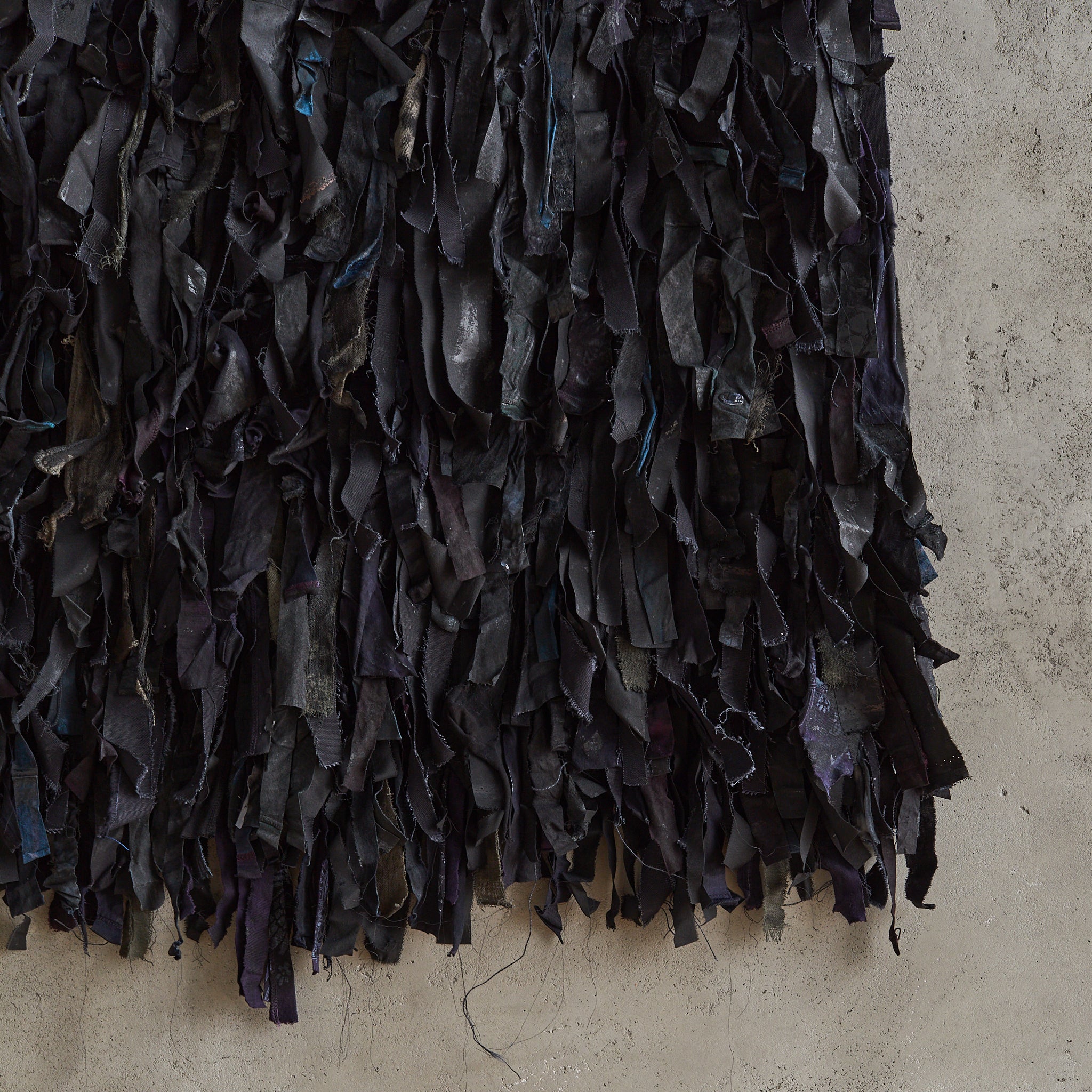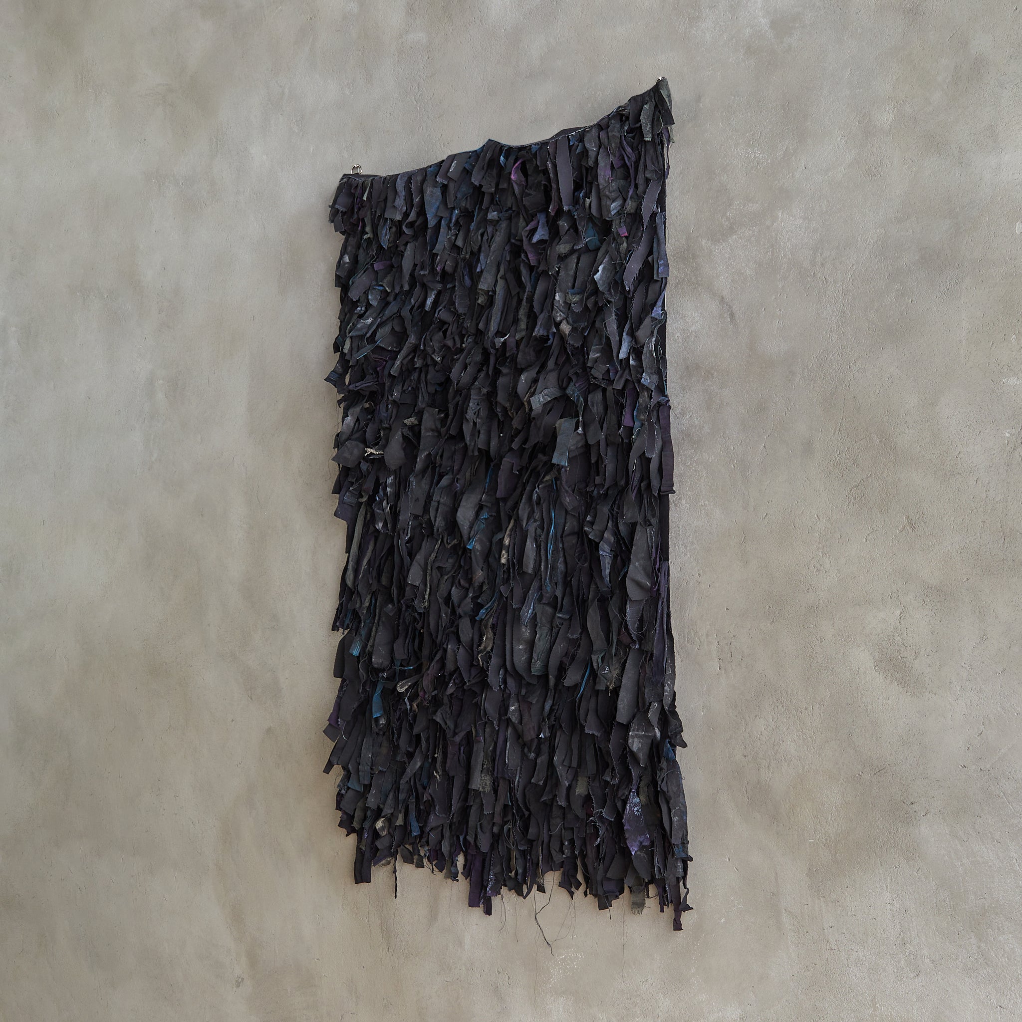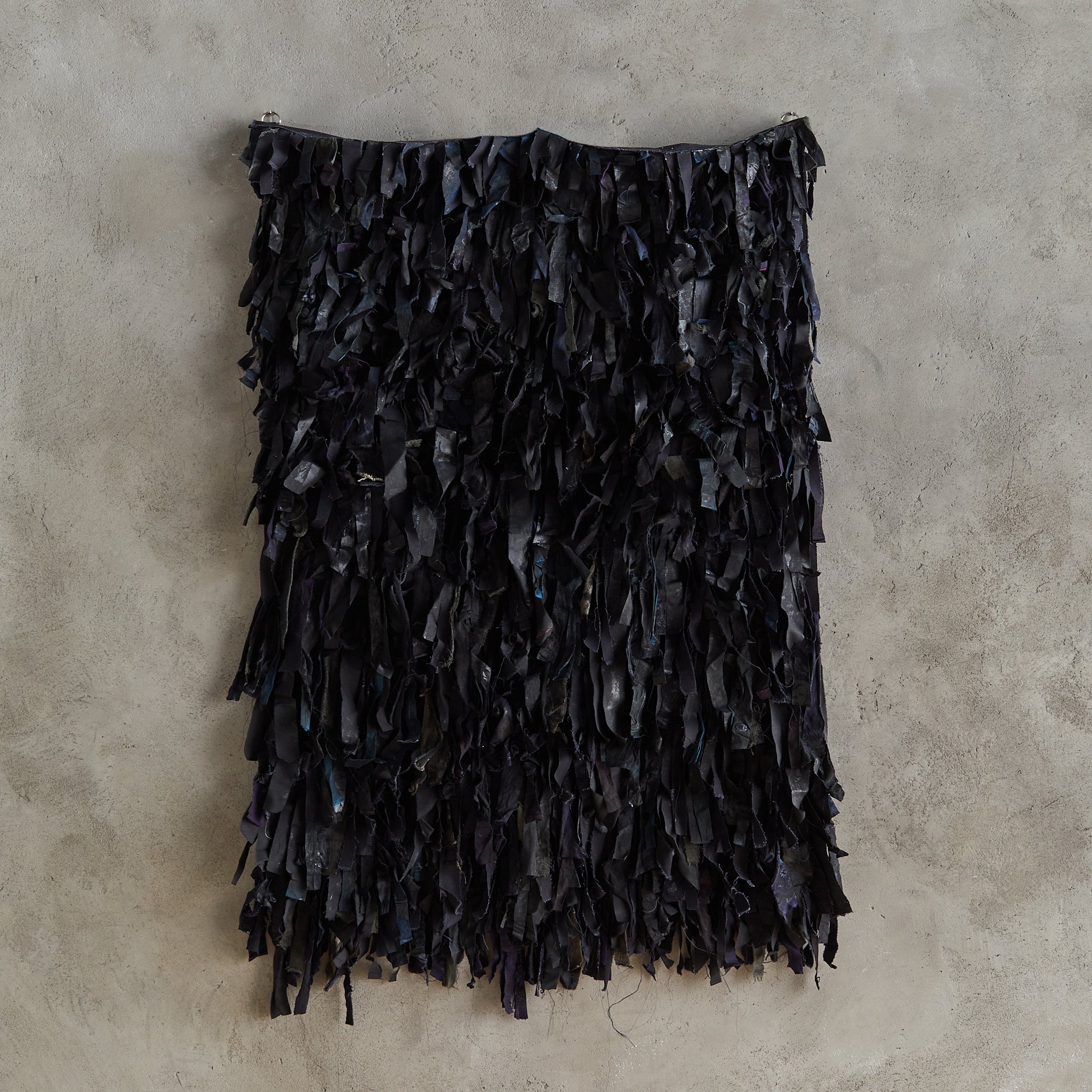 A textural wall sculpture by Canadian artist Erin Vincent, 2025. Composed of reclaimed fabric scraps, the piece reads like a tapestry undone—hundreds of hand-cut textile fragments layered and knotted into a cascading surface. Black dominates, but closer inspection reveals stray glimmers of blue and violet—echoes of the materials' past lives. A study in deconstruction and accumulation, the work evokes both garment and ruin, concealment and expression. Hanging hardware included along the backside.