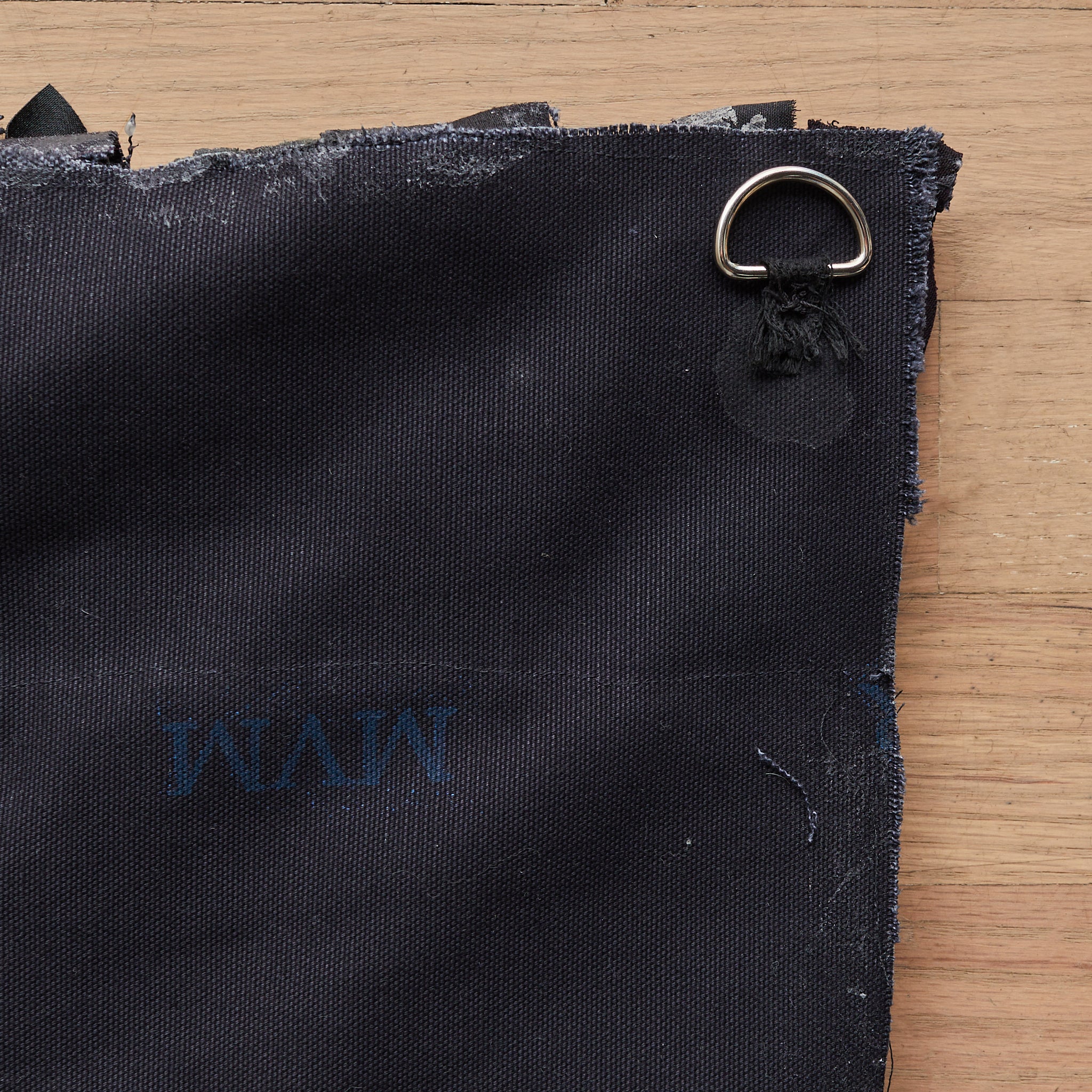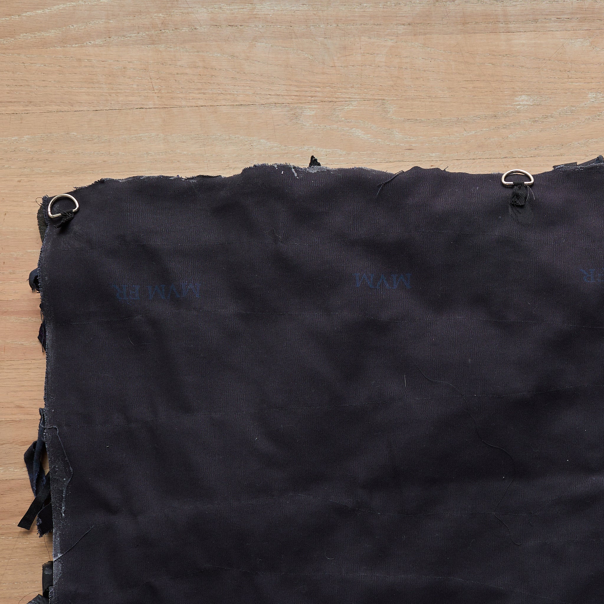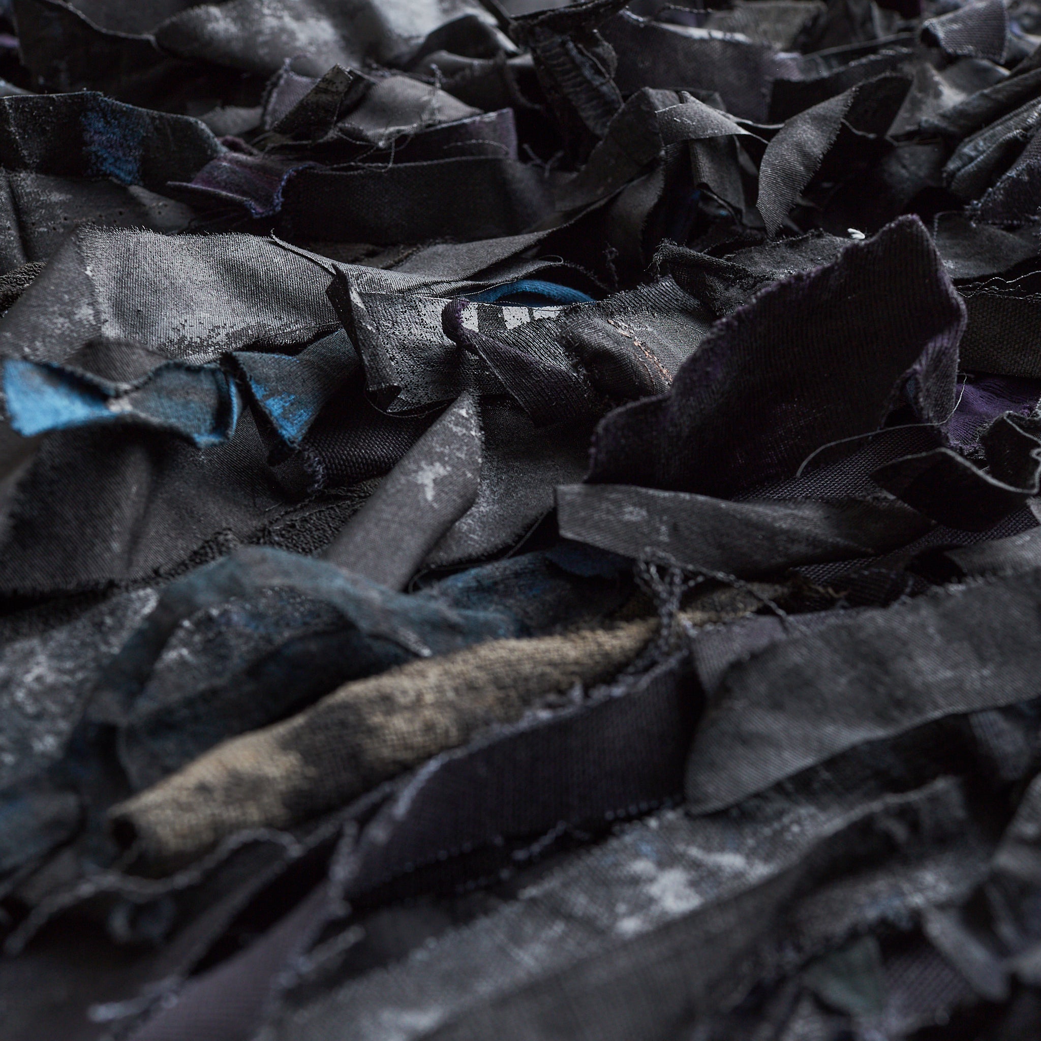 A textural wall sculpture by Canadian artist Erin Vincent, 2025. Composed of reclaimed fabric scraps, the piece reads like a tapestry undone—hundreds of hand-cut textile fragments layered and knotted into a cascading surface. Black dominates, but closer inspection reveals stray glimmers of blue and violet—echoes of the materials' past lives. A study in deconstruction and accumulation, the work evokes both garment and ruin, concealment and expression. Hanging hardware included along the backside.