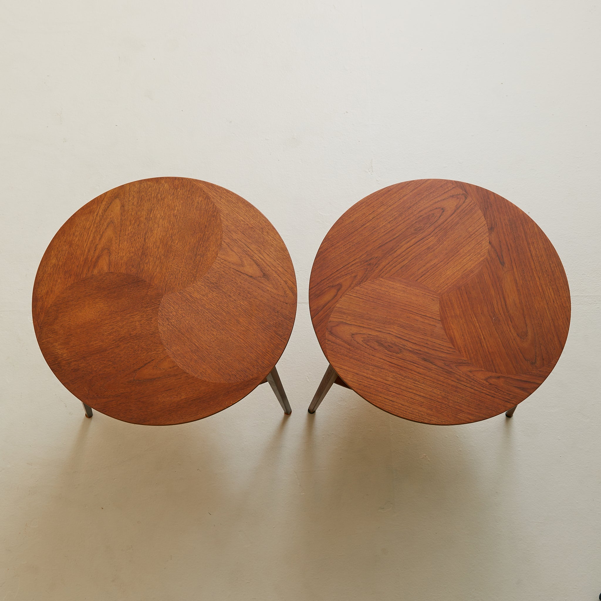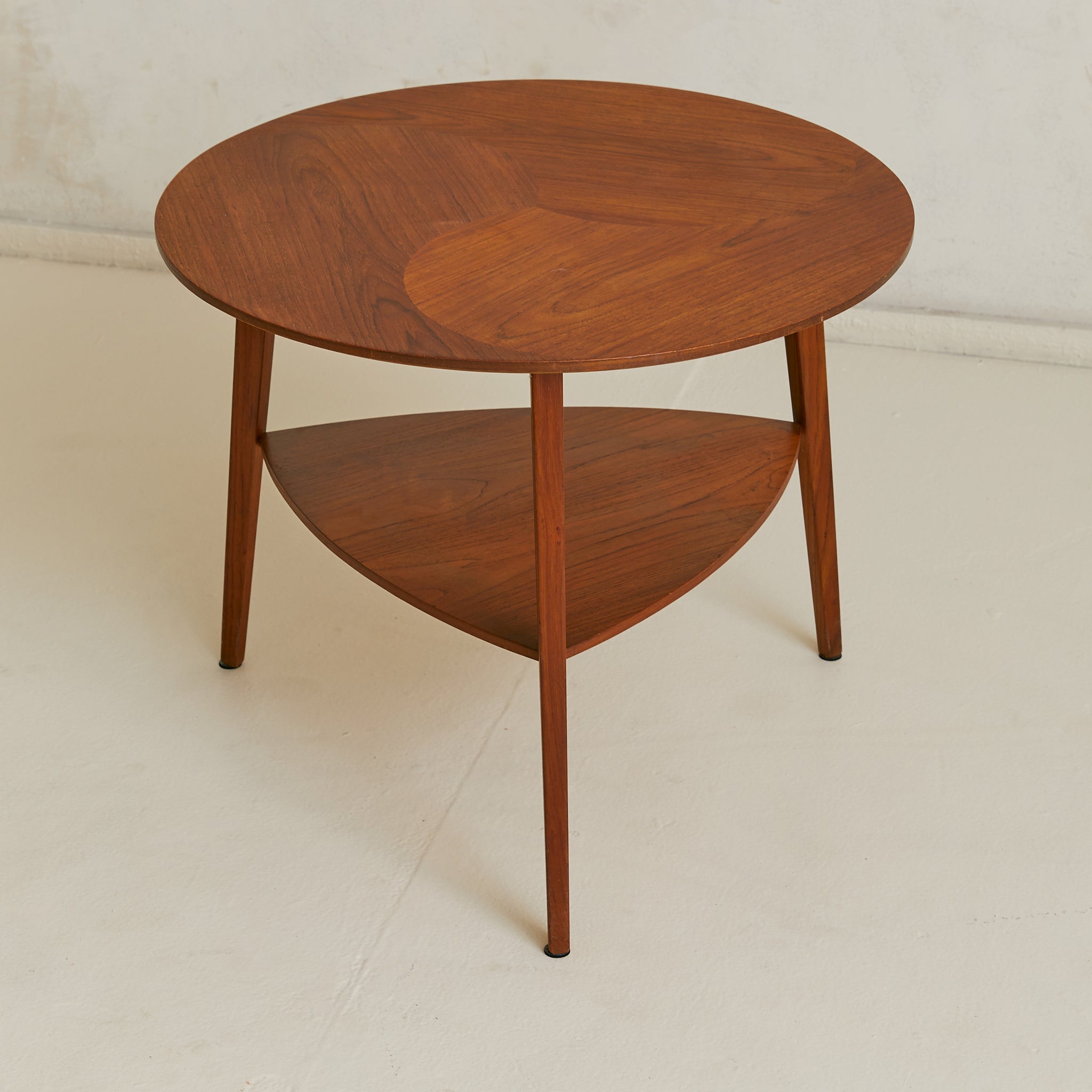 A 1960s Danish teak side table attributed to Georg Jensen for Kubus. The round top is crafted in segmented veneer, its grain arranged in a curving geometric pattern that radiates across the surface. Below, a triangular lower shelf floats between three tapering legs, a functional accent well-suited for books or magazines.