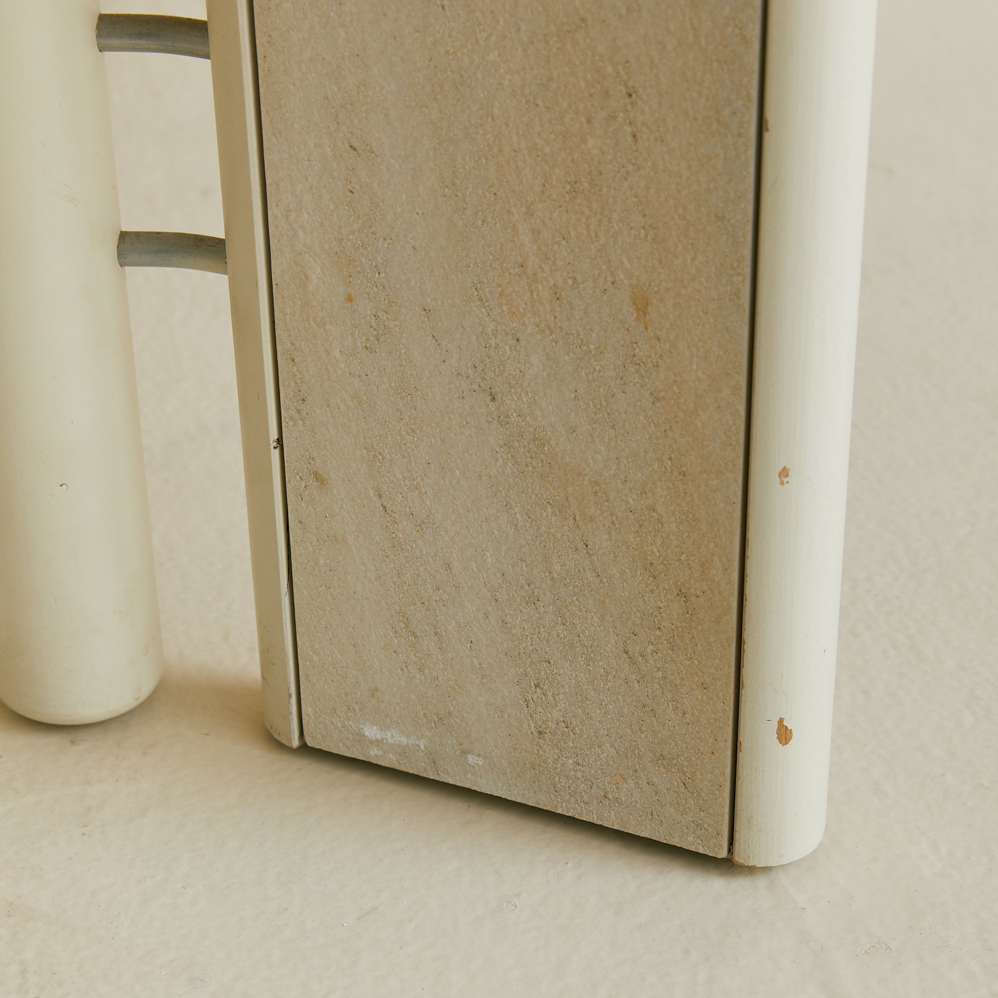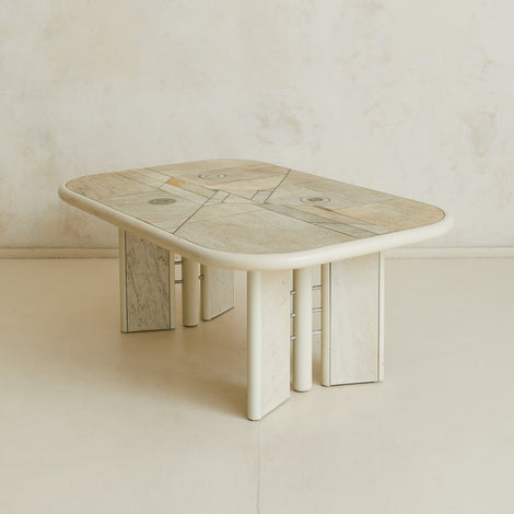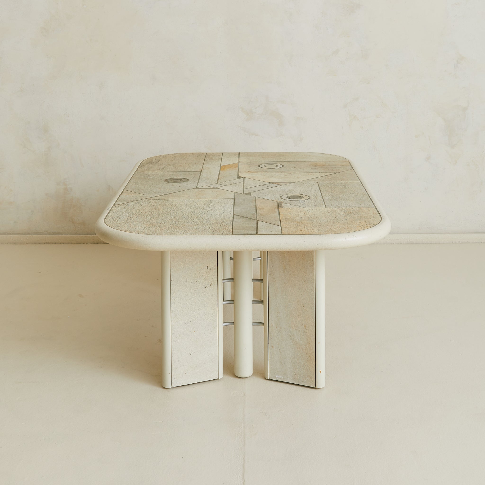 Raised on sculptural panel legs joined by tubular metal stretchers, the table balances mass and line. Kingma’s influence is clear in the architectural weight and mosaic-like surface, where geological texture meets modernist abstraction.