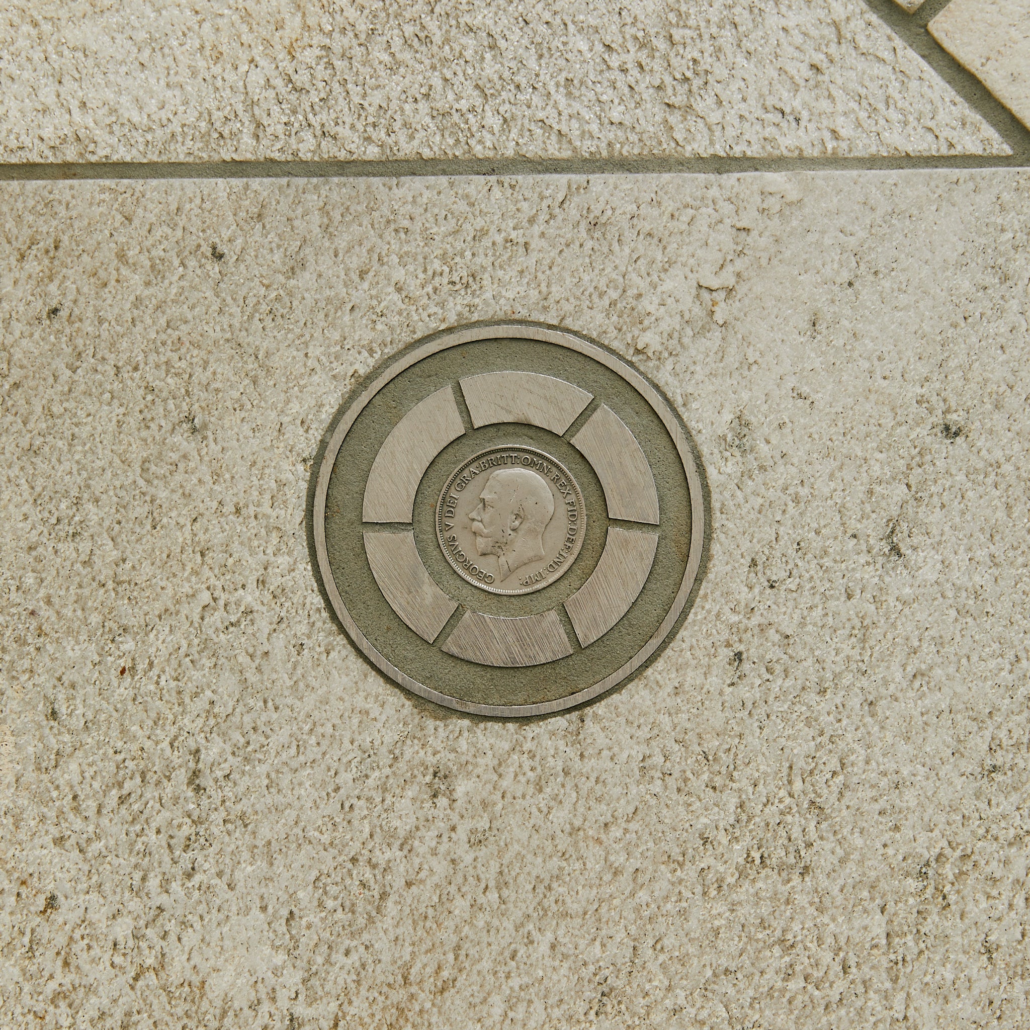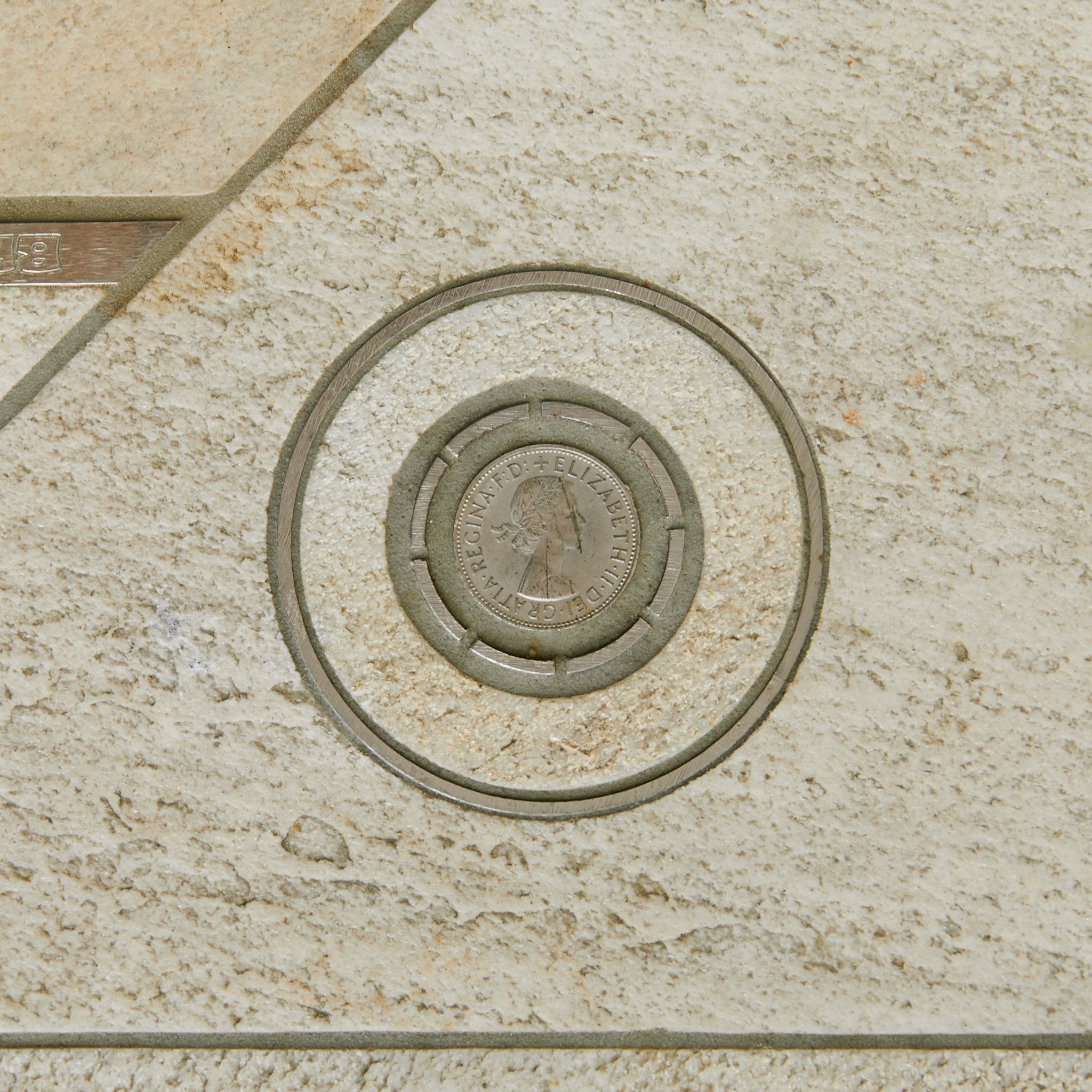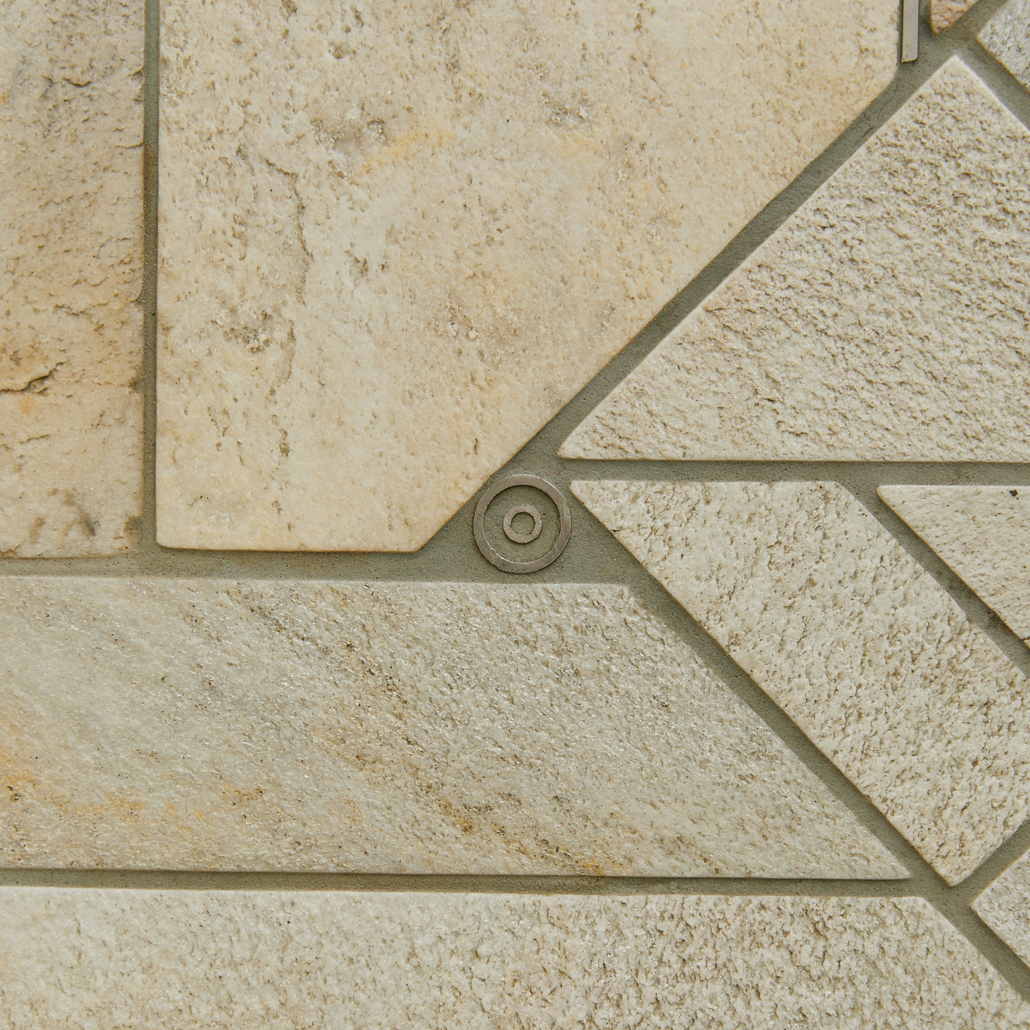 A Brutalist stone and metal inlay coffee table from the Netherlands, crafted in the 1970s in the manner of Paul Kingma. The rectangular top is formed from tessellated slabs of natural stone, arranged in a fractured geometric composition and set within a rounded frame. Two decorative coins are embedded into the surface, while fine metal inlays trace angular divisions across the stone.