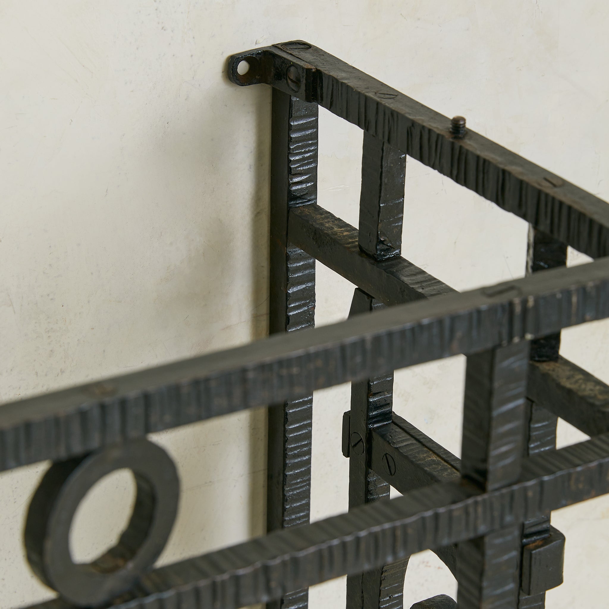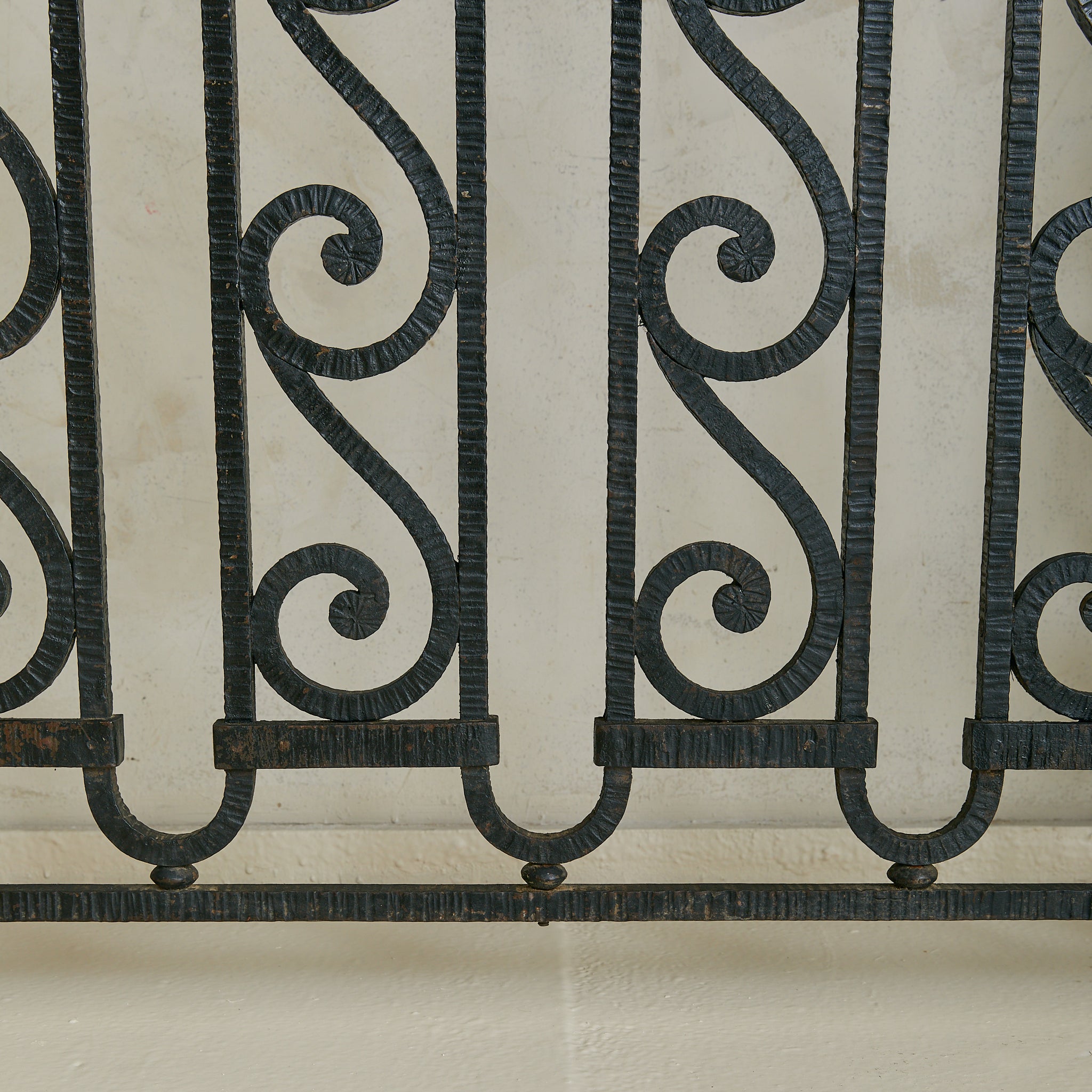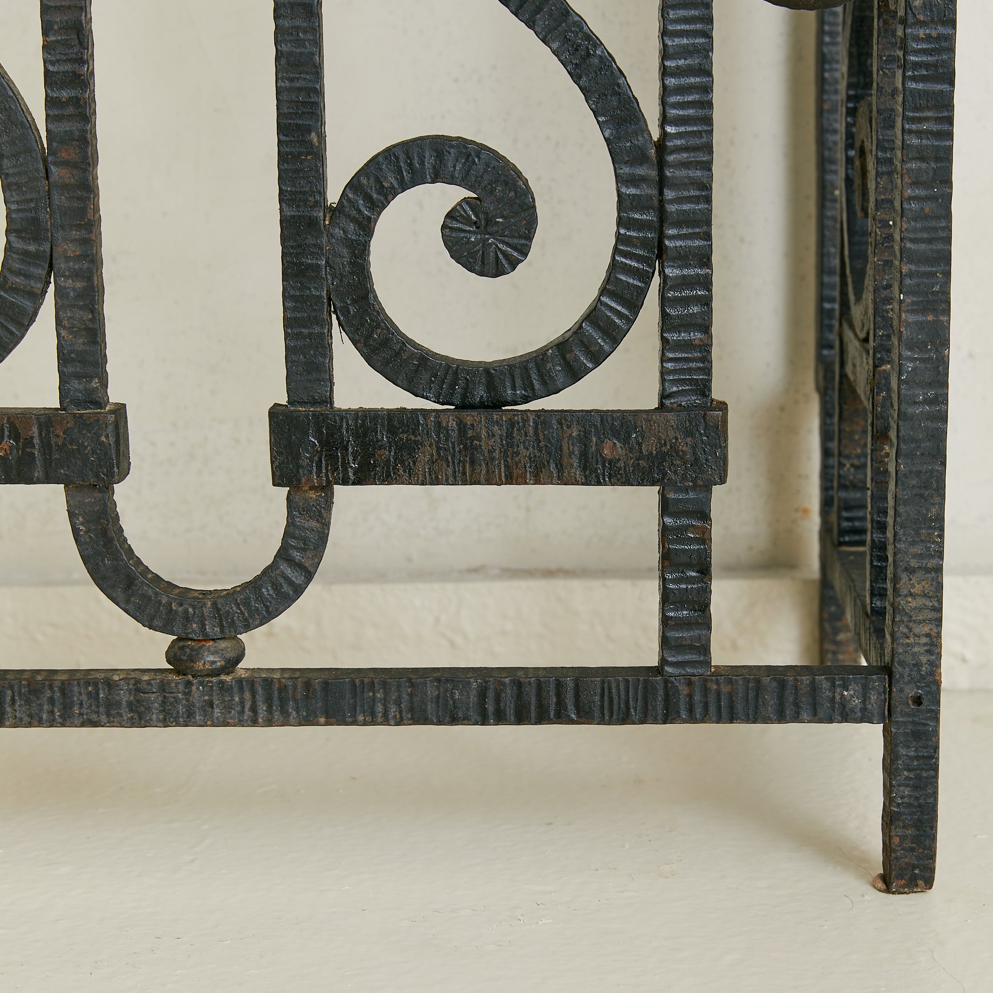 A French Art Deco console table, circa 1925, its wrought iron base worked into elegant scrolls and hammered textures. The blackened iron, richly patinated, rises in a rhythmic interplay of verticals and volutes, softened by circular medallions that punctuate the frame.