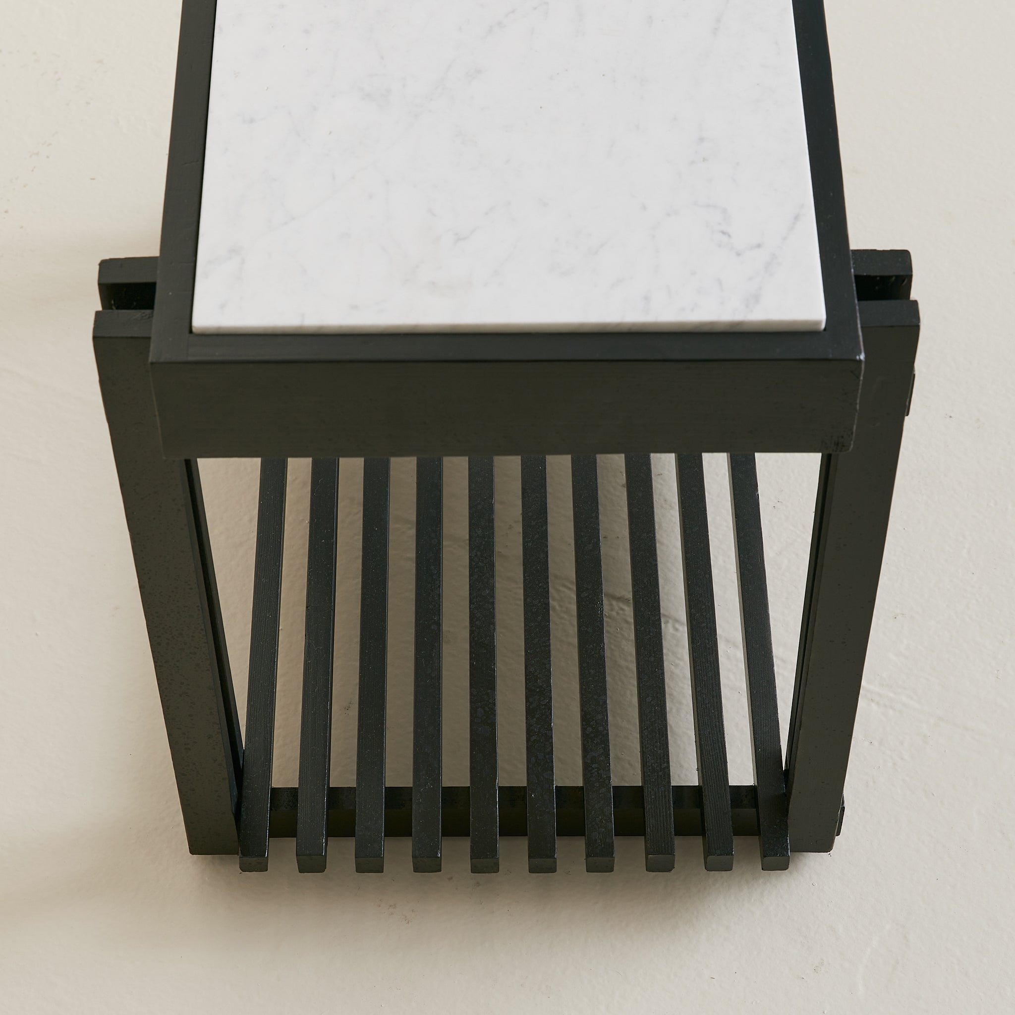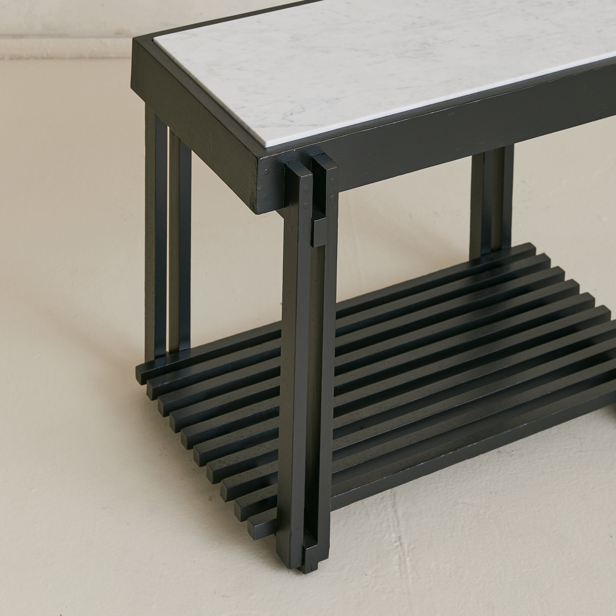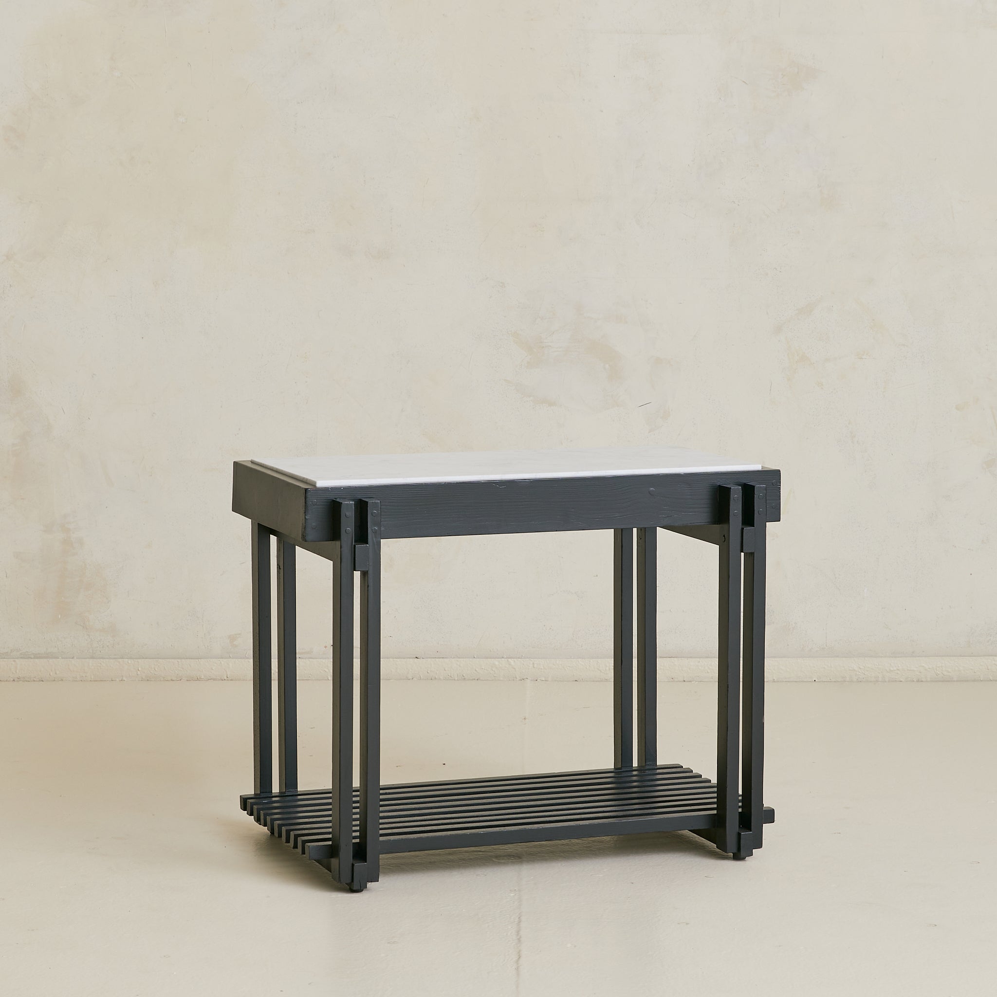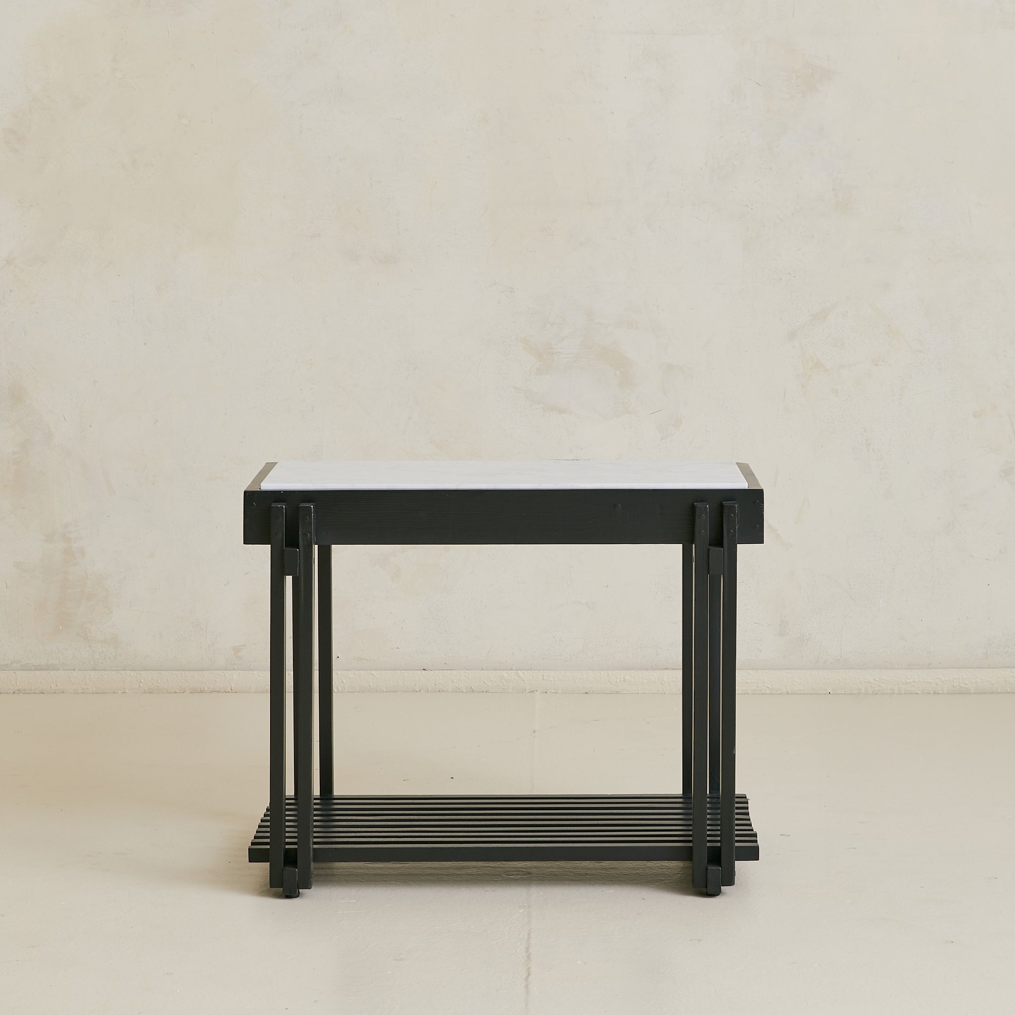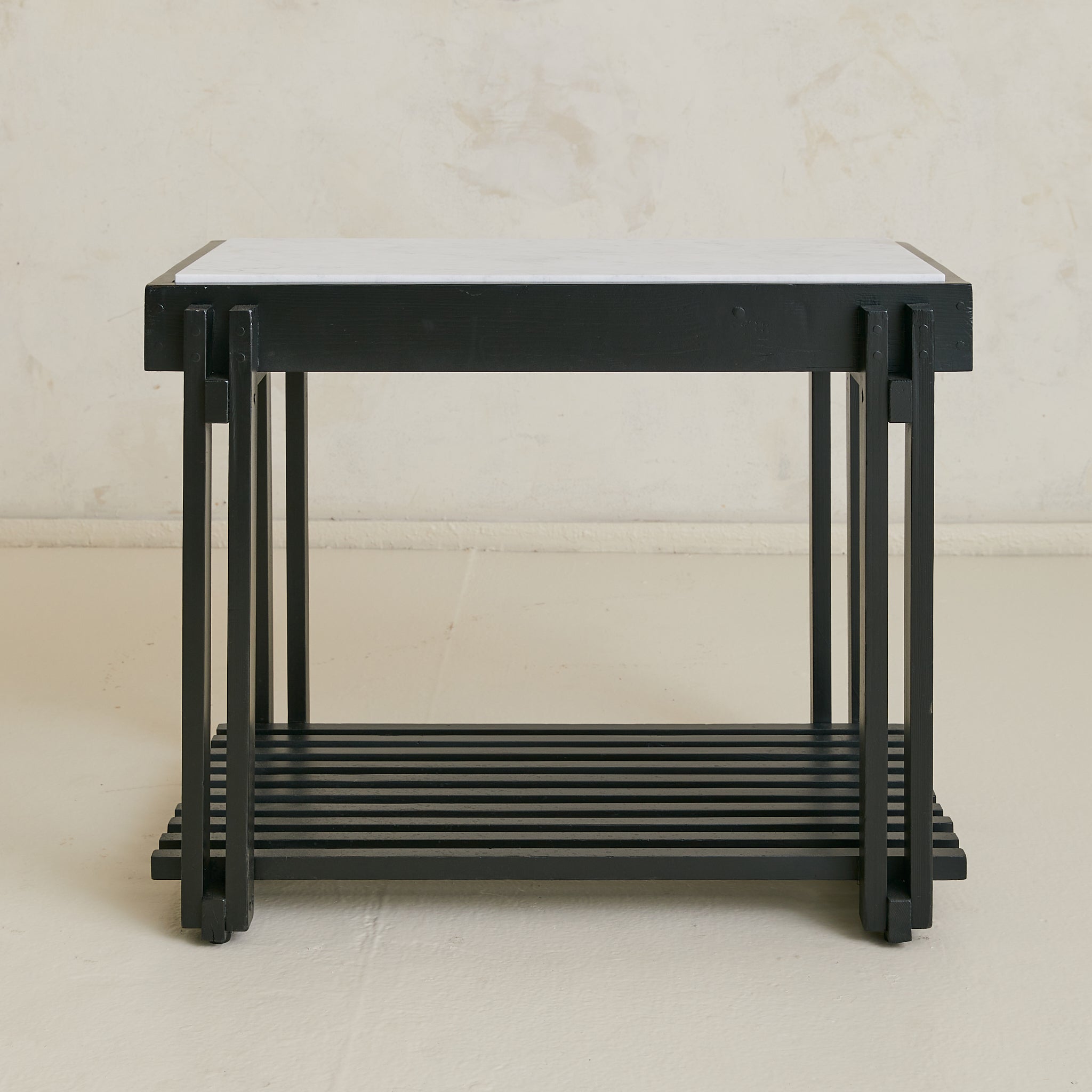 A French end table from the 1970s, combining architectural woodwork with a rectangular white marble top veined in soft grey. The black frame’s slender supports rise to meet the surface and descend to a slatted lower shelf, creating both structure and storage.