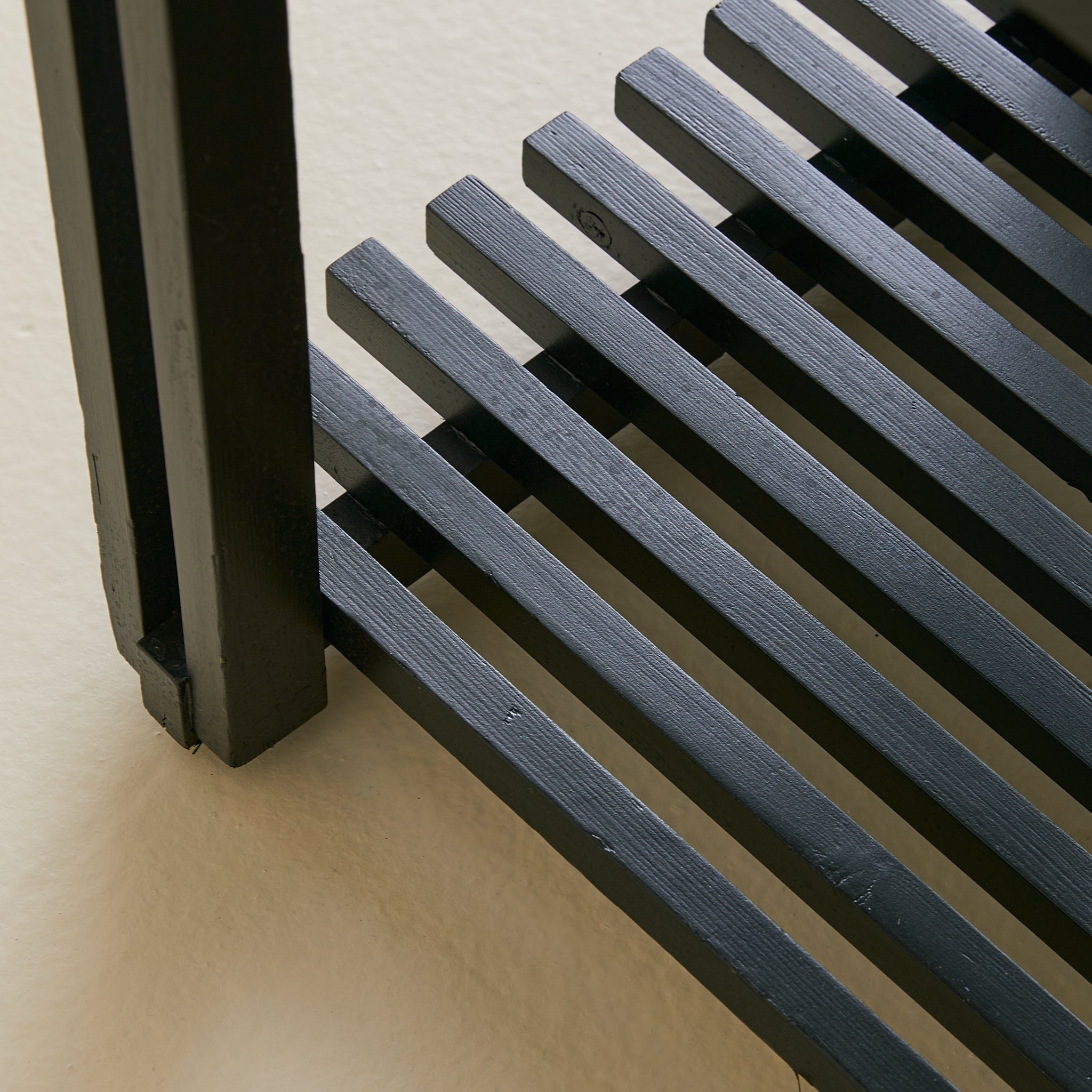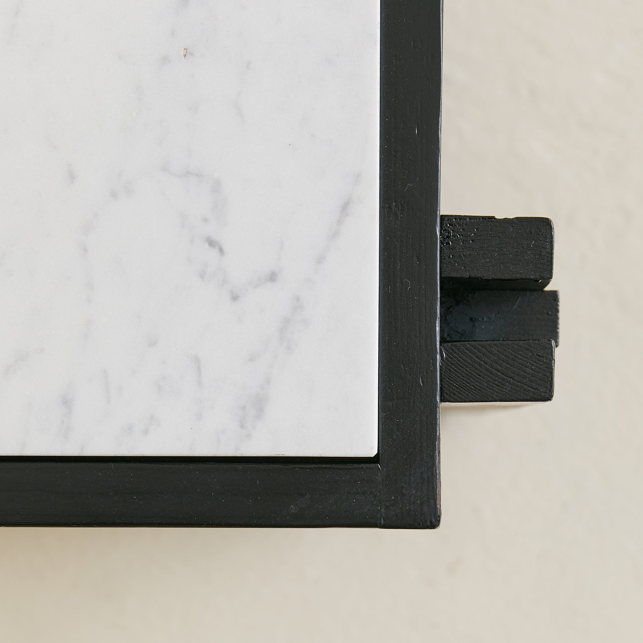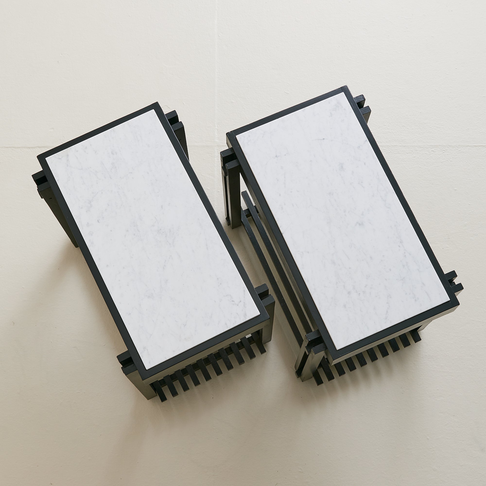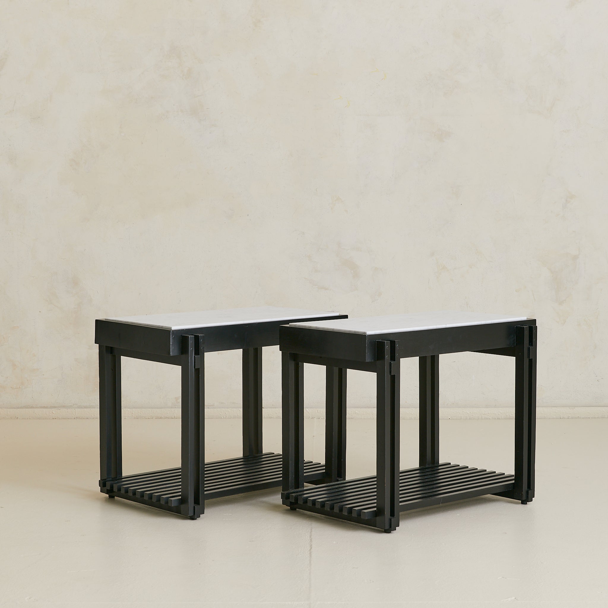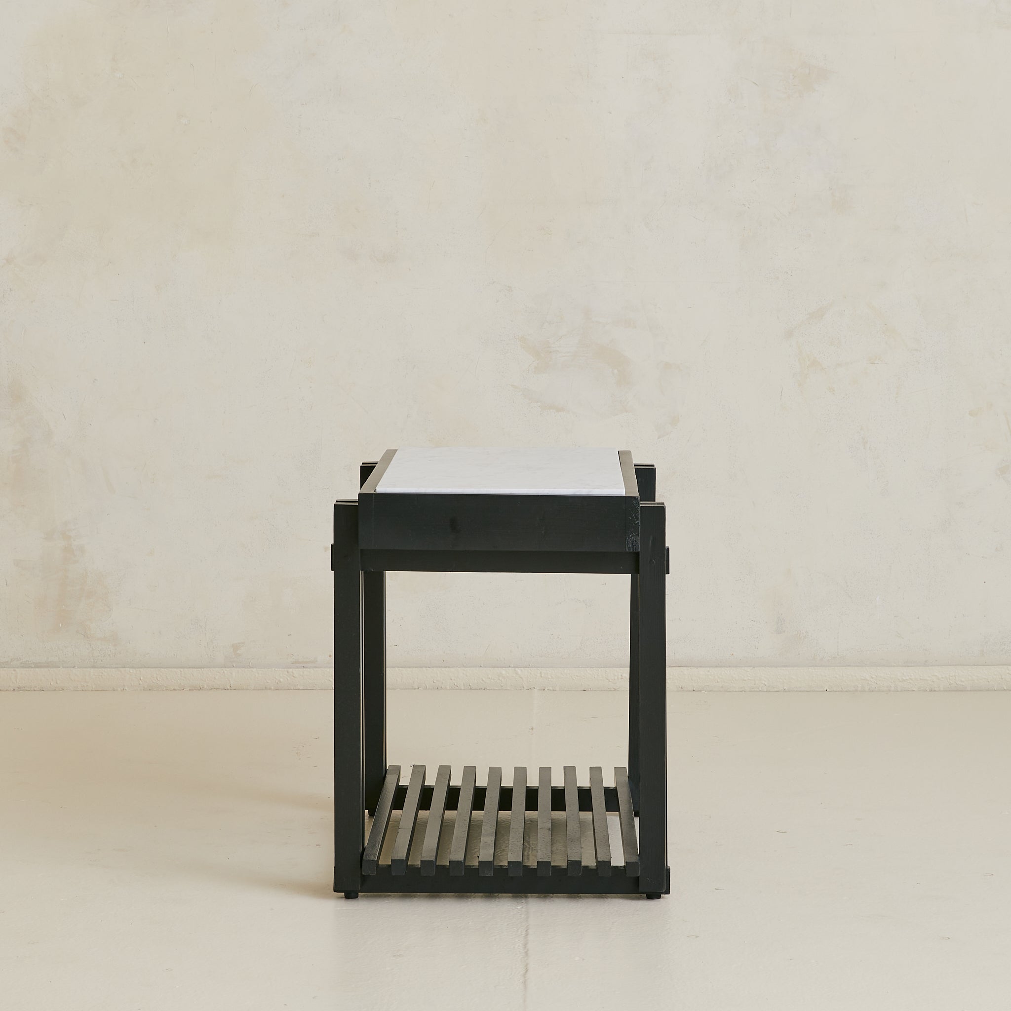 A French end table from the 1970s, combining architectural woodwork with a rectangular white marble top veined in soft grey. The black frame’s slender supports rise to meet the surface and descend to a slatted lower shelf, creating both structure and storage.
