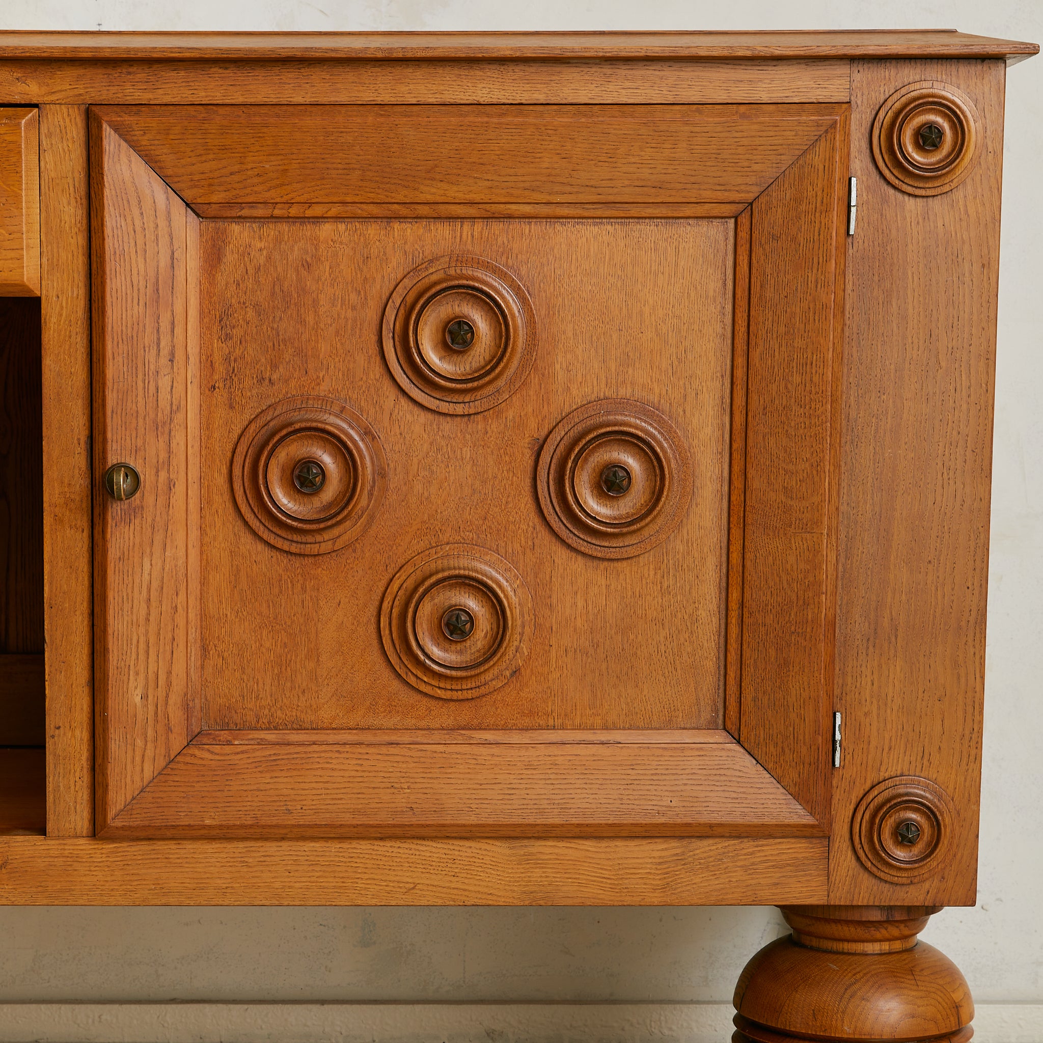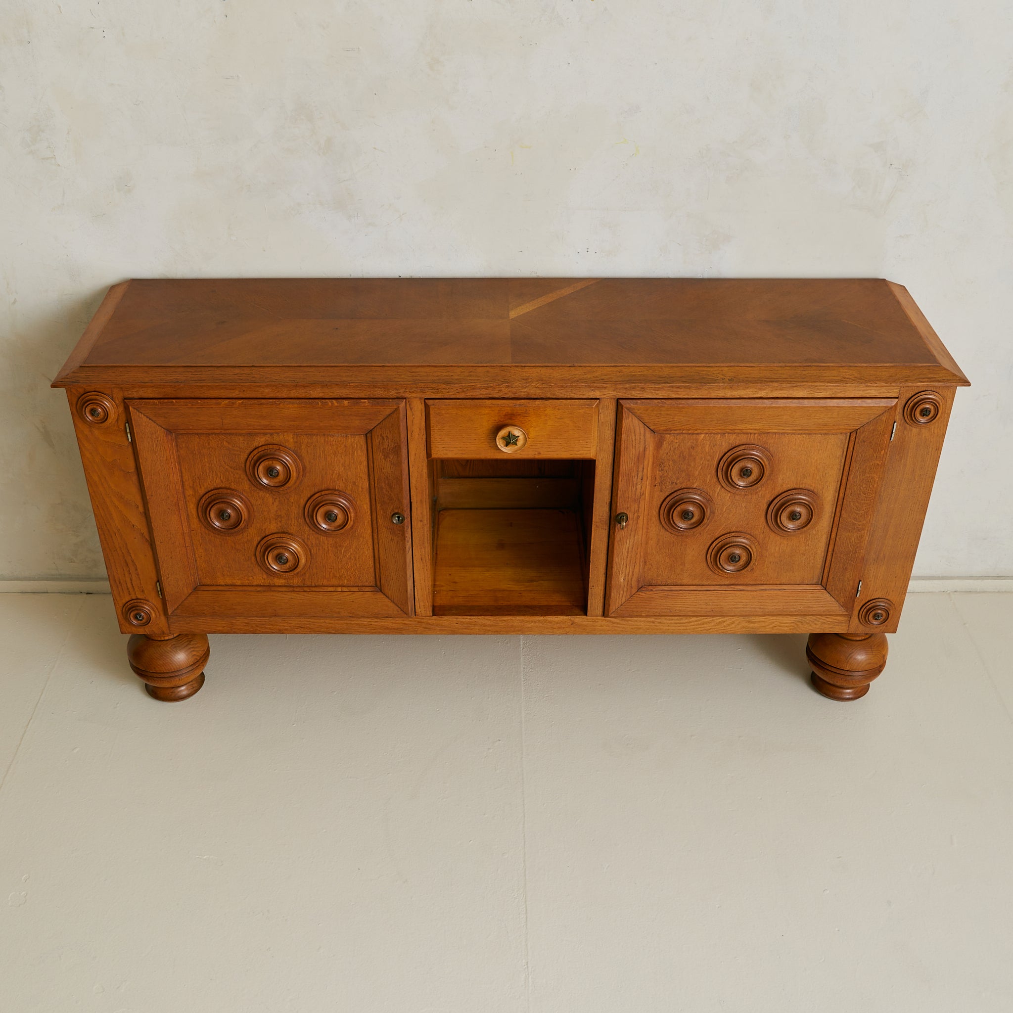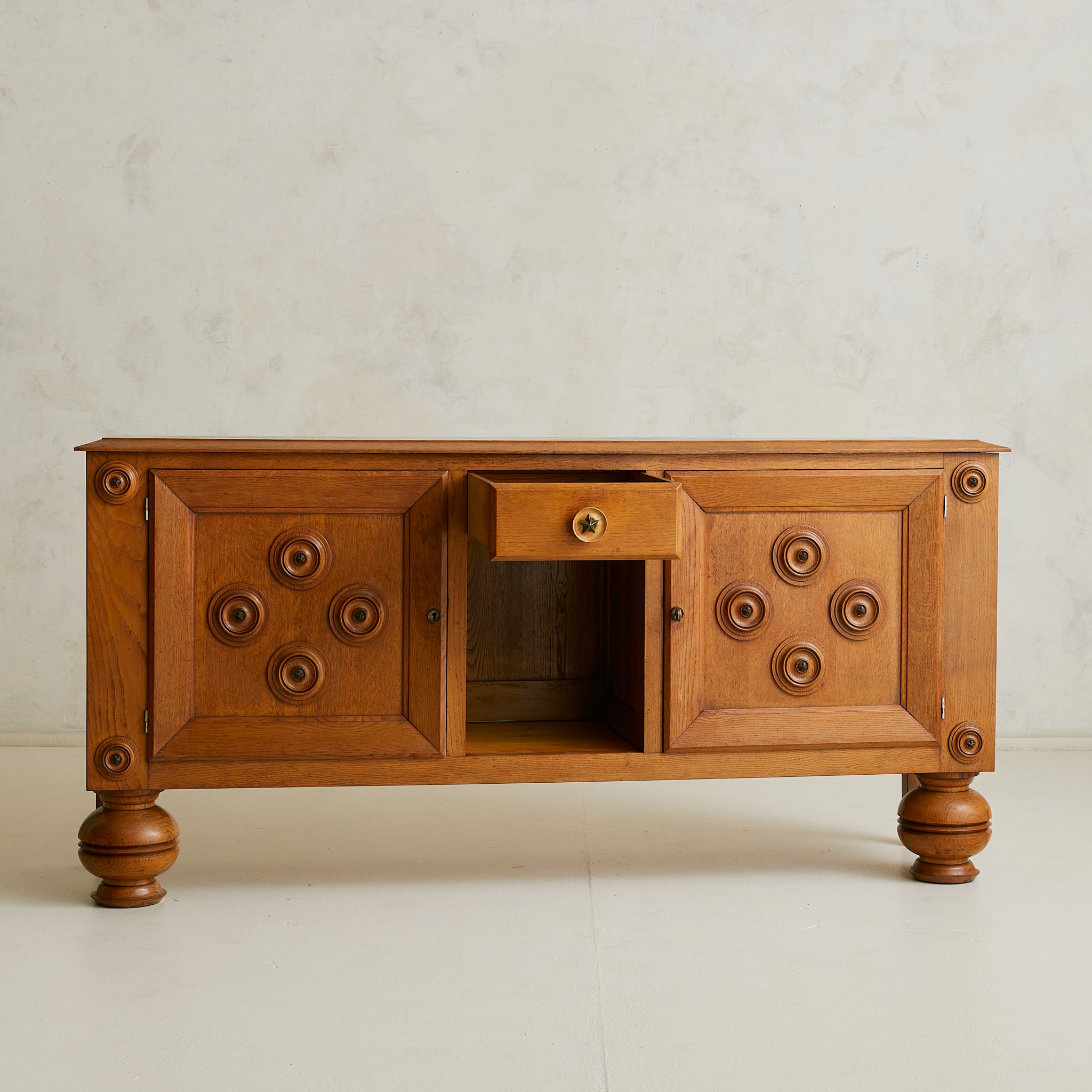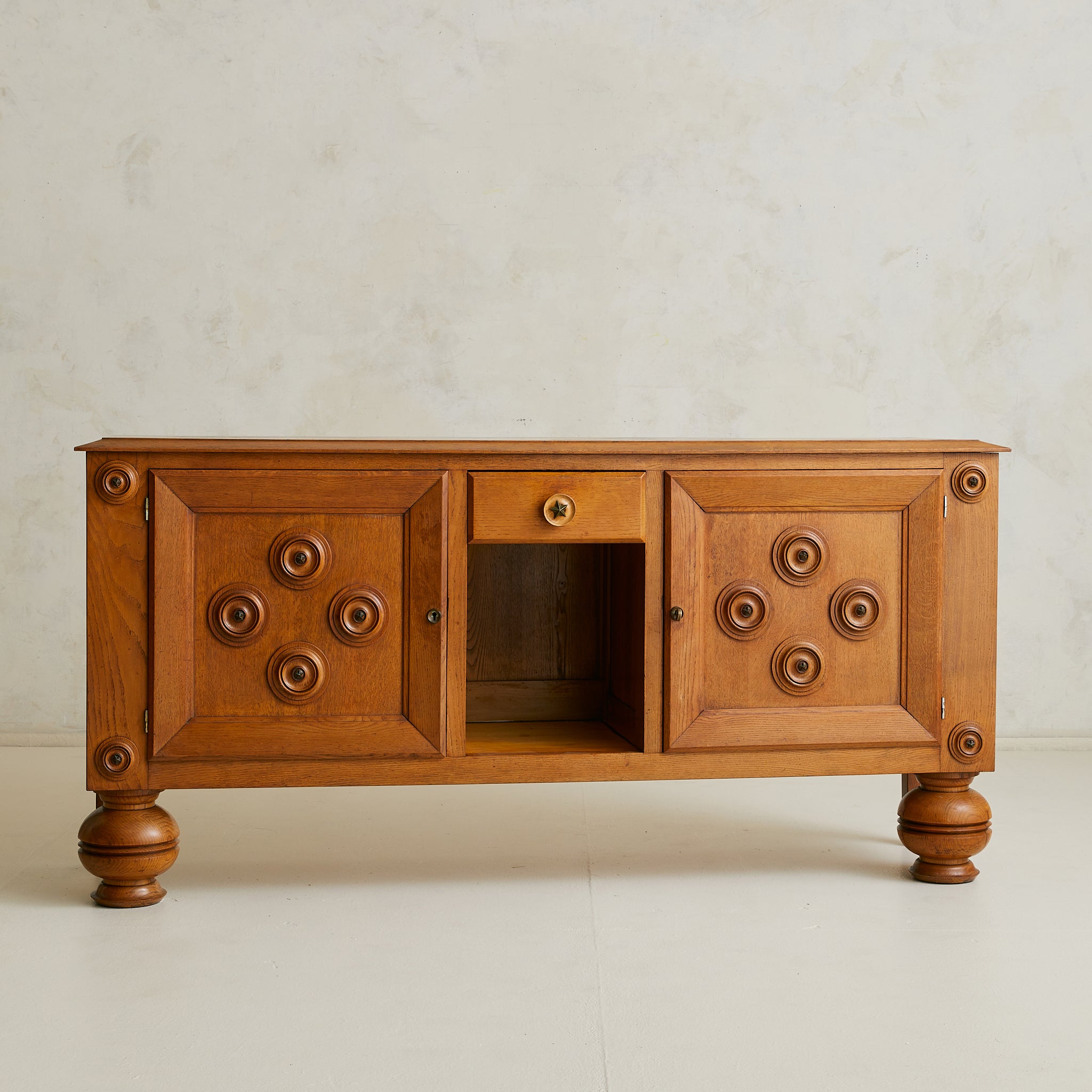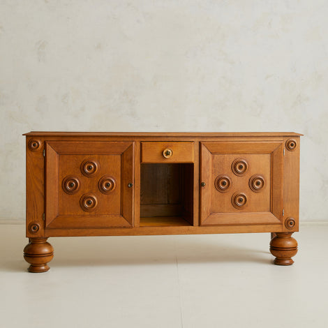 A 1940s French sideboard in carved oak, where geometry and ornament find balance. Over six feet wide, the case rests on turned bun feet, grounding the monumental form. Two paneled doors are set in deep frames, each adorned with concentric circular carvings that radiate outward. At their core, star motifs echo the celestial brass detail of the central drawer.