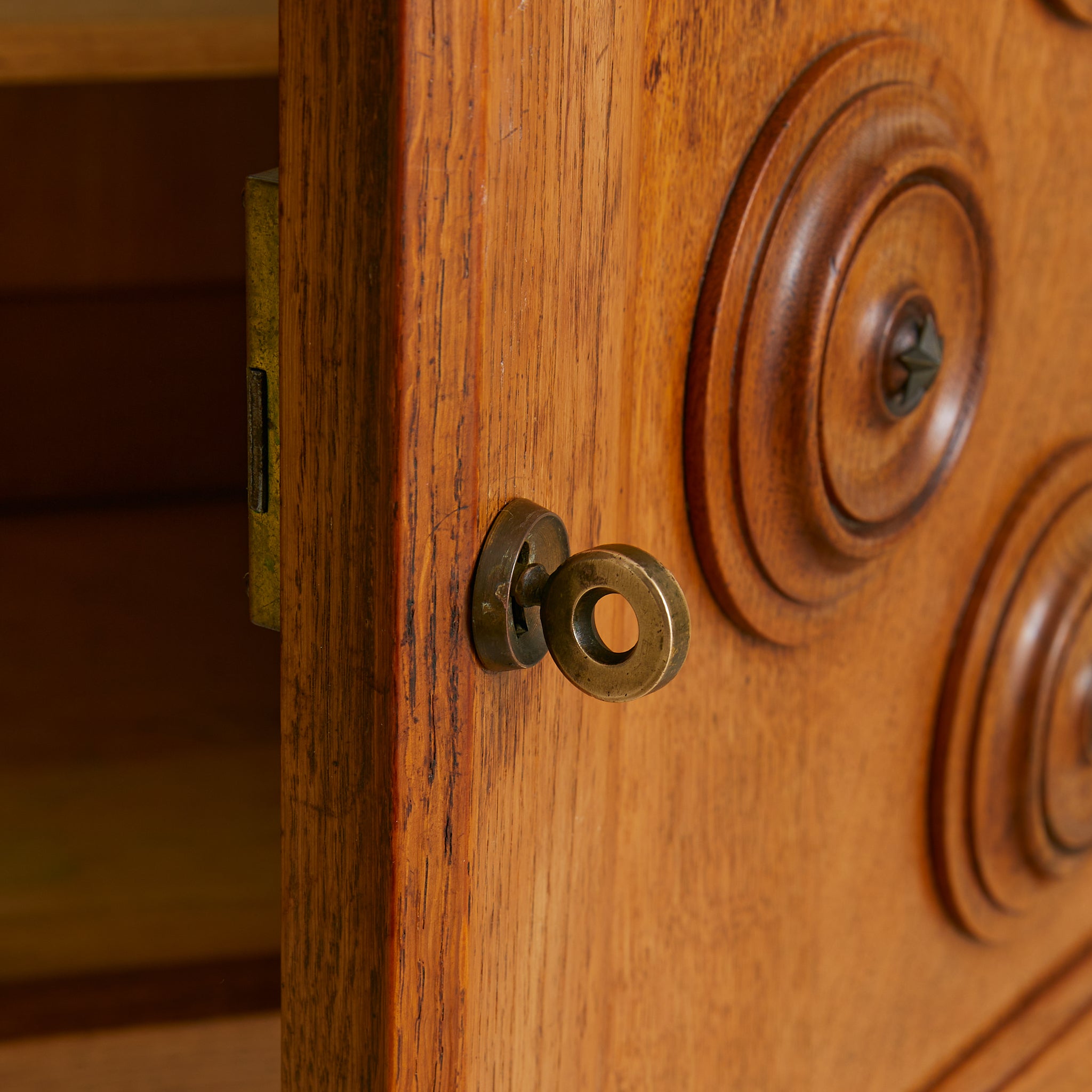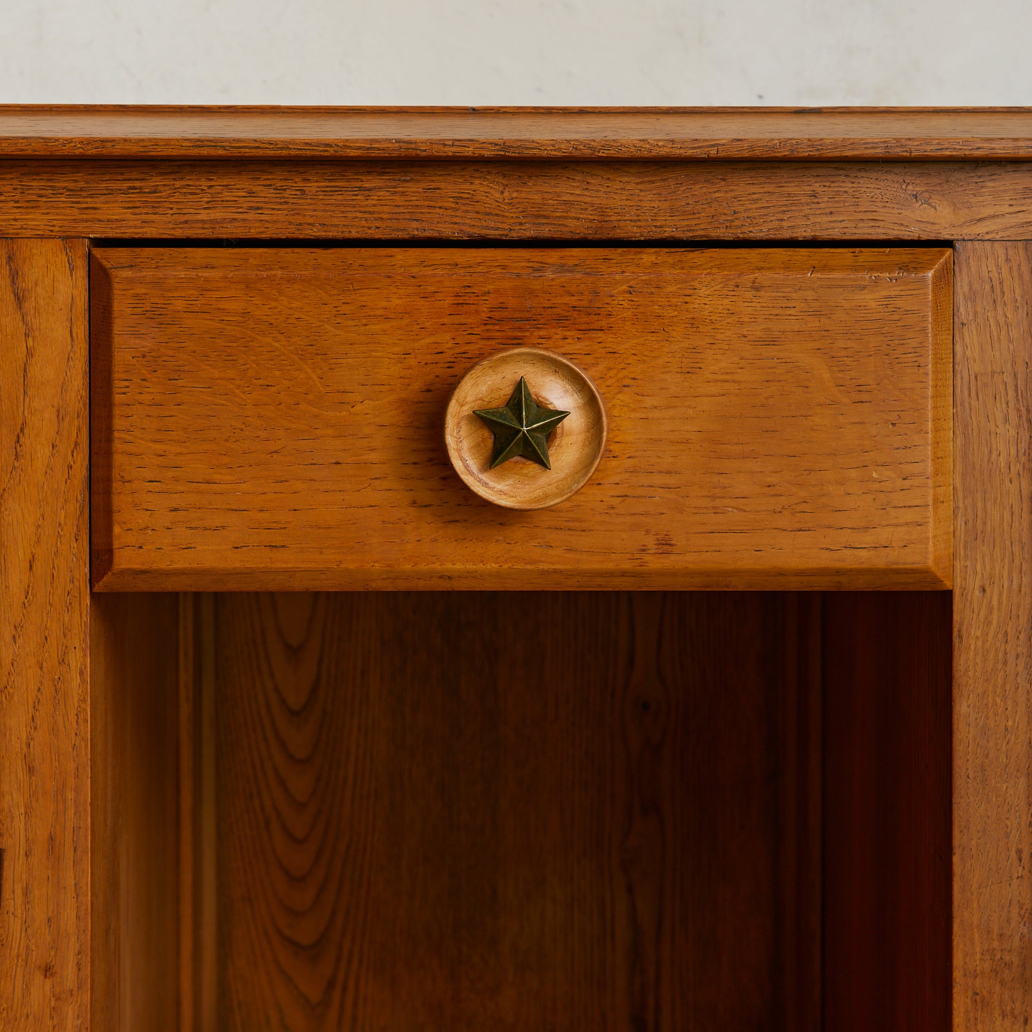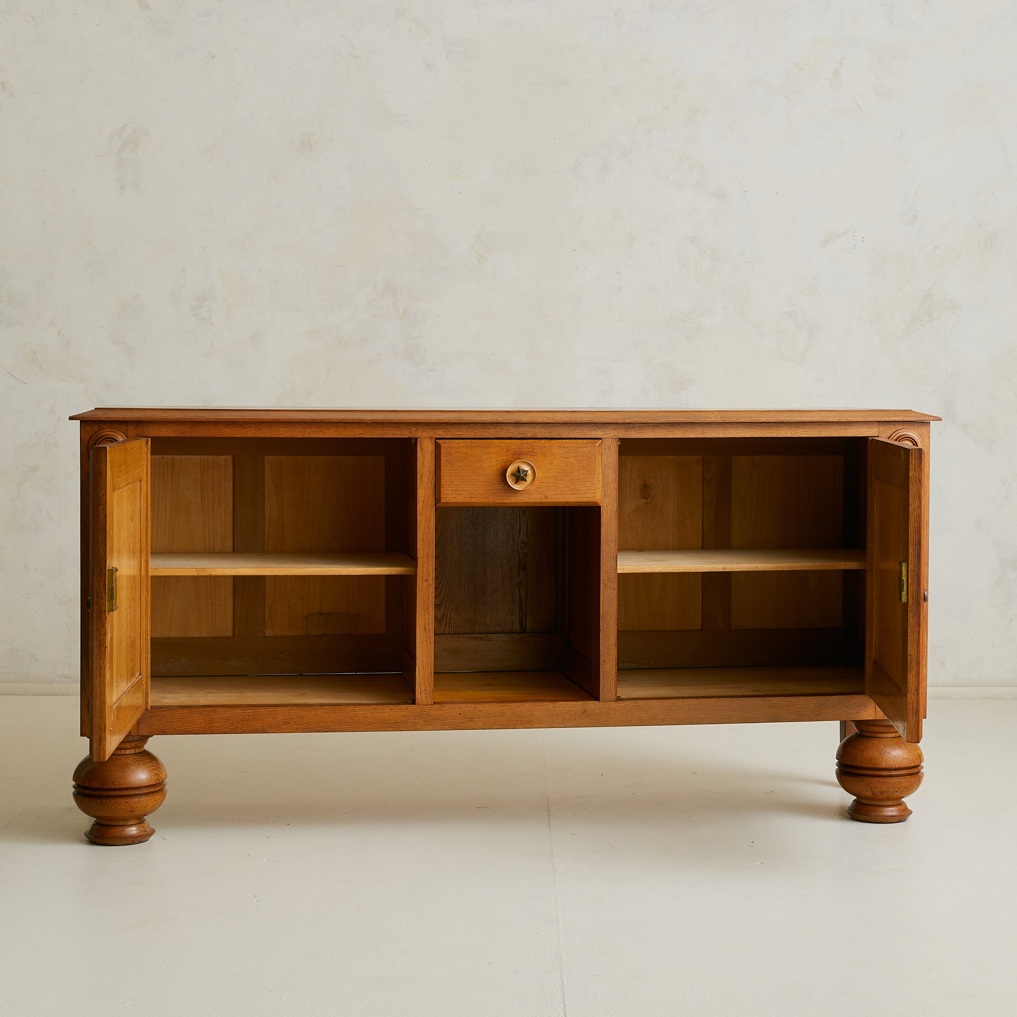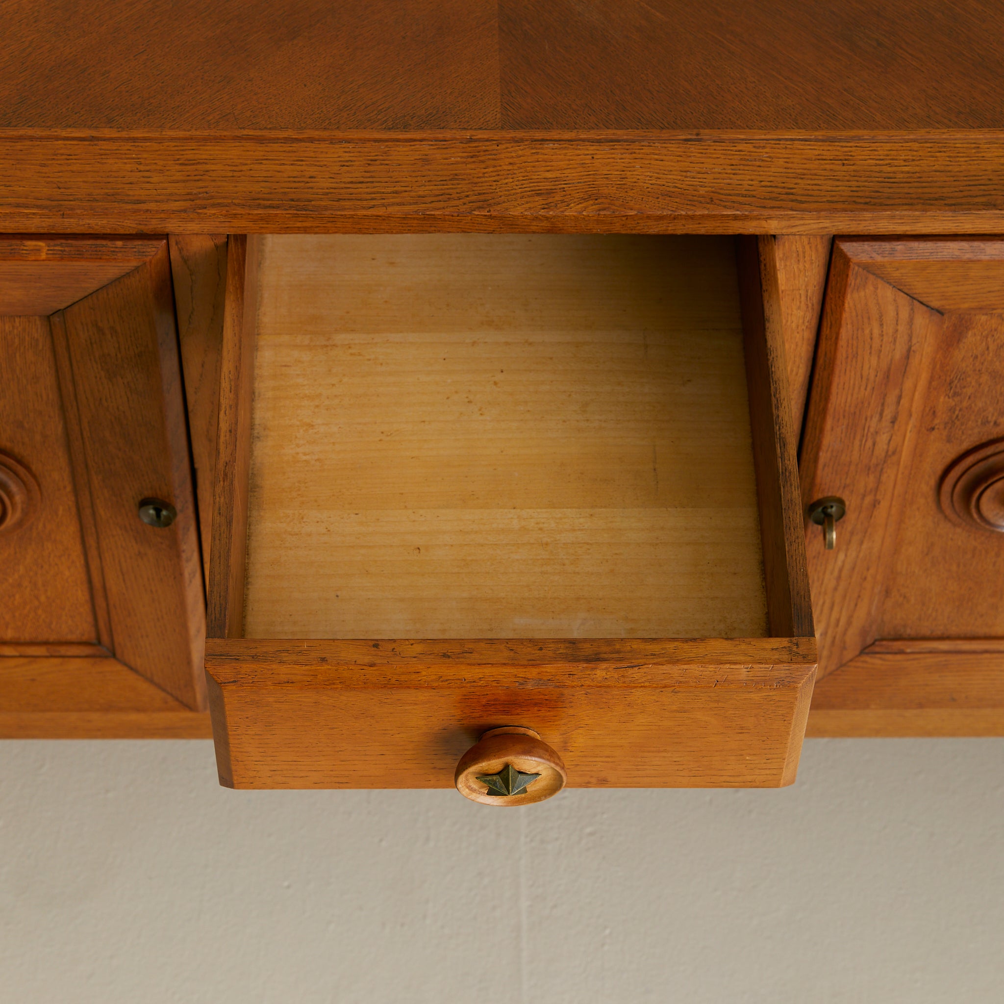 A 1940s French sideboard in carved oak, where geometry and ornament find balance. Over six feet wide, the case rests on turned bun feet, grounding the monumental form. Two paneled doors are set in deep frames, each adorned with concentric circular carvings that radiate outward. At their core, star motifs echo the celestial brass detail of the central drawer.