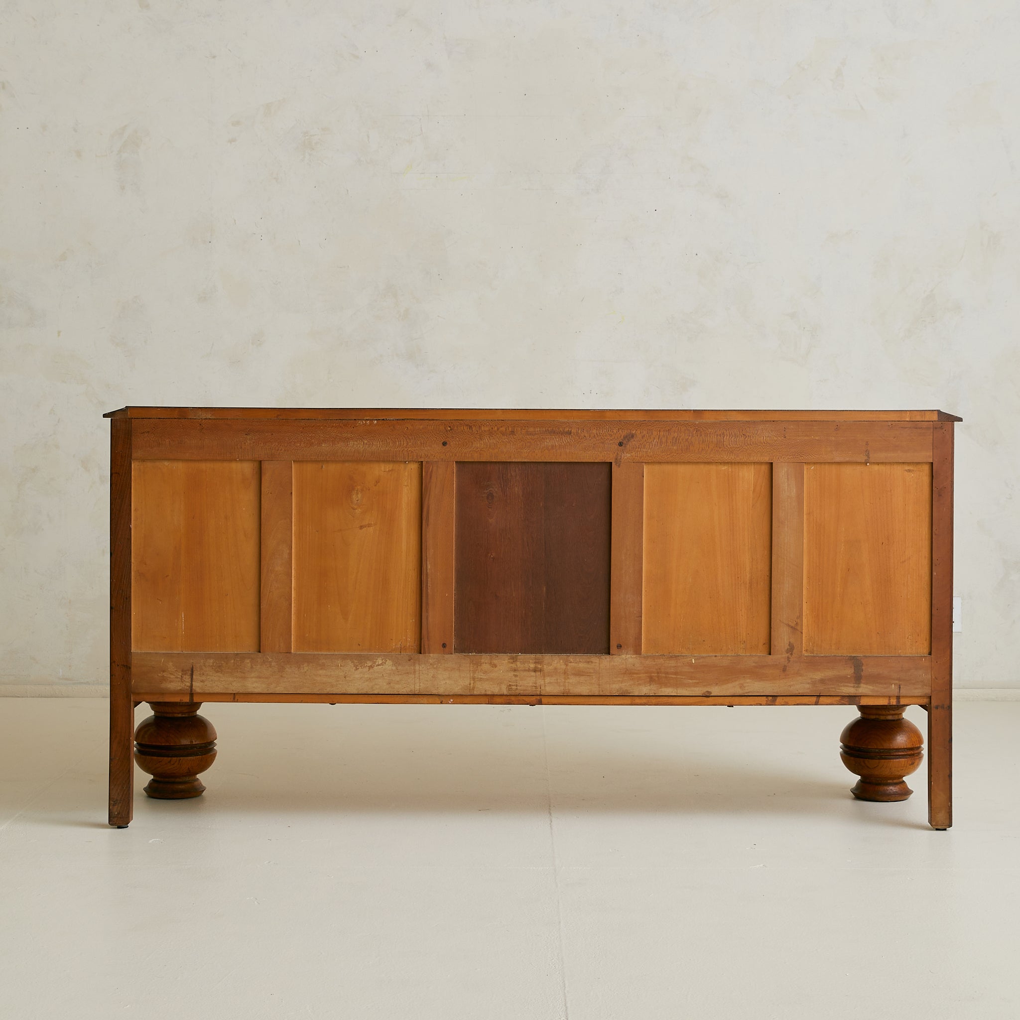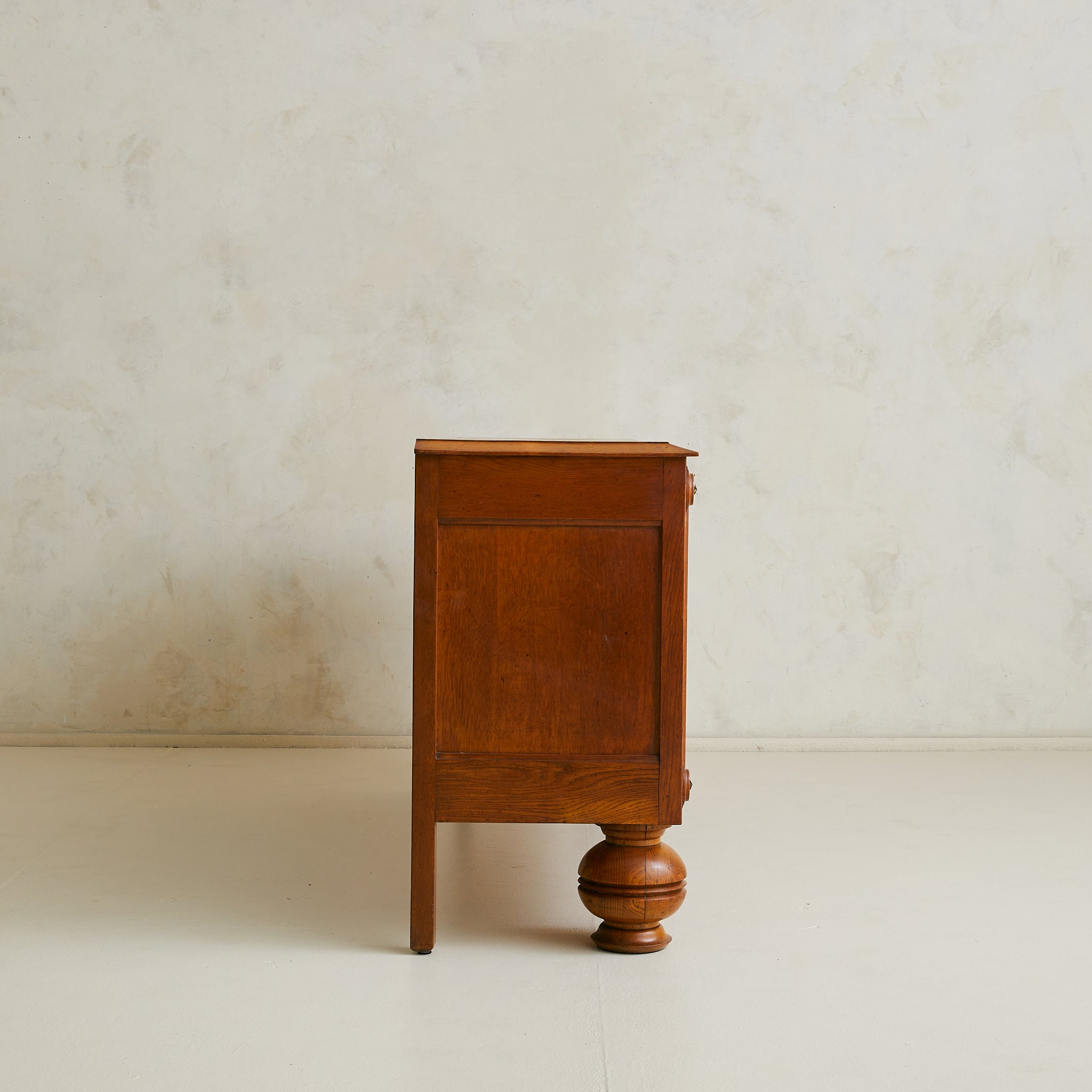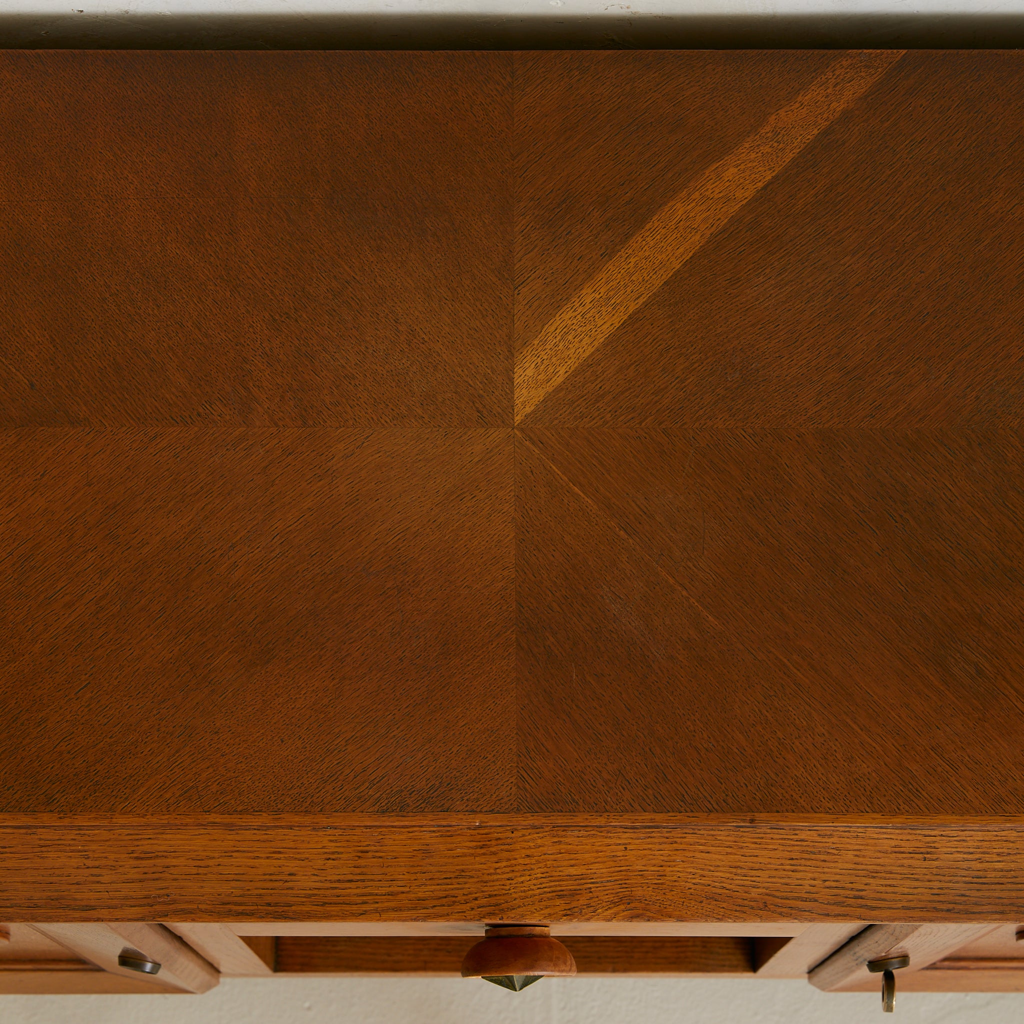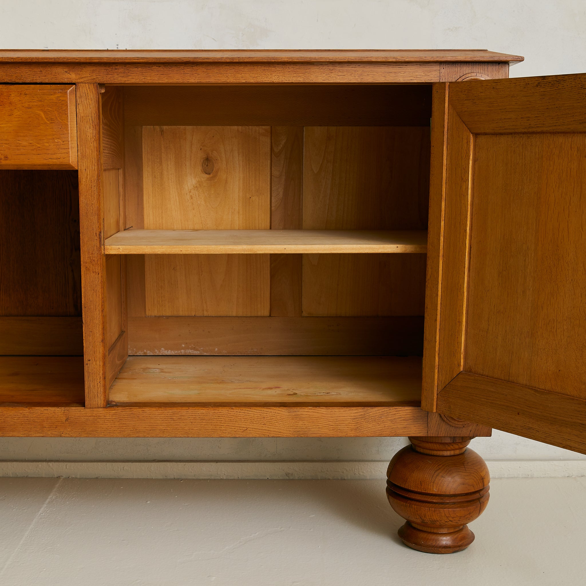 Inside, shelving offers generous storage, while the oak surface above shows a parquetry of diagonals meeting at a point. Sturdy, honest, and imbued with the spirit of mid-century French design, it makes a commanding anchor for a dining room or living space.