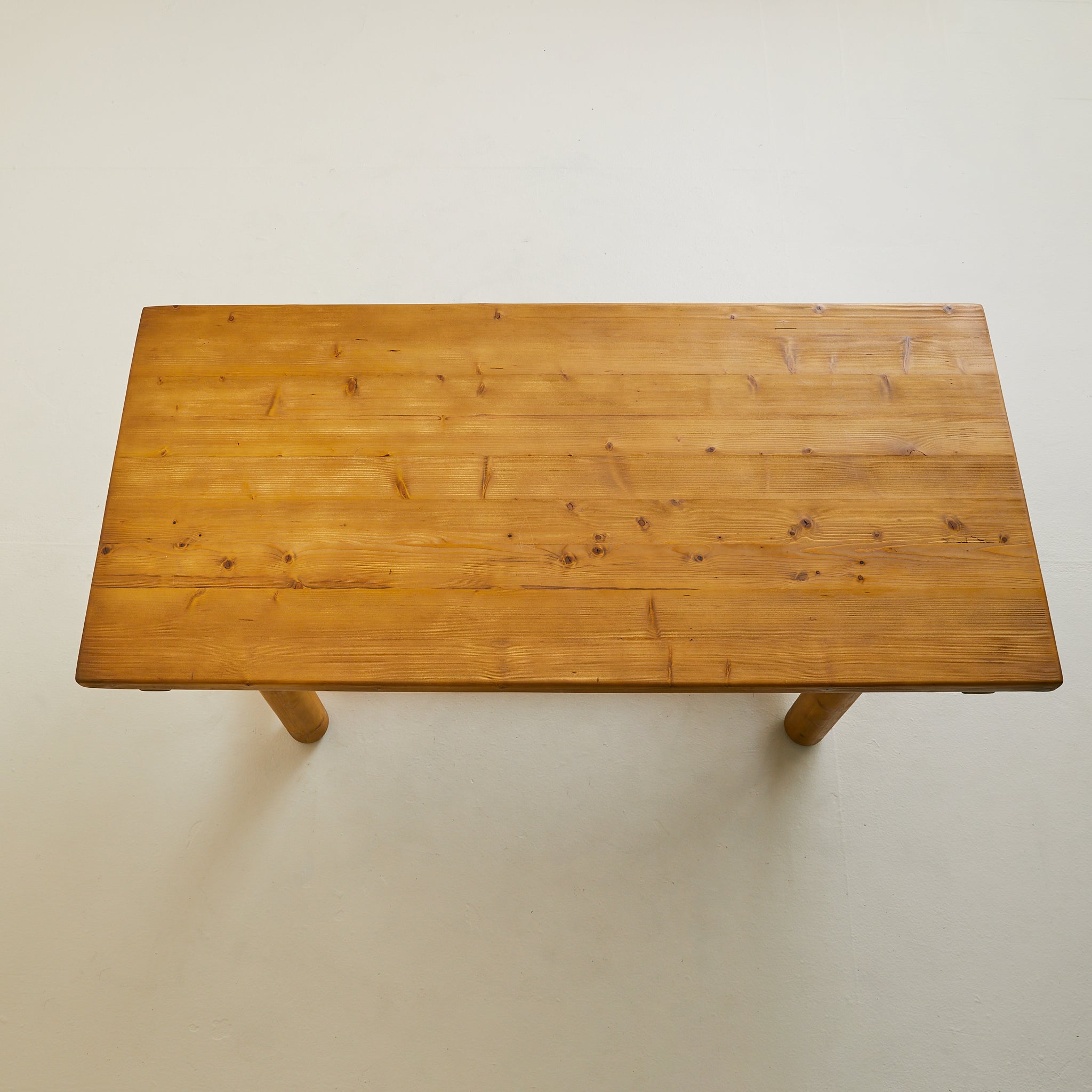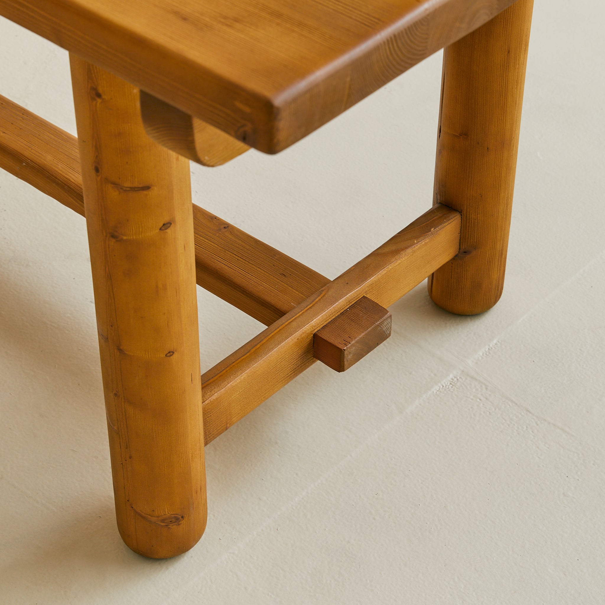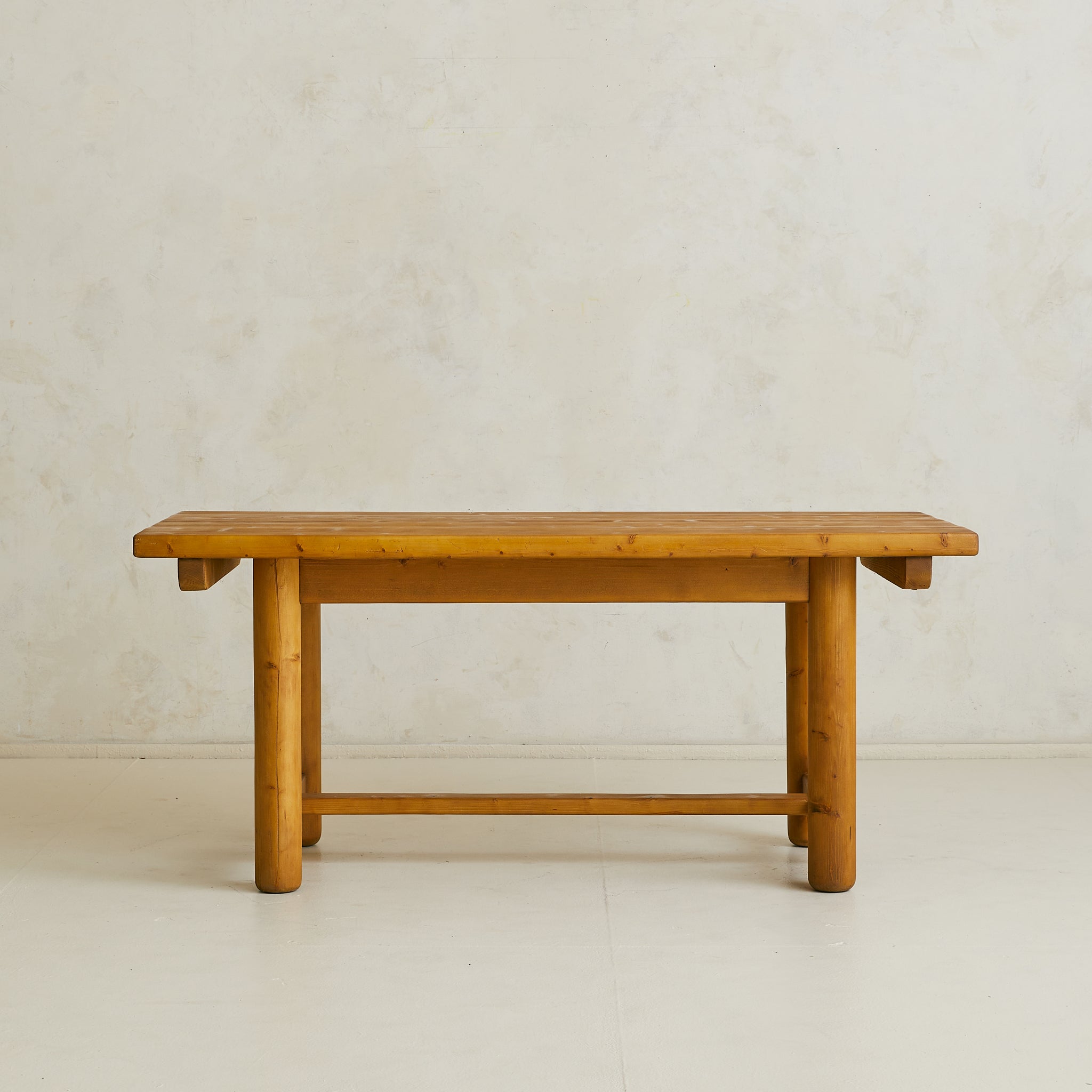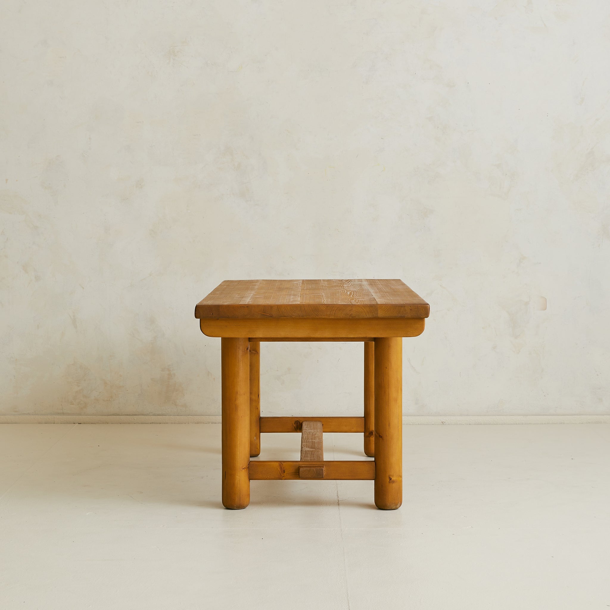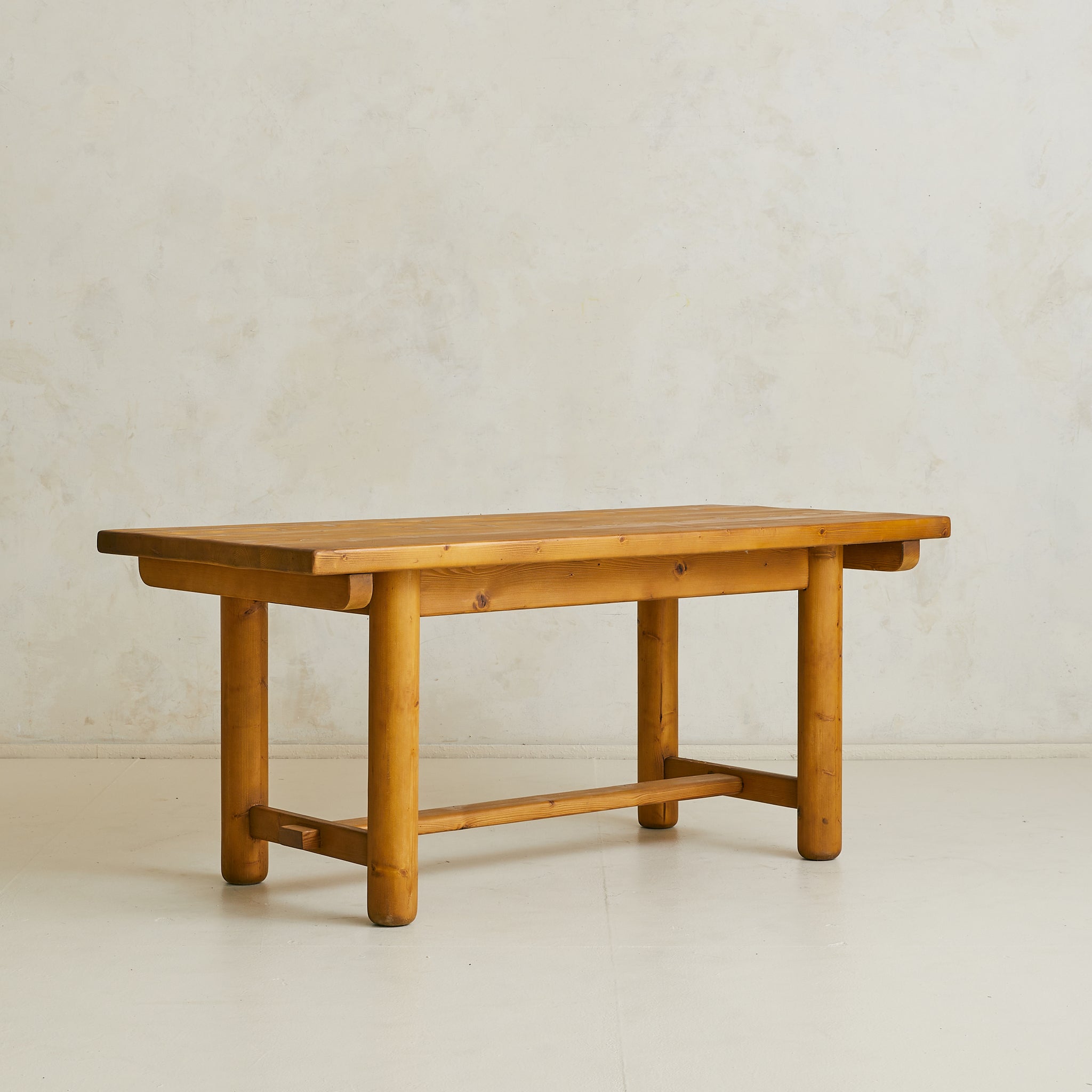 A French dining table from the 1970s, crafted in solid pine. The rectangular top rests on cylindrical legs, joined by stretcher bars that emphasize the table’s architectural form. Visible joinery and the warm honeyed tone of the wood highlight its straightforward construction, while the natural knots and grain lend texture and character.