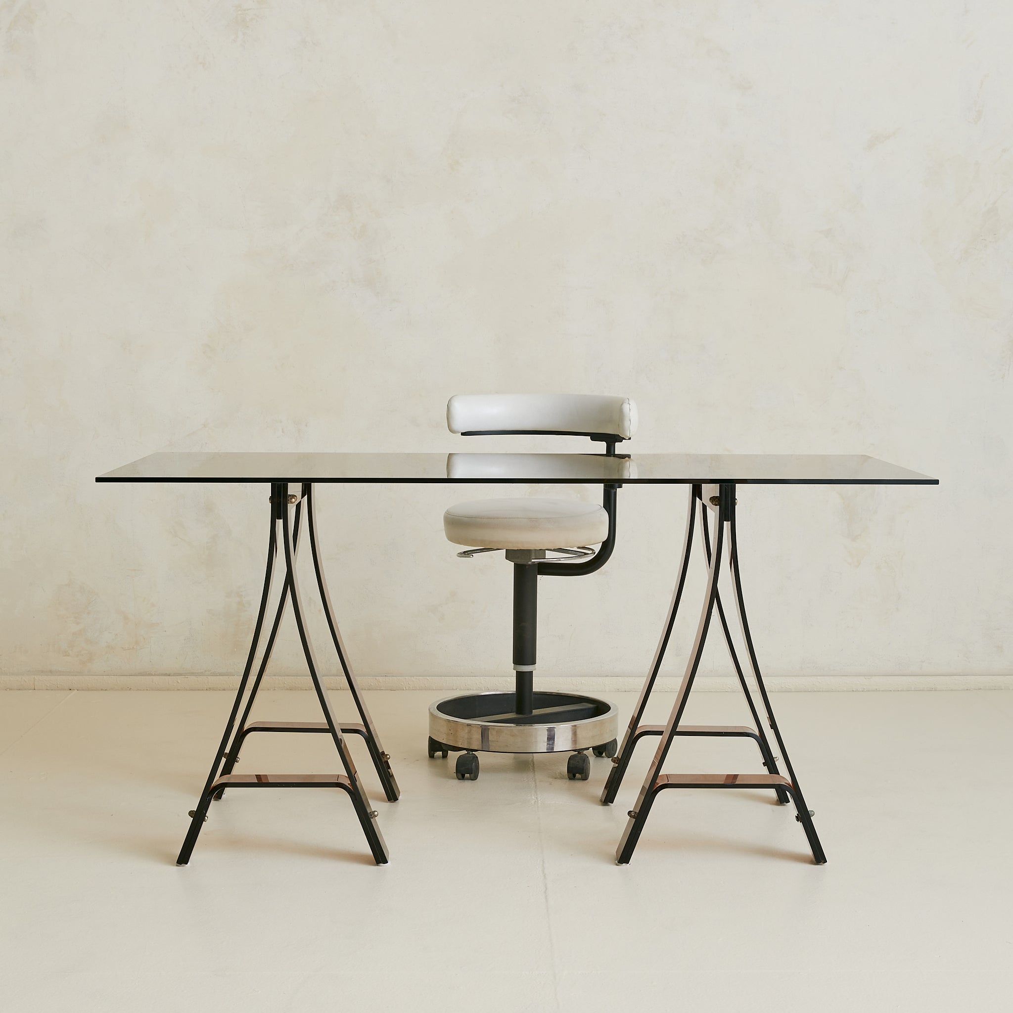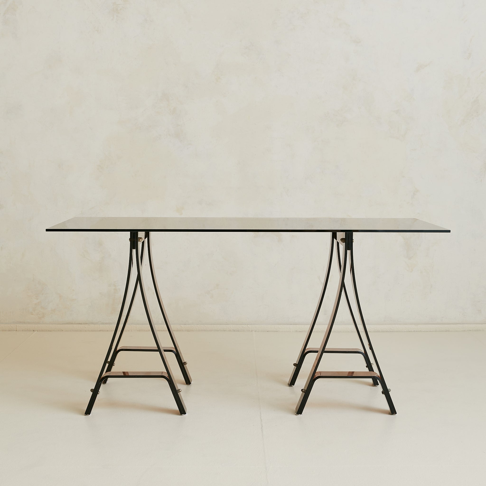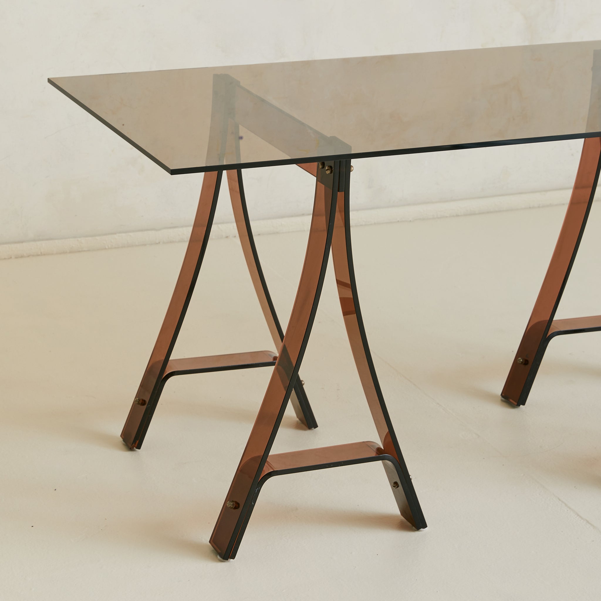 A sculptural French desk from the 1970s, attributed to Marcello Gacita and Pierre Tiberi. The twin trestle bases, crafted from smoked plexiglass, curve upward with a fluid, architectural rhythm, their forms anchored by circular chrome fittings. A rectangular smoked glass top rests above, seeming to float weightlessly to emphasize the base’s transparency and line.