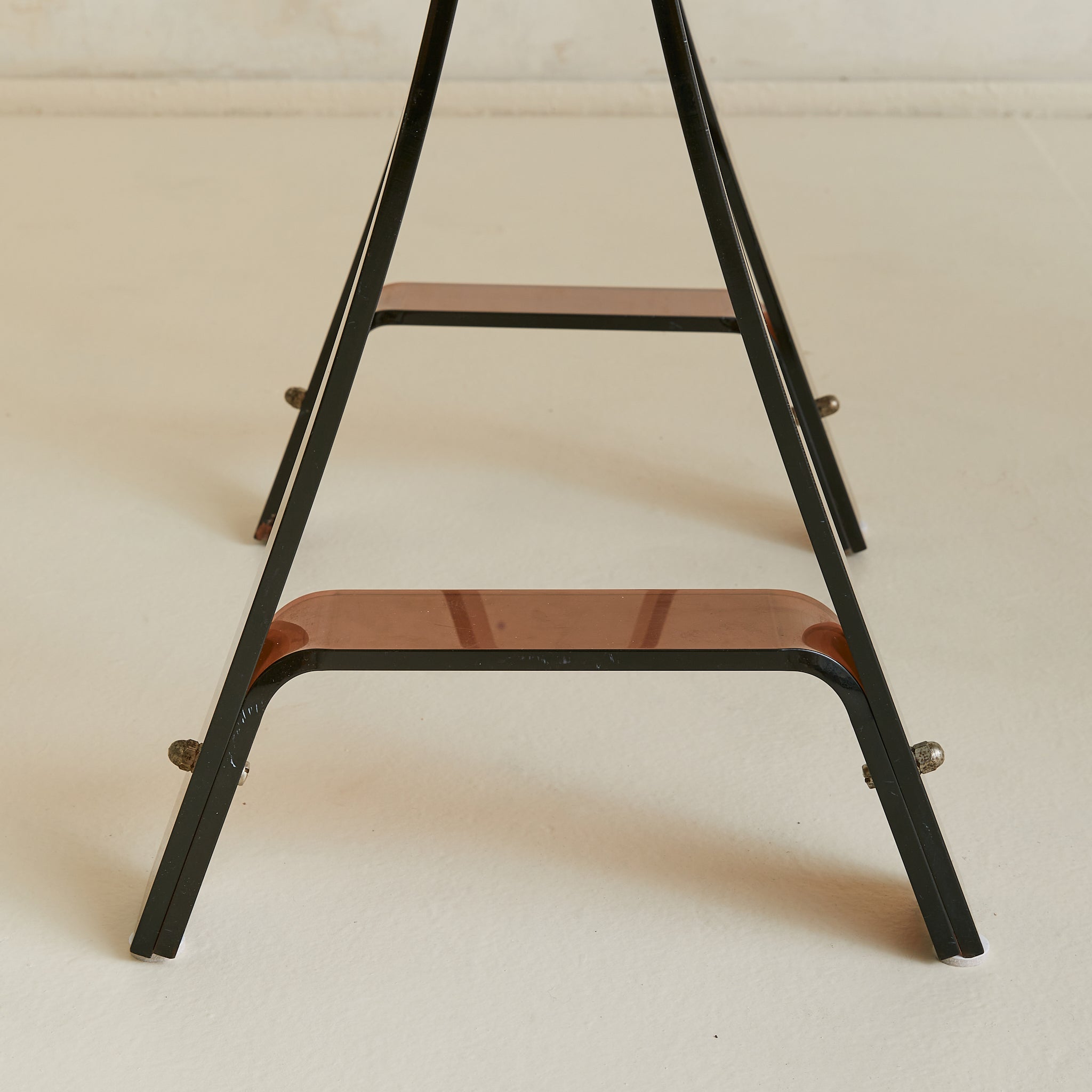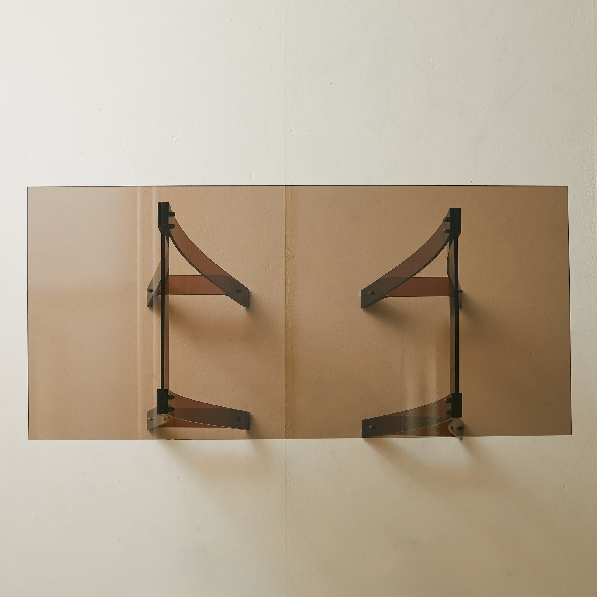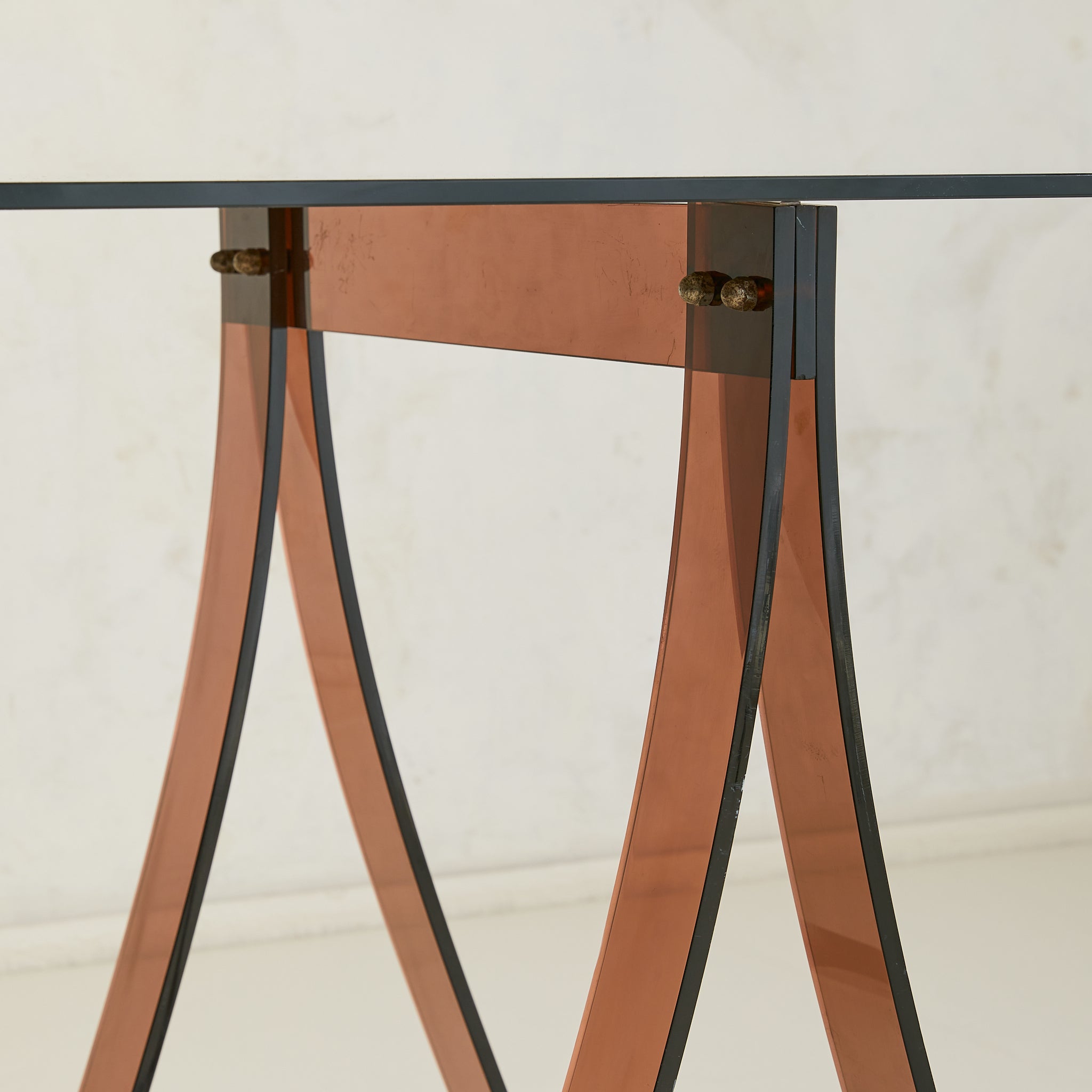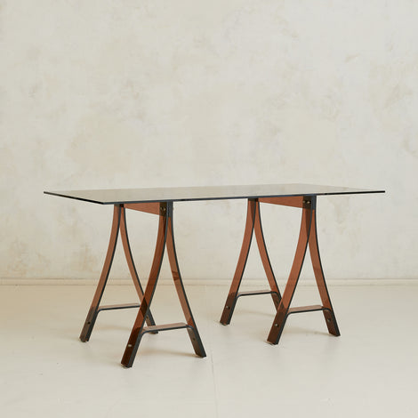A sculptural French desk from the 1970s, attributed to Marcello Gacita and Pierre Tiberi. The twin trestle bases, crafted from smoked plexiglass, curve upward with a fluid, architectural rhythm, their forms anchored by circular chrome fittings. A rectangular smoked glass top rests above, seeming to float weightlessly to emphasize the base’s transparency and line.