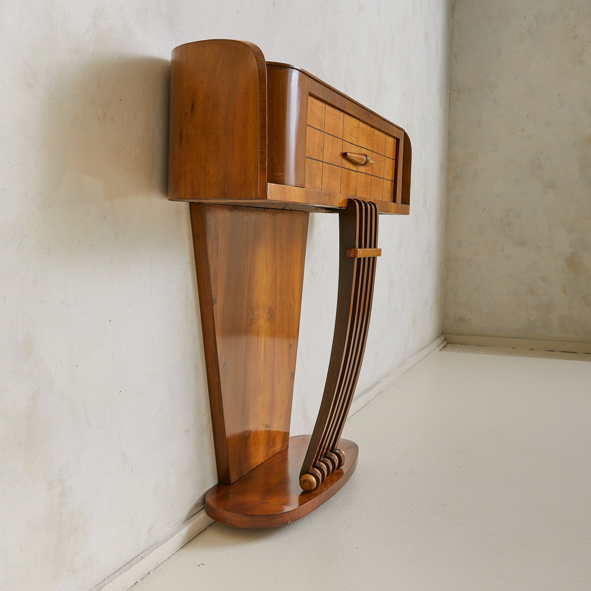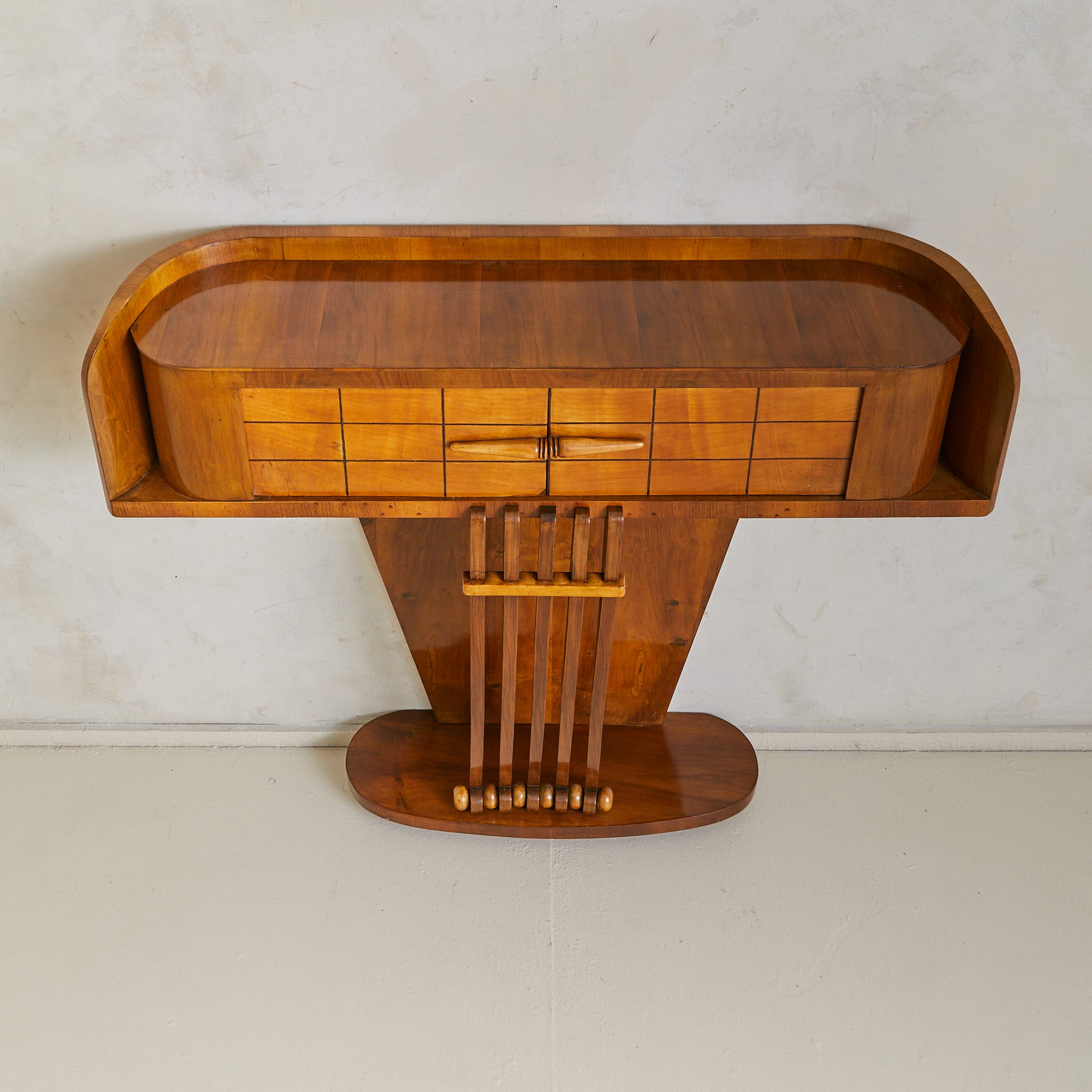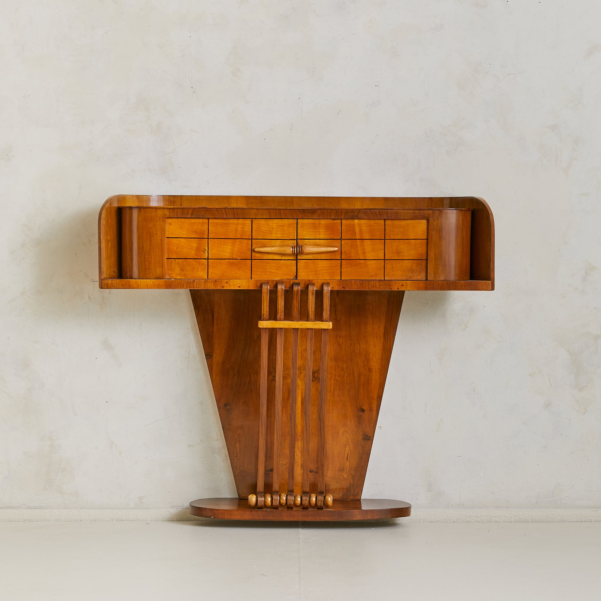 A 1930s Italian Art Deco wall-mounted console in maple and walnut, with contrasting inlays drawing a geometric grid across the two cabinet doors. Each opens with a sculpted wooden knob, subtly echoing the curves below. The silhouette is striking—rounded corners above, tapering to a dramatic fan-shaped back and anchored by a sculptural row of doweled supports on an elliptical plinth.
