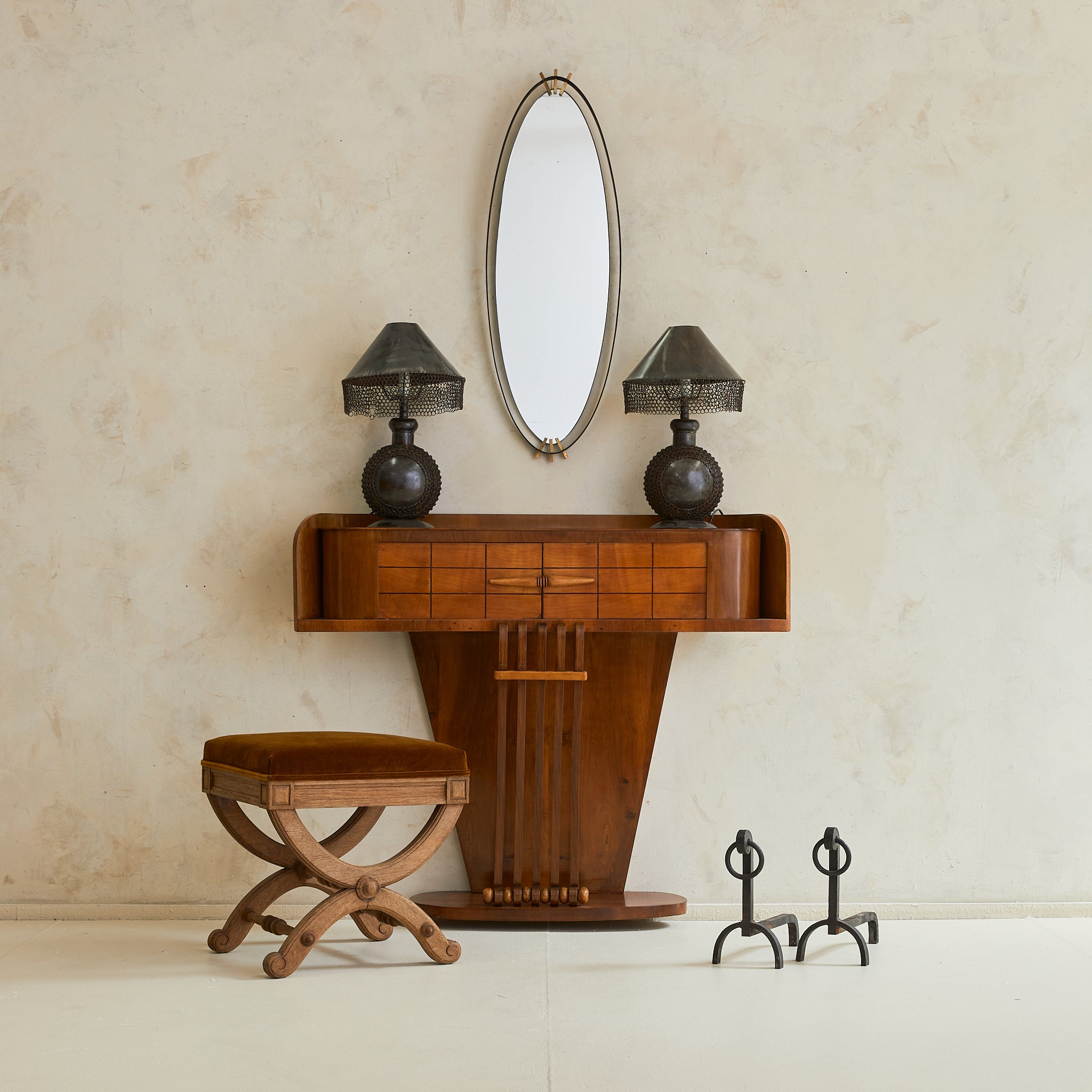 Its lyrical symmetry and warm tone speak to the era’s craftsmanship while feeling quietly modern. At four feet wide, it makes an elegant statement in an entryway or beneath a mirror.
