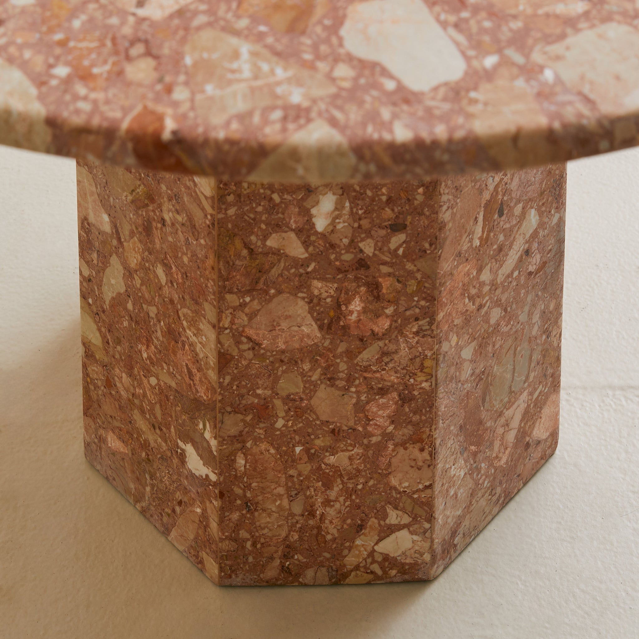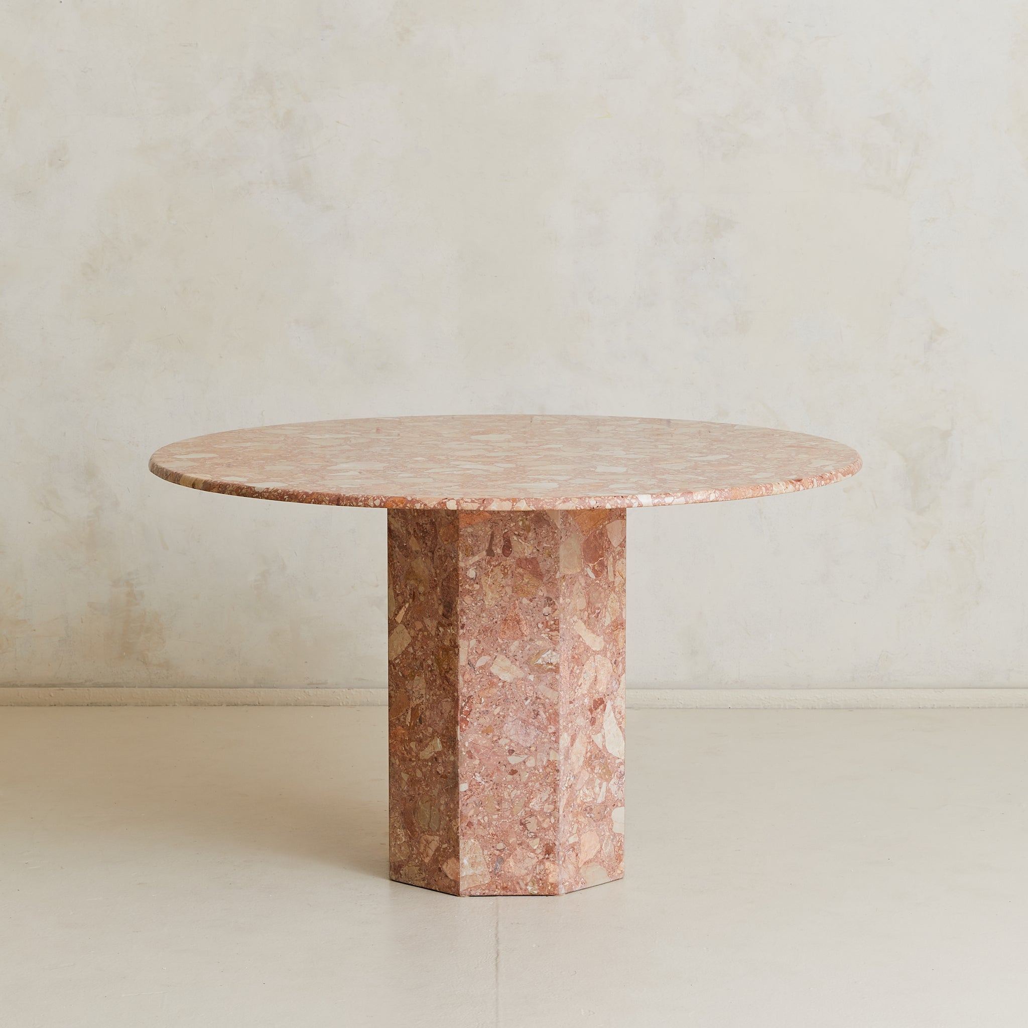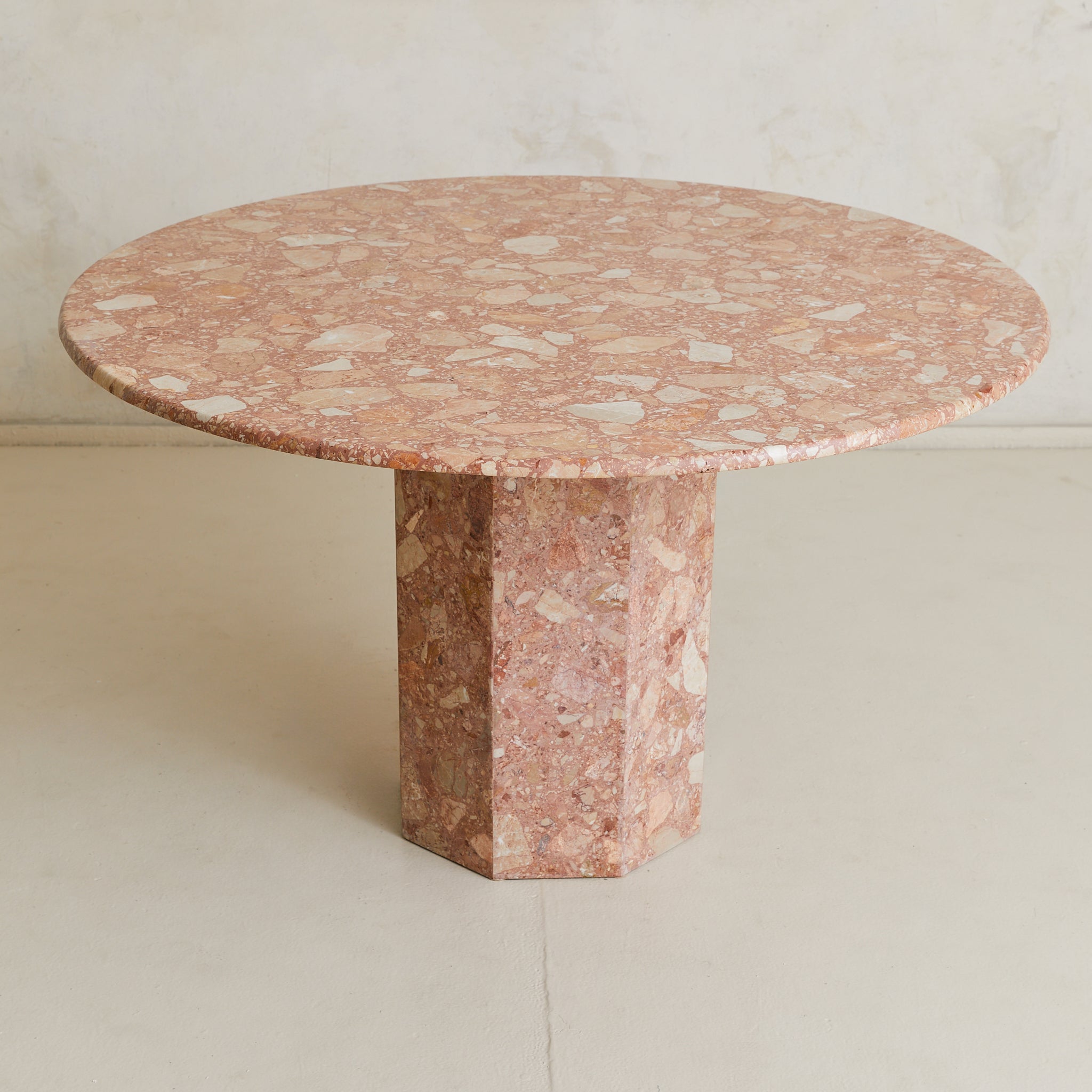 An Italian dining table from the 1970s, crafted entirely in Breccia Pernice marble. The round top rests on a hexagonal pedestal base, its surfaces alive with the fractured poetry of breccia—rose and terracotta veined with ivory and ochre, each piece suspended in a natural mosaic.