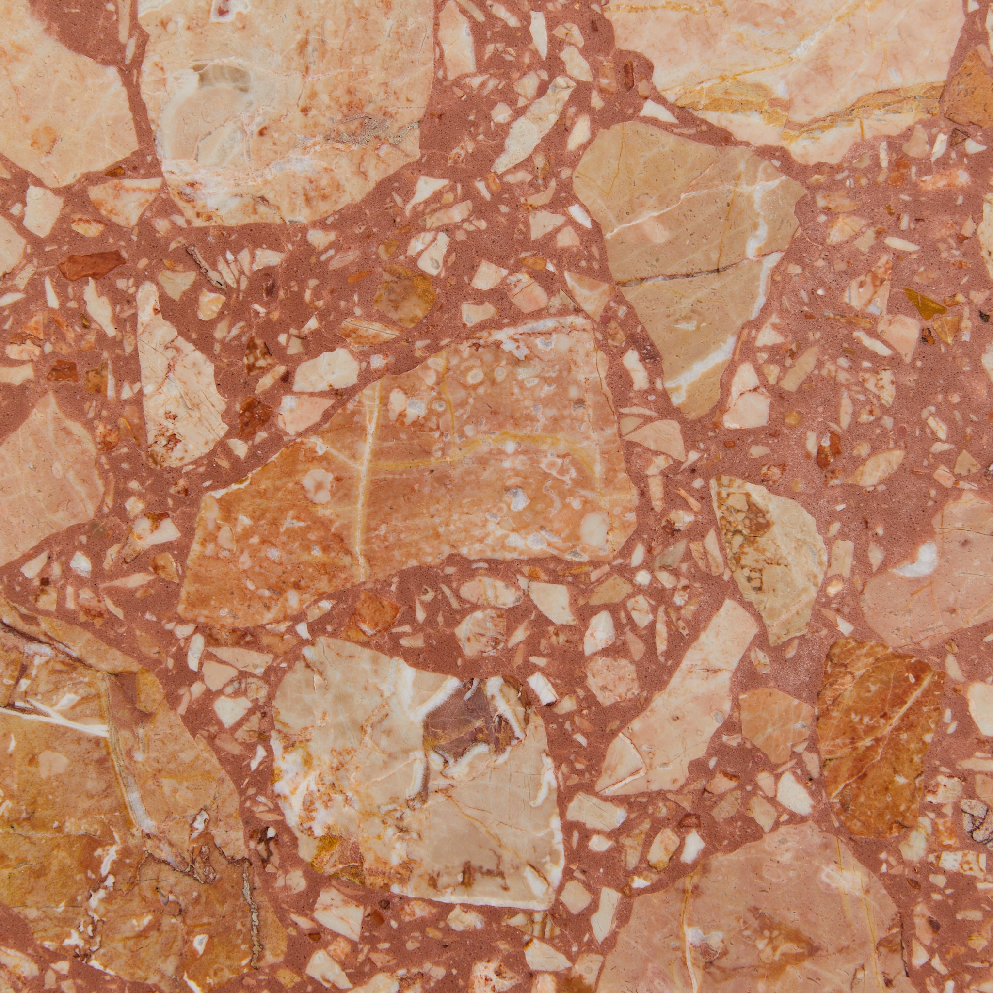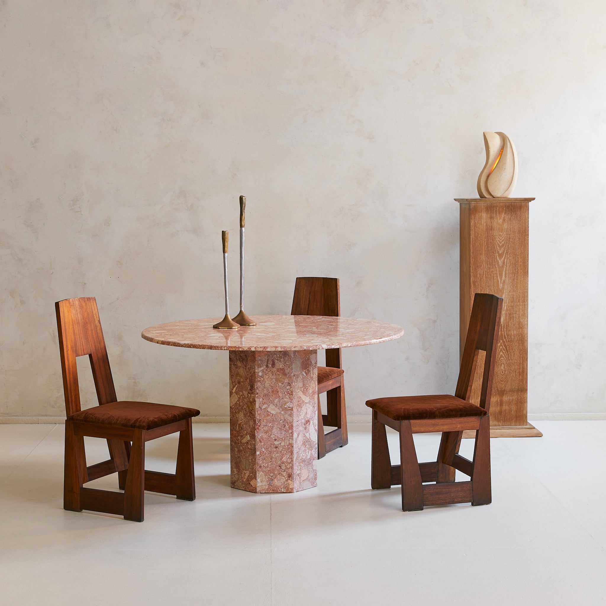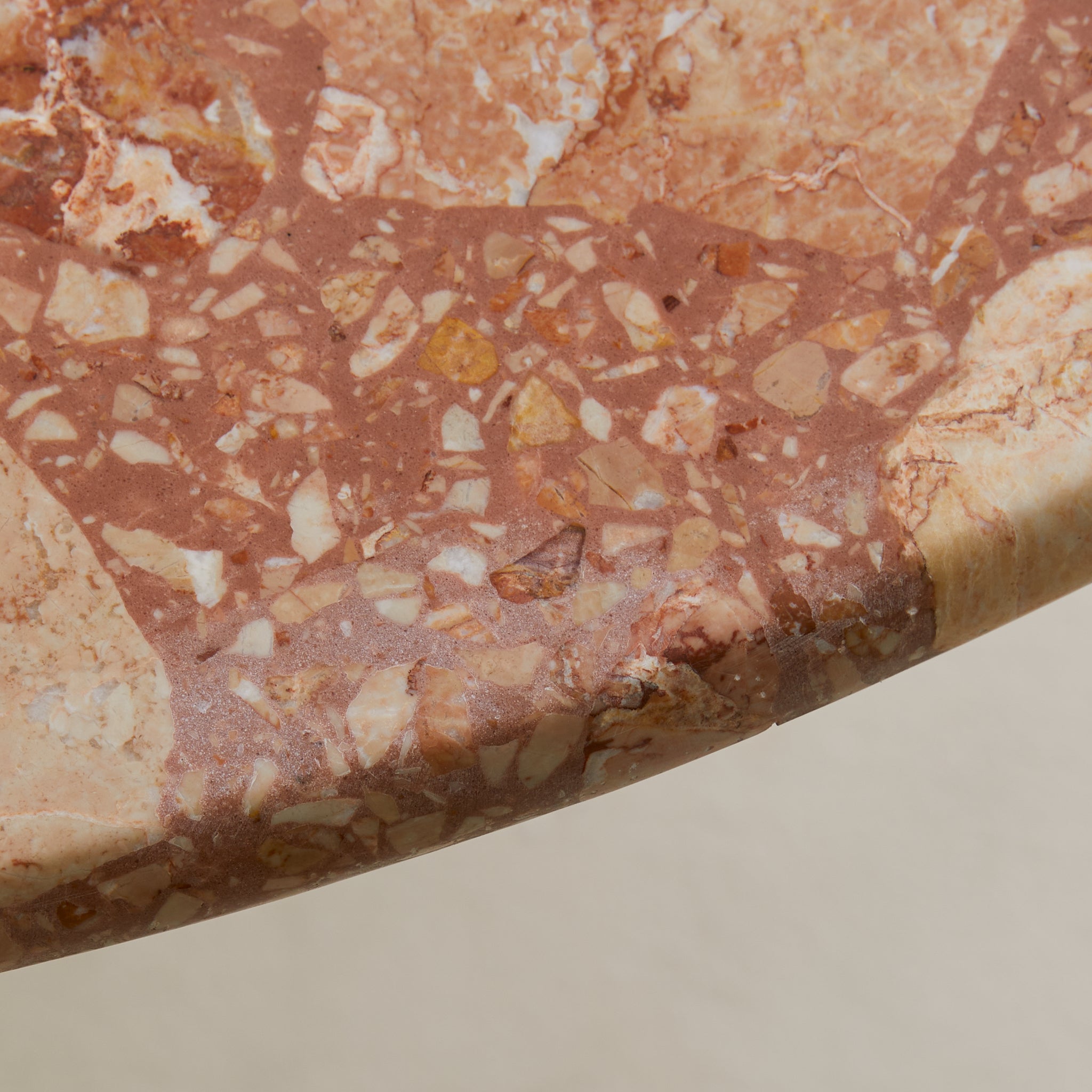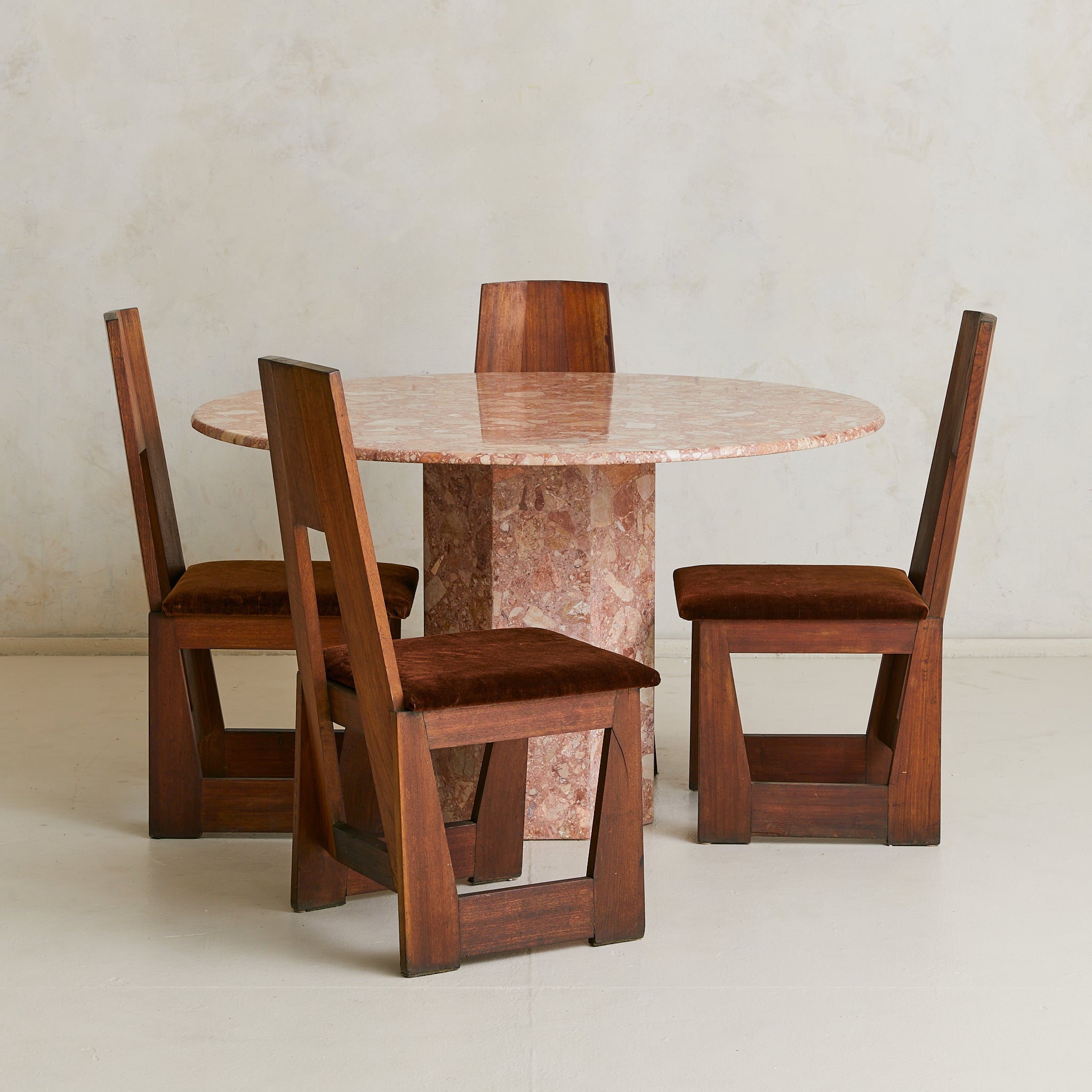 An Italian dining table from the 1970s, crafted entirely in Breccia Pernice marble. The round top rests on a hexagonal pedestal base, its surfaces alive with the fractured poetry of breccia—rose and terracotta veined with ivory and ochre, each piece suspended in a natural mosaic.