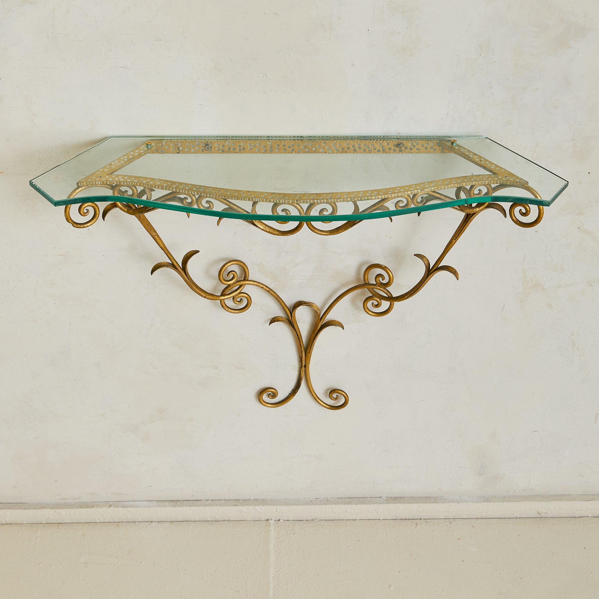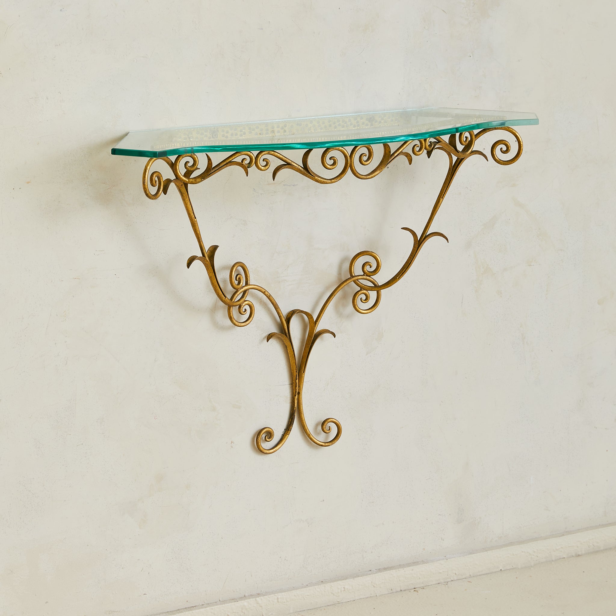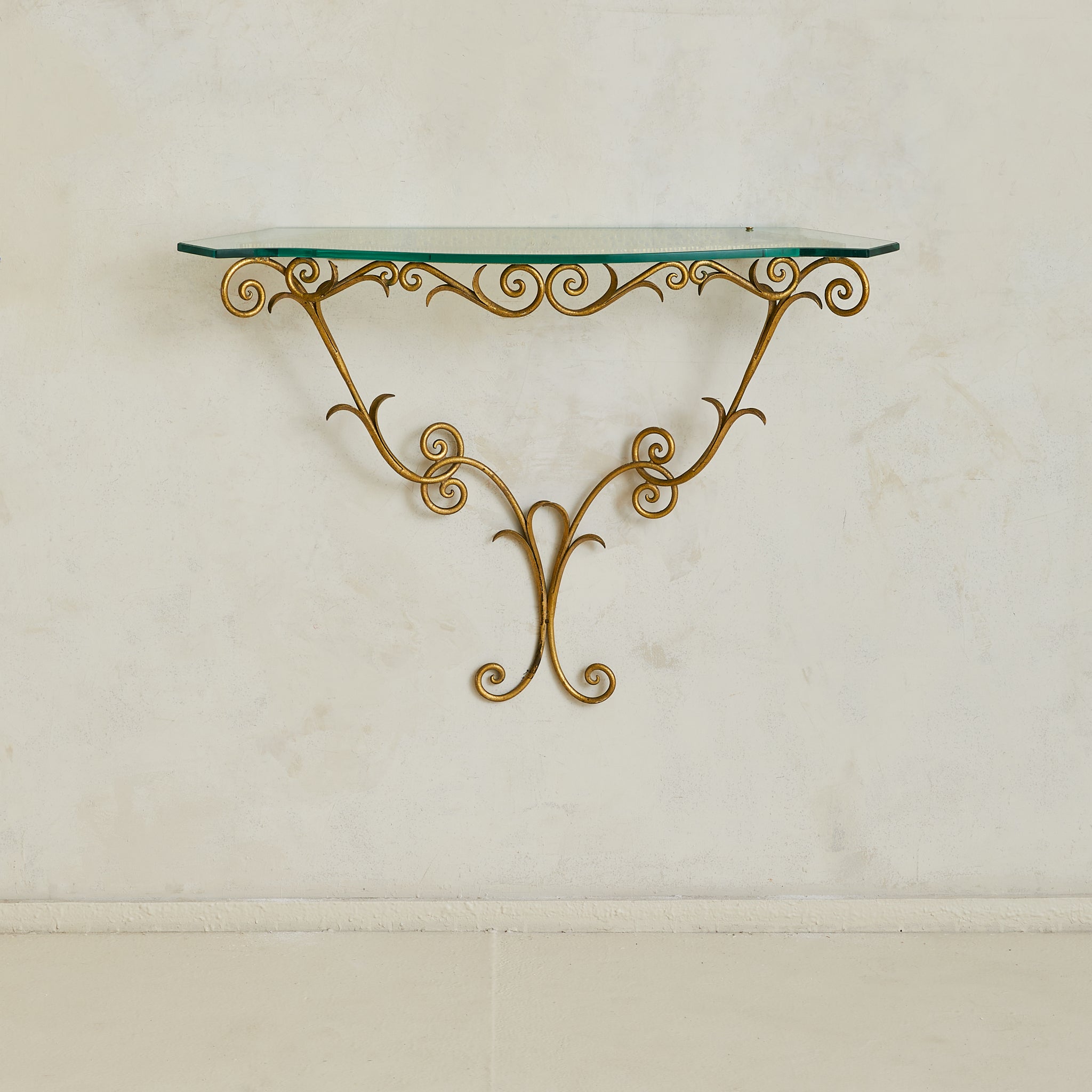 An Italian wall-mounted console from the 1950s, in the manner of Pier Luigi Colli. The frame is forged in gilt iron, its scrolling supports worked into symmetrical curves. The surface carries a timeworn patina, the gilding catching light across raised edges and softened recesses.