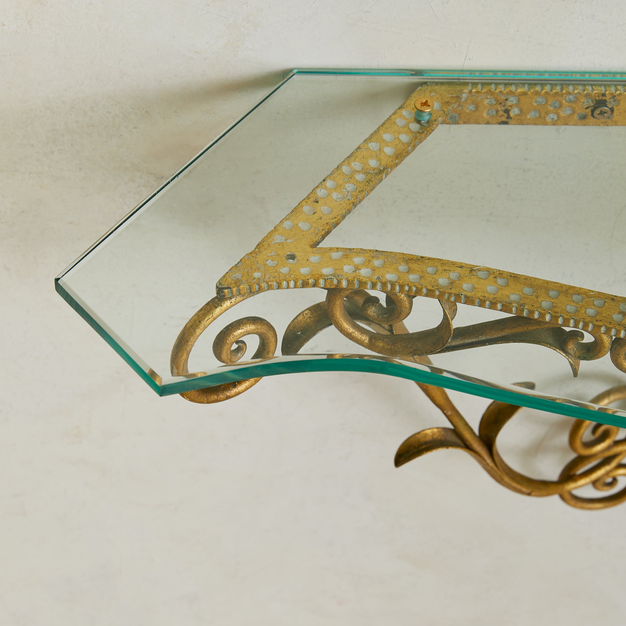 Above, a thick glass top rests with a subtle bevel, bordered by a pierced gilt apron that echoes the ironwork below. Modest in scale, the piece fits seamlessly in a hallway or entry.