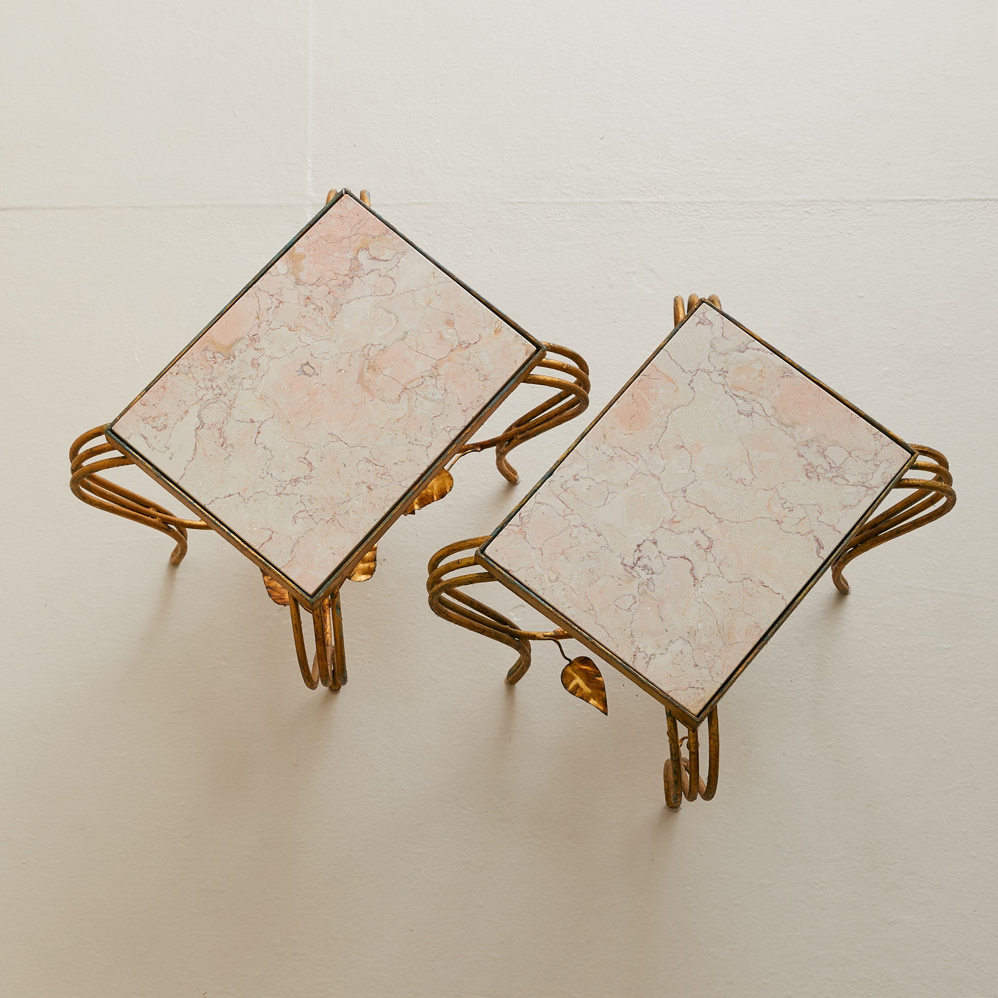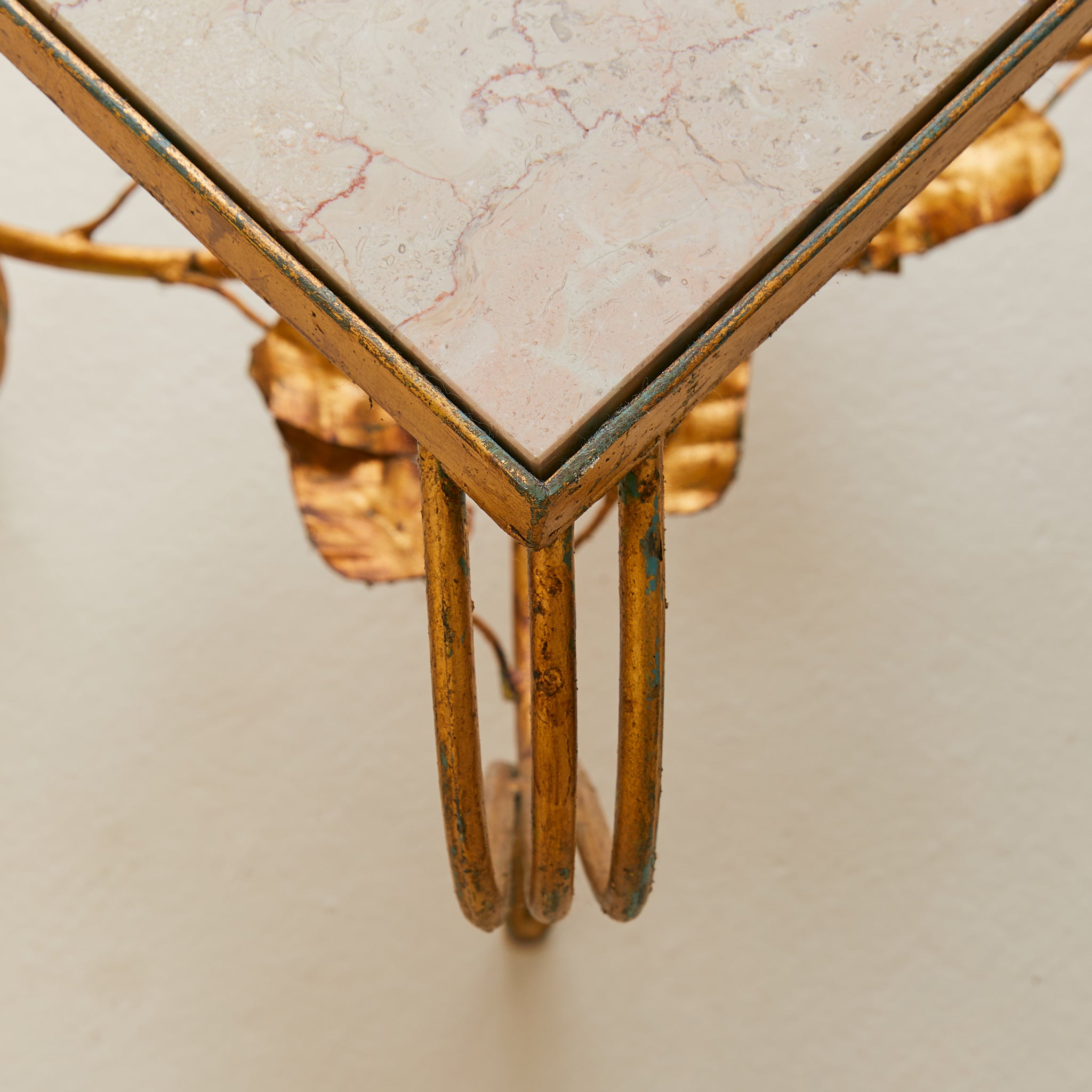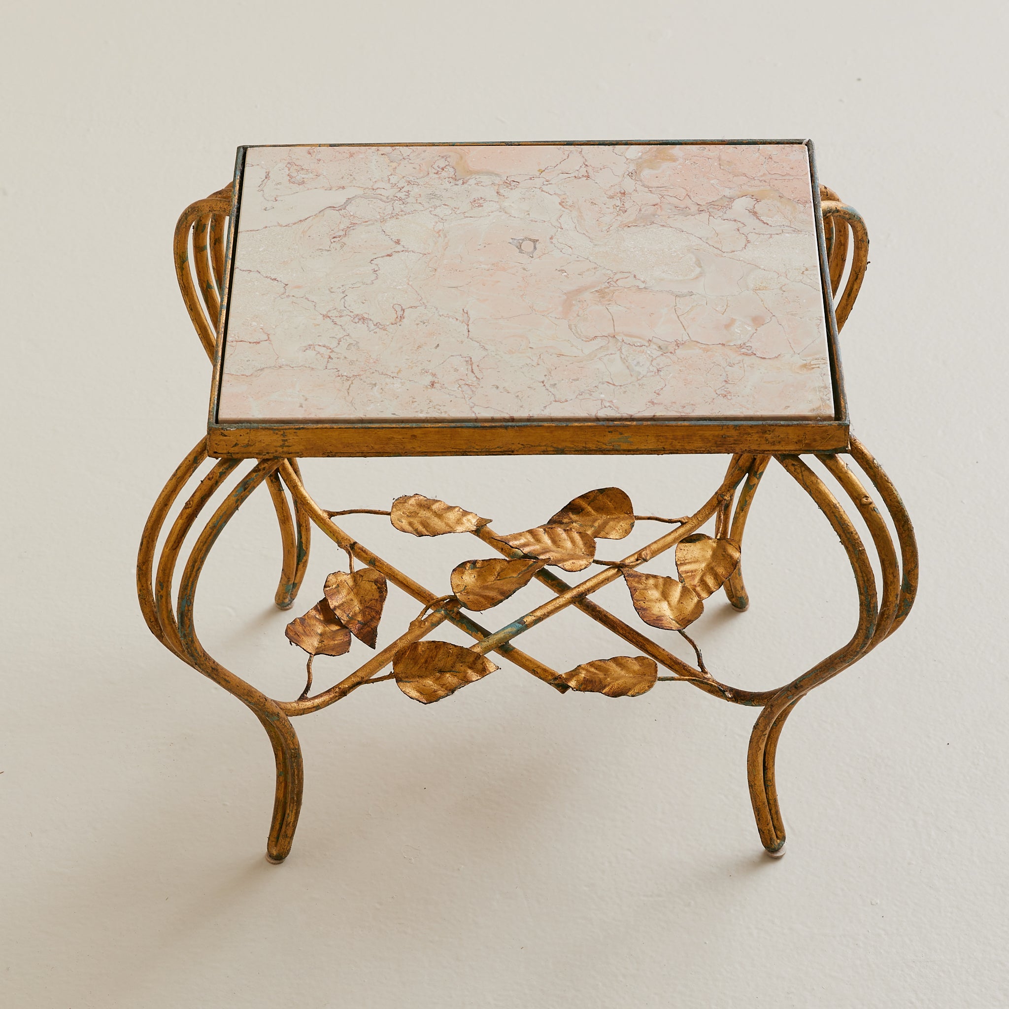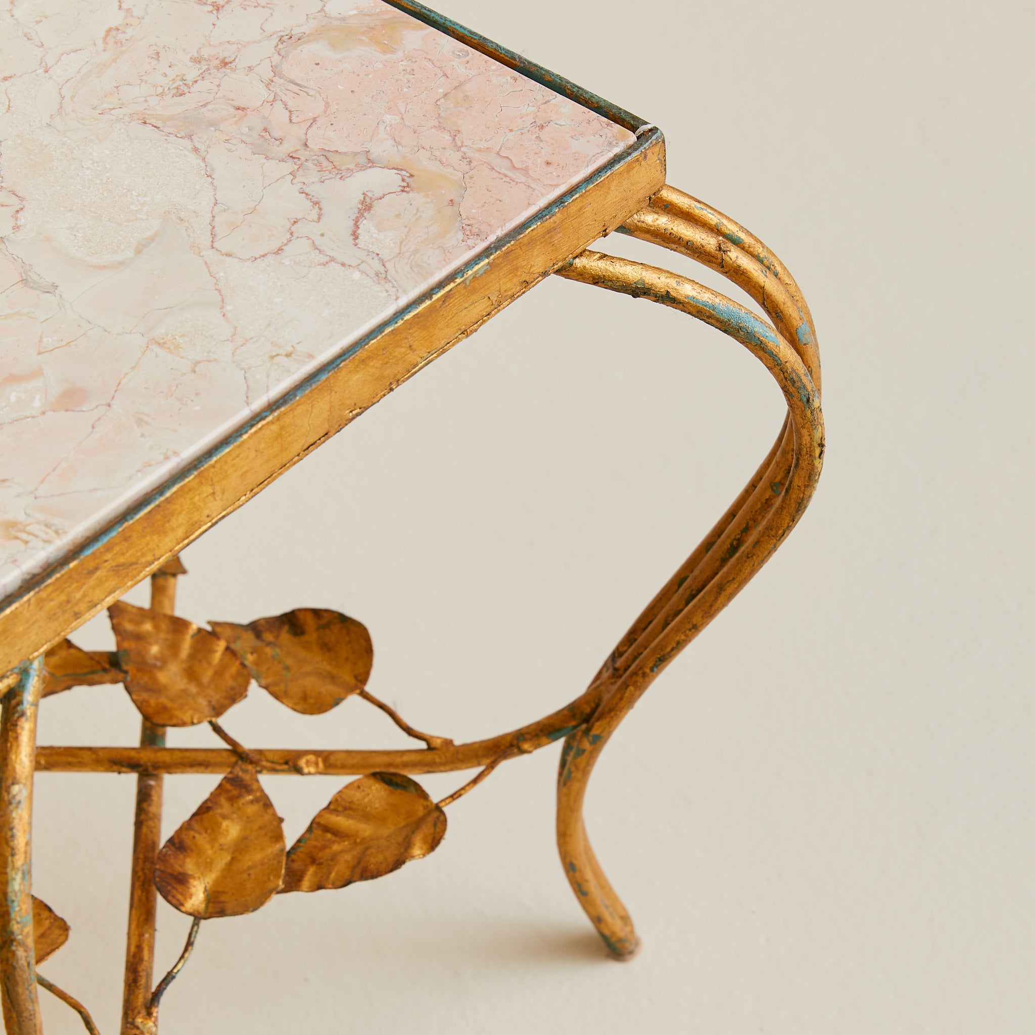An Italian accent table from the 1950s, its gilt metal frame shaped in graceful curves that taper to splayed legs. A lower stretcher is detailed with entwined leaves, the hand-formed foliage enriched by a time-worn patina and traces of verdigris. The square top is inset with blush pink marble, veined in ivory and rose, a refined contrast to the warmth of the gilded base. Elegant as a bedside, drink, or accent table.