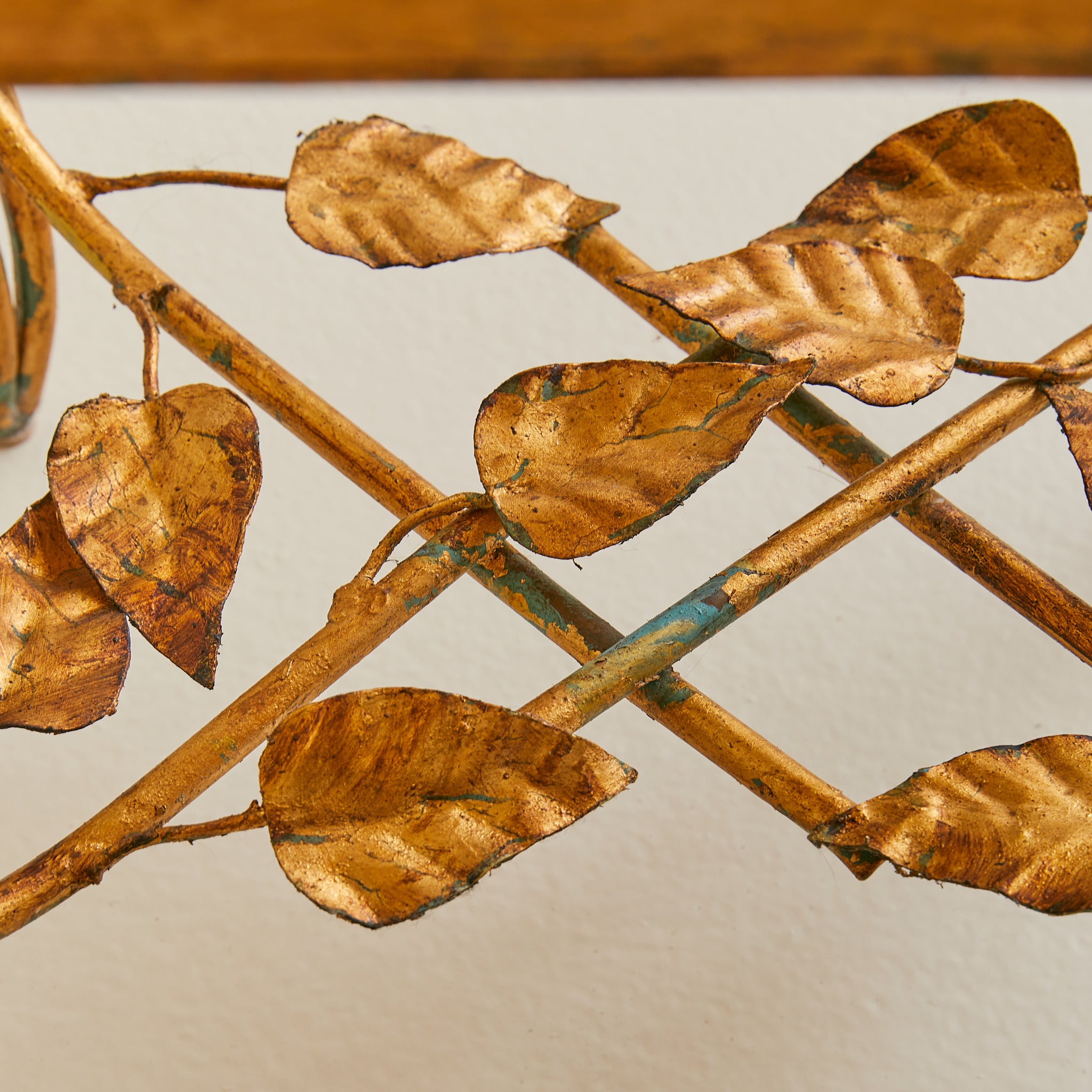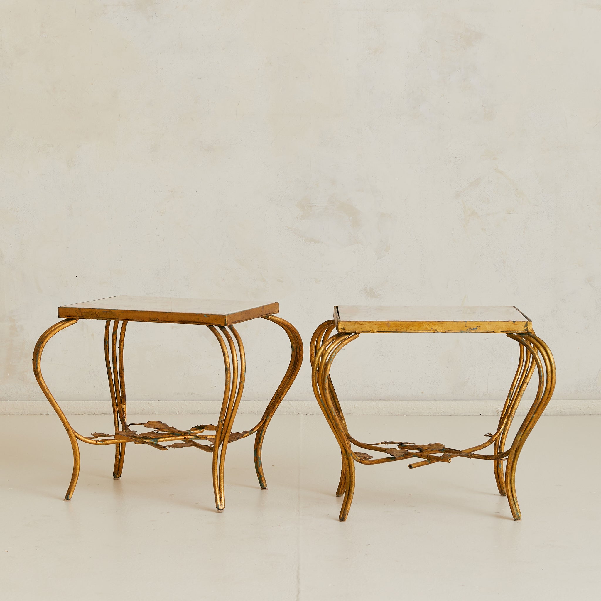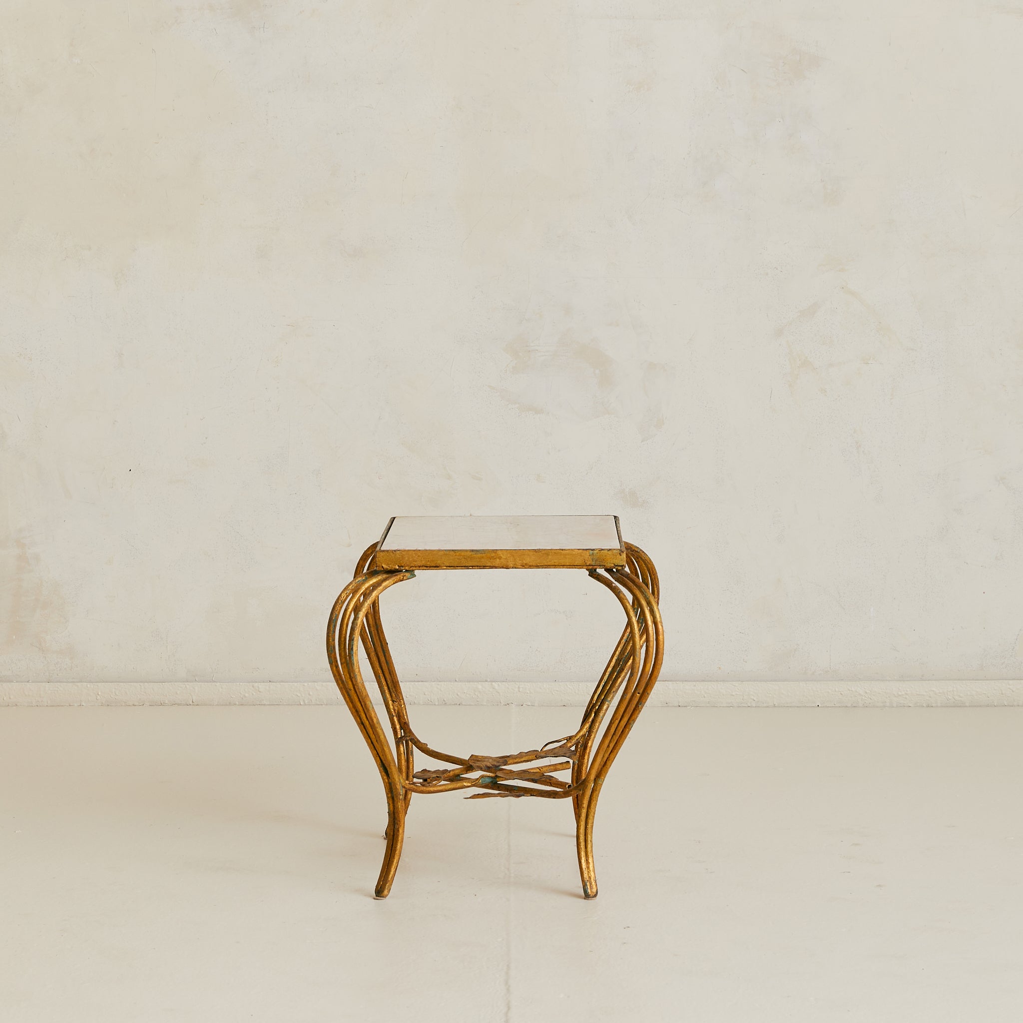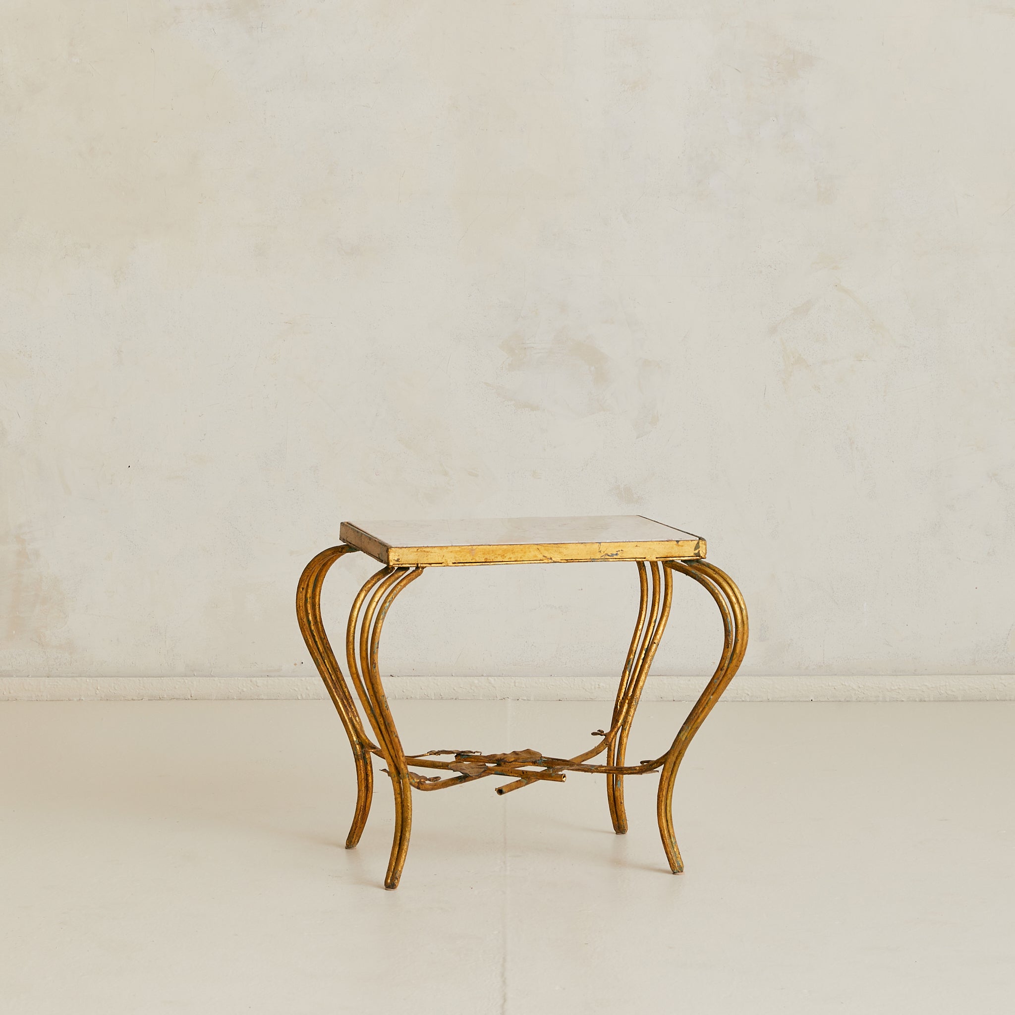 An Italian accent table from the 1950s, its gilt metal frame shaped in graceful curves that taper to splayed legs. A lower stretcher is detailed with entwined leaves, the hand-formed foliage enriched by a time-worn patina and traces of verdigris. The square top is inset with blush pink marble, veined in ivory and rose, a refined contrast to the warmth of the gilded base. Elegant as a bedside, drink, or accent table.