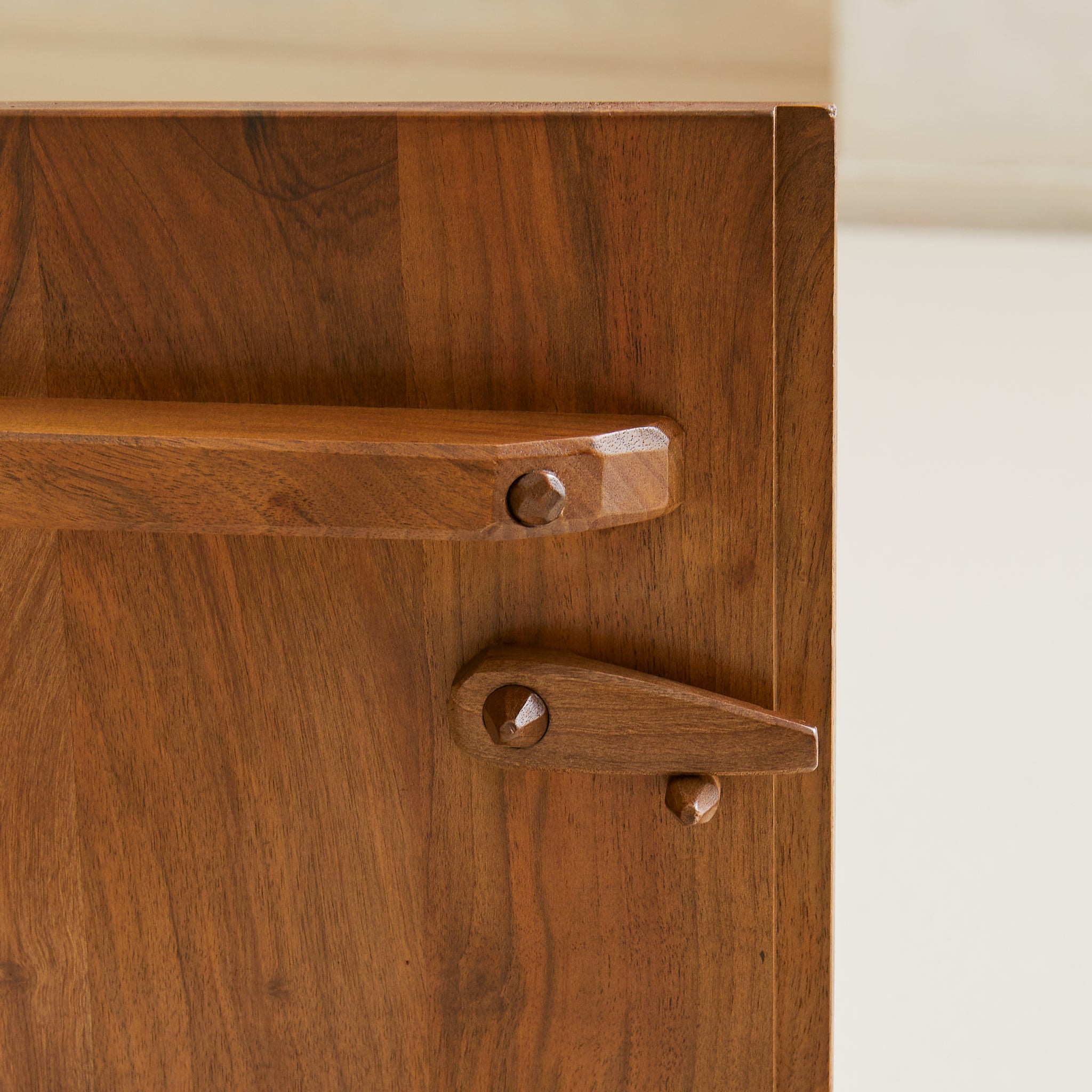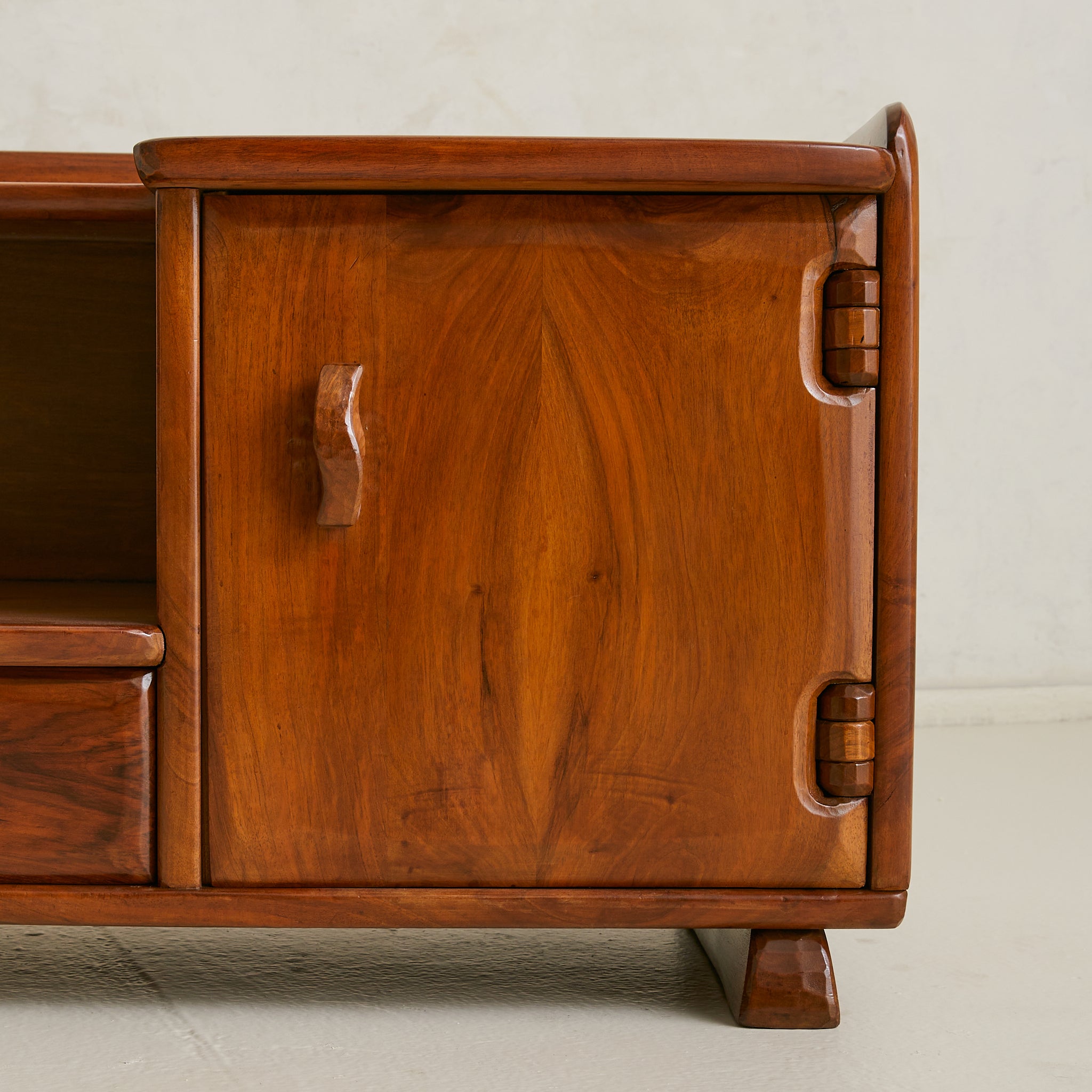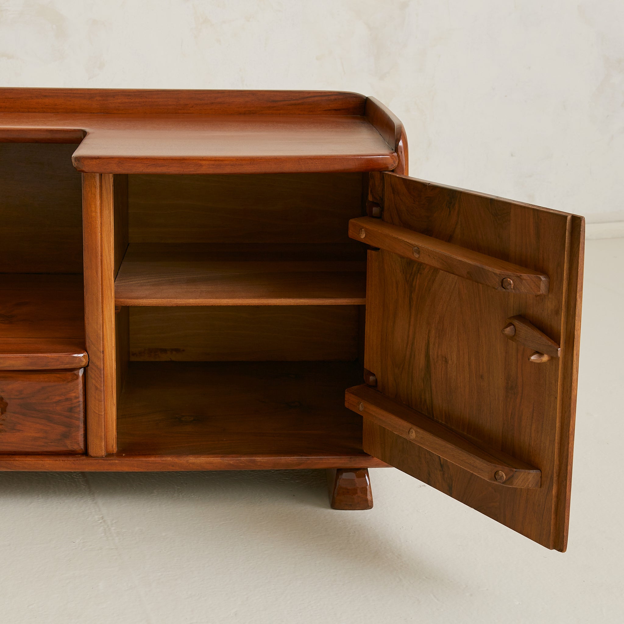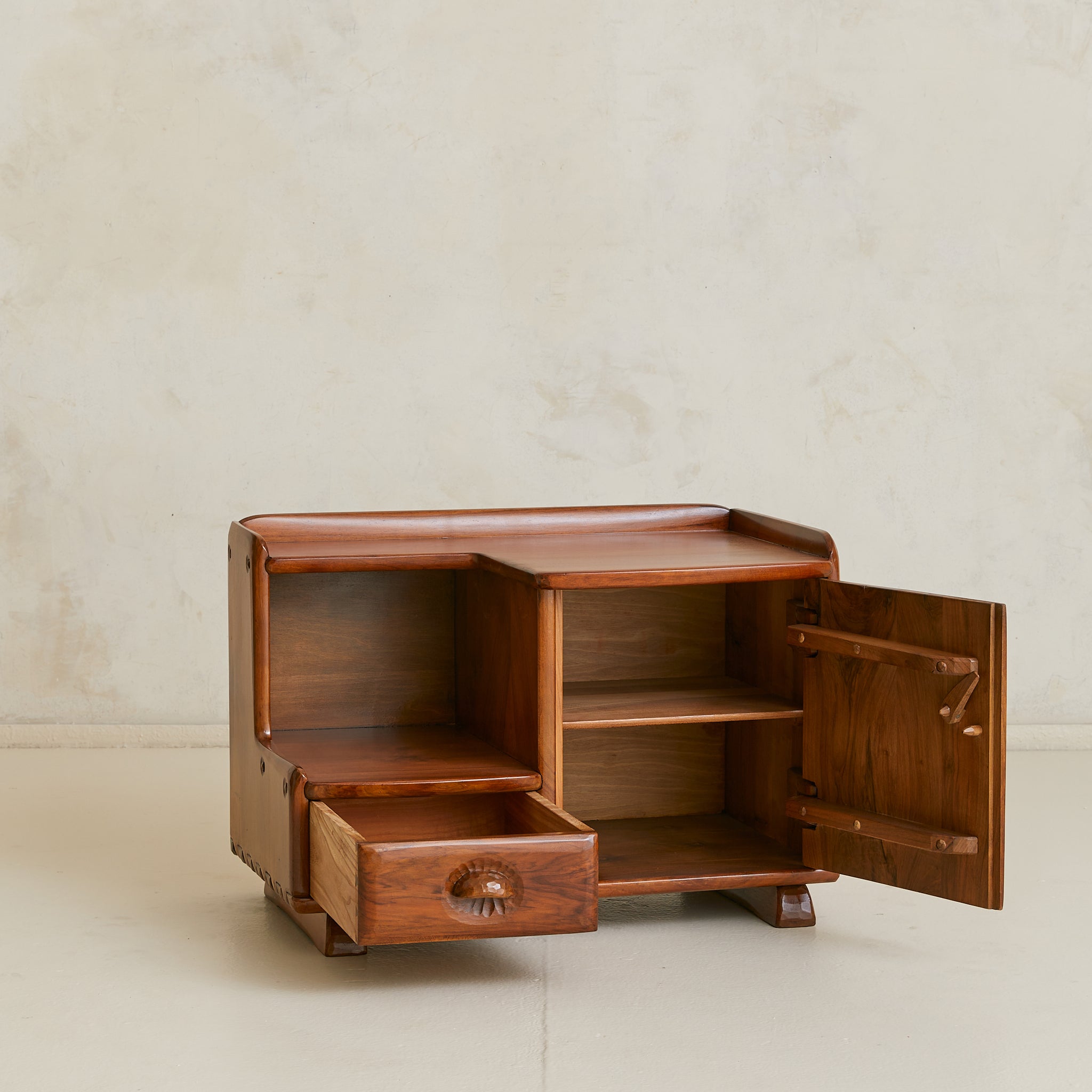 Its low, compact form combines an open shelf, a single drawer with a hand-chiseled pull, and a cupboard with carved wood hardware and exposed joinery. Rounded edges and faceted details reveal the artisanal touch, while the rich elm grain brings warmth and character.