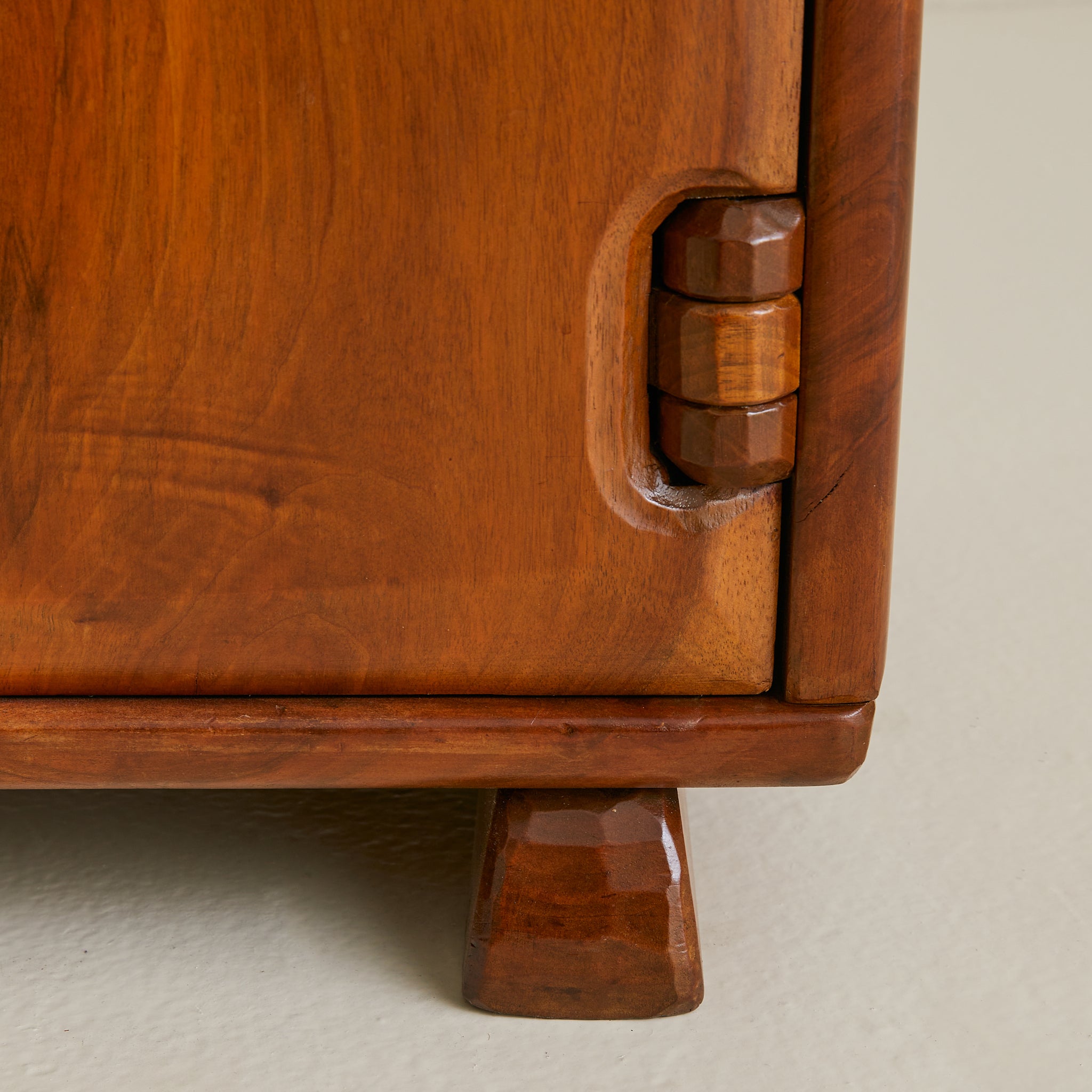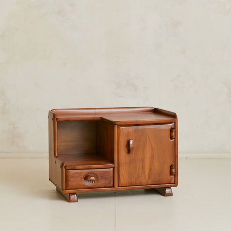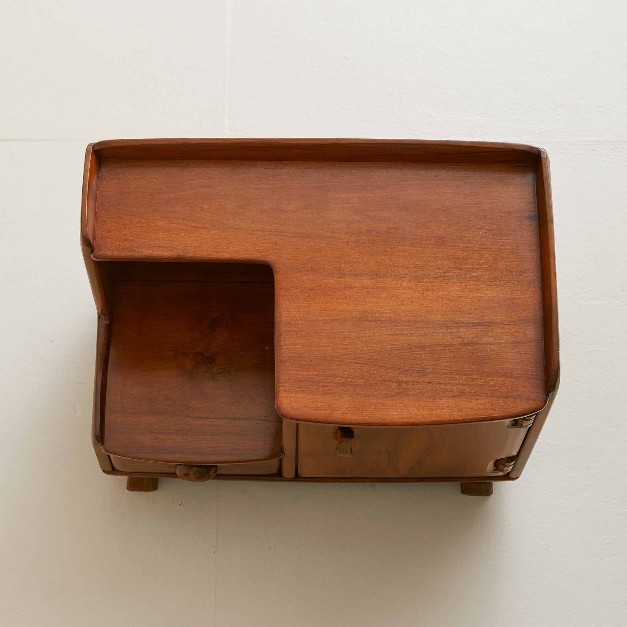 A small carved nightstand by Swiss cabinetmaker Franz Xaver Sproll, dating to the 1950s. Handcrafted in solid elm, the piece reflects Sproll’s commitment to material honesty and regional tradition.
