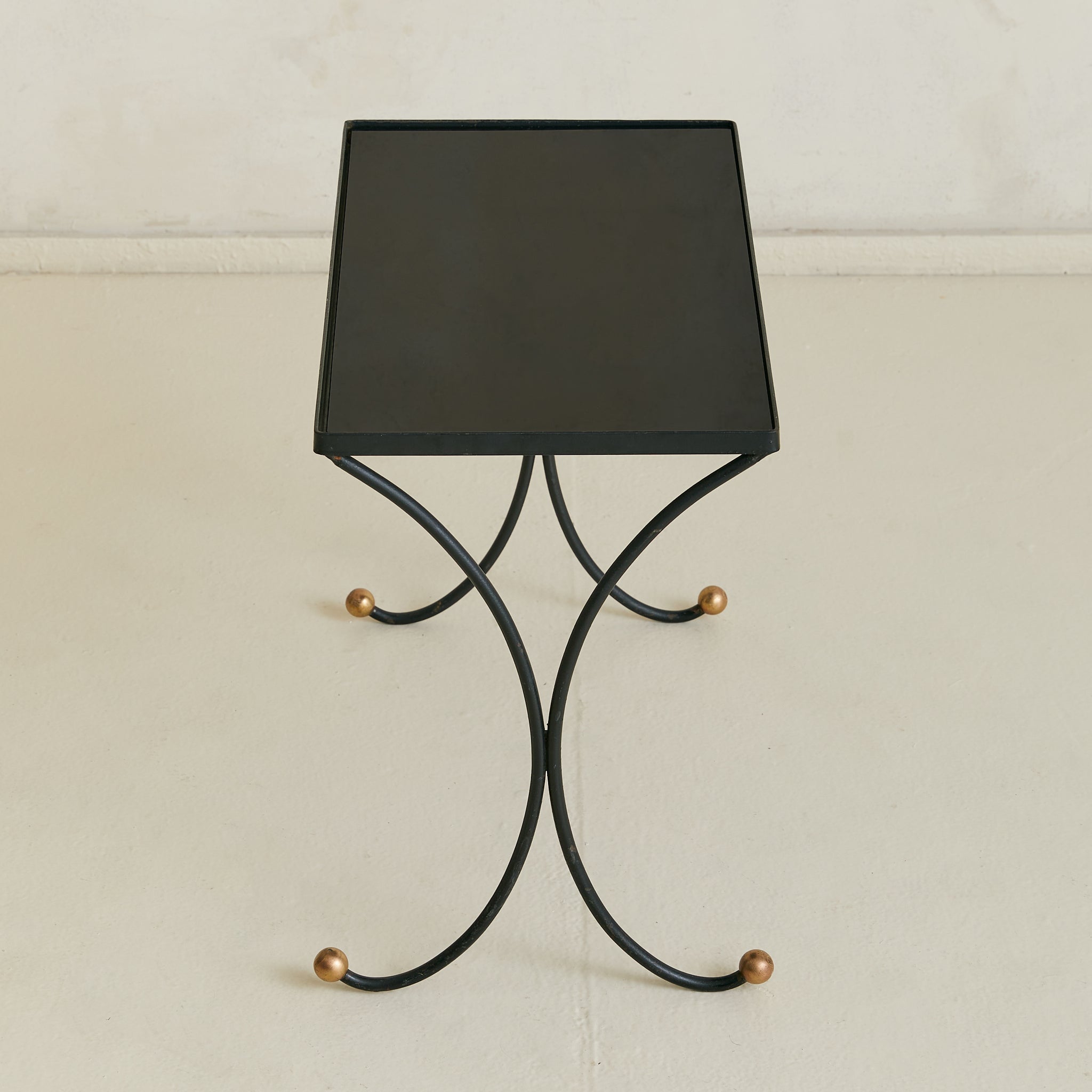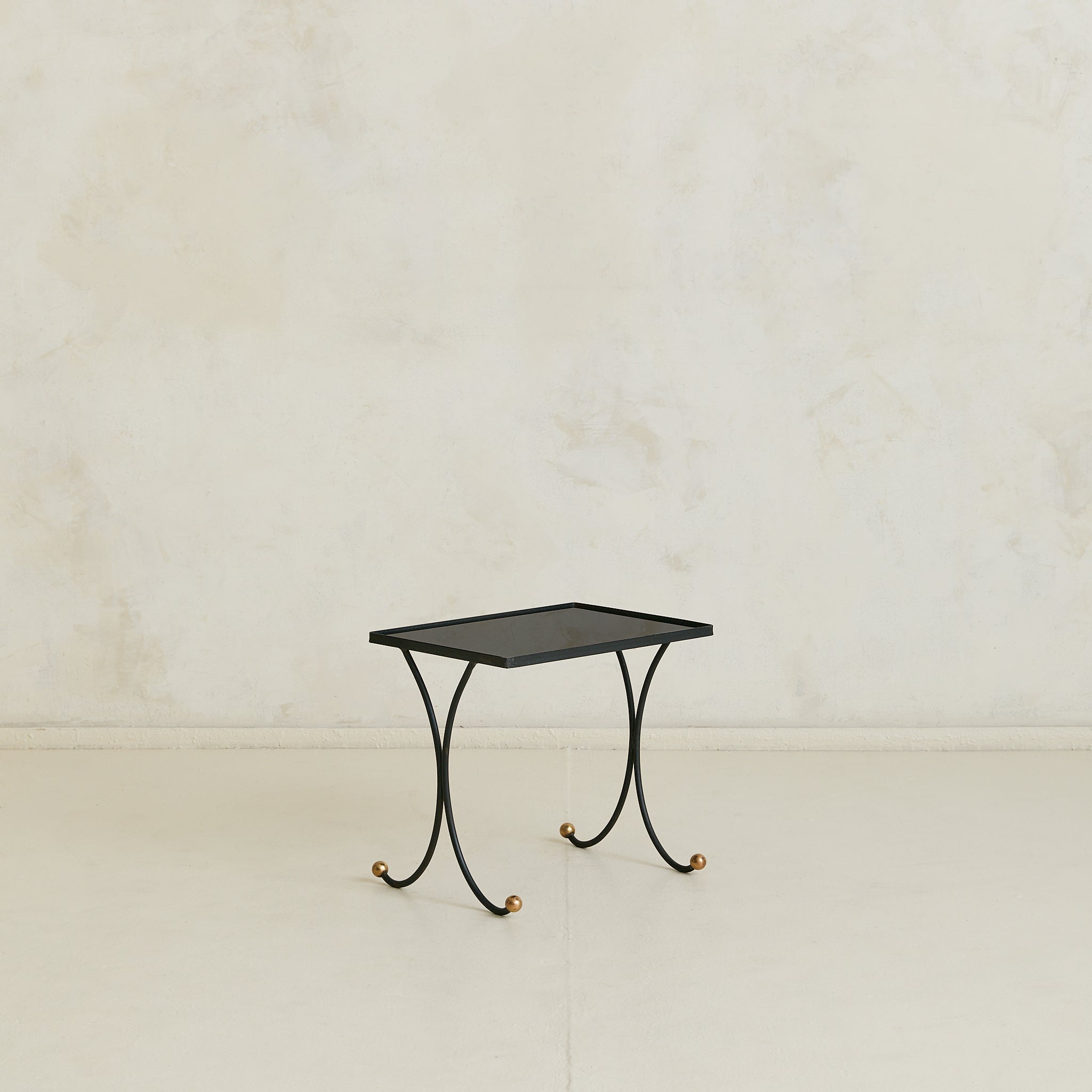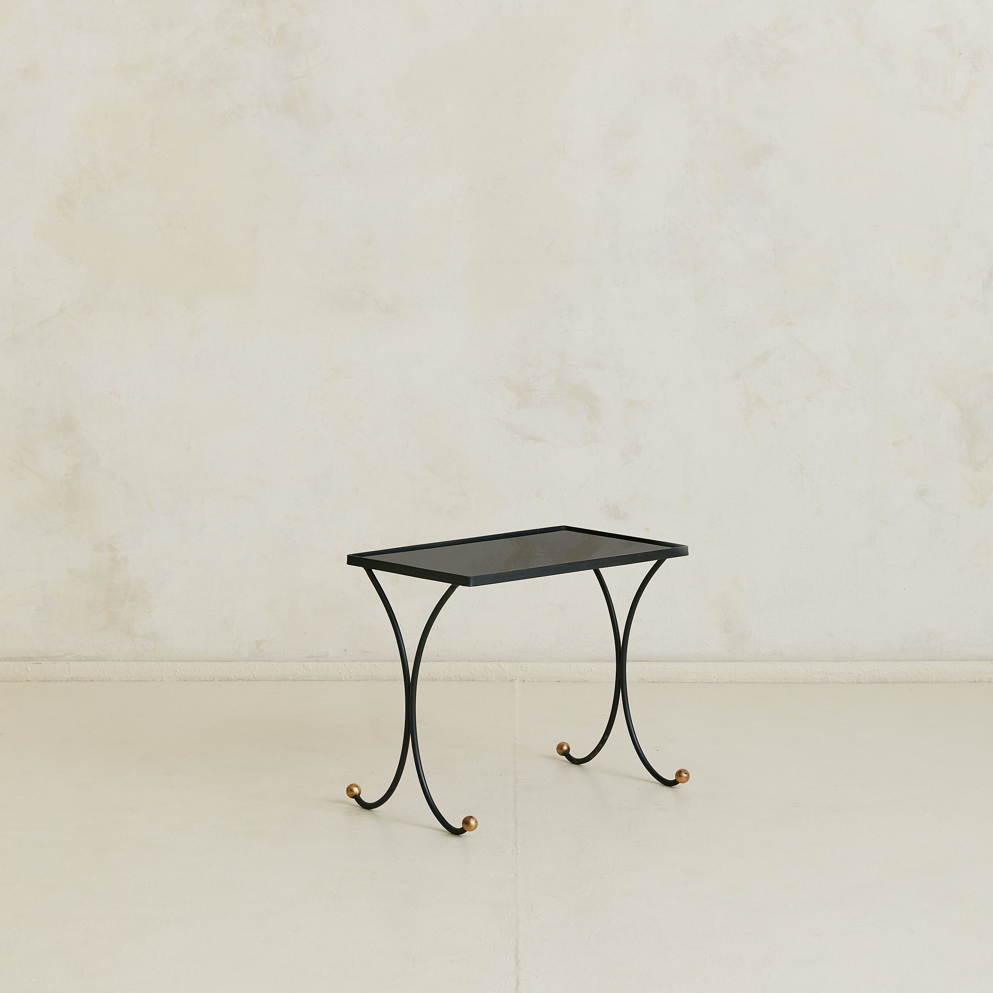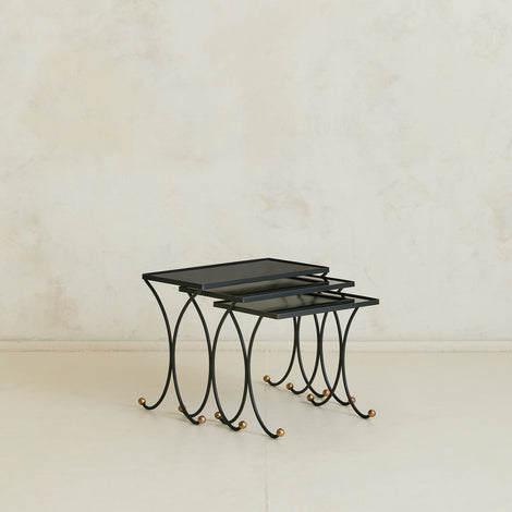 A trio of French nesting tables from the 1950s, in the manner of Jean Royère. Each table is composed of a delicate iron frame with sweeping scrolled legs, capped by brass ball feet. The rectangular tops are inset with black opaline glass, their glossy surface complementing the patinated metal.