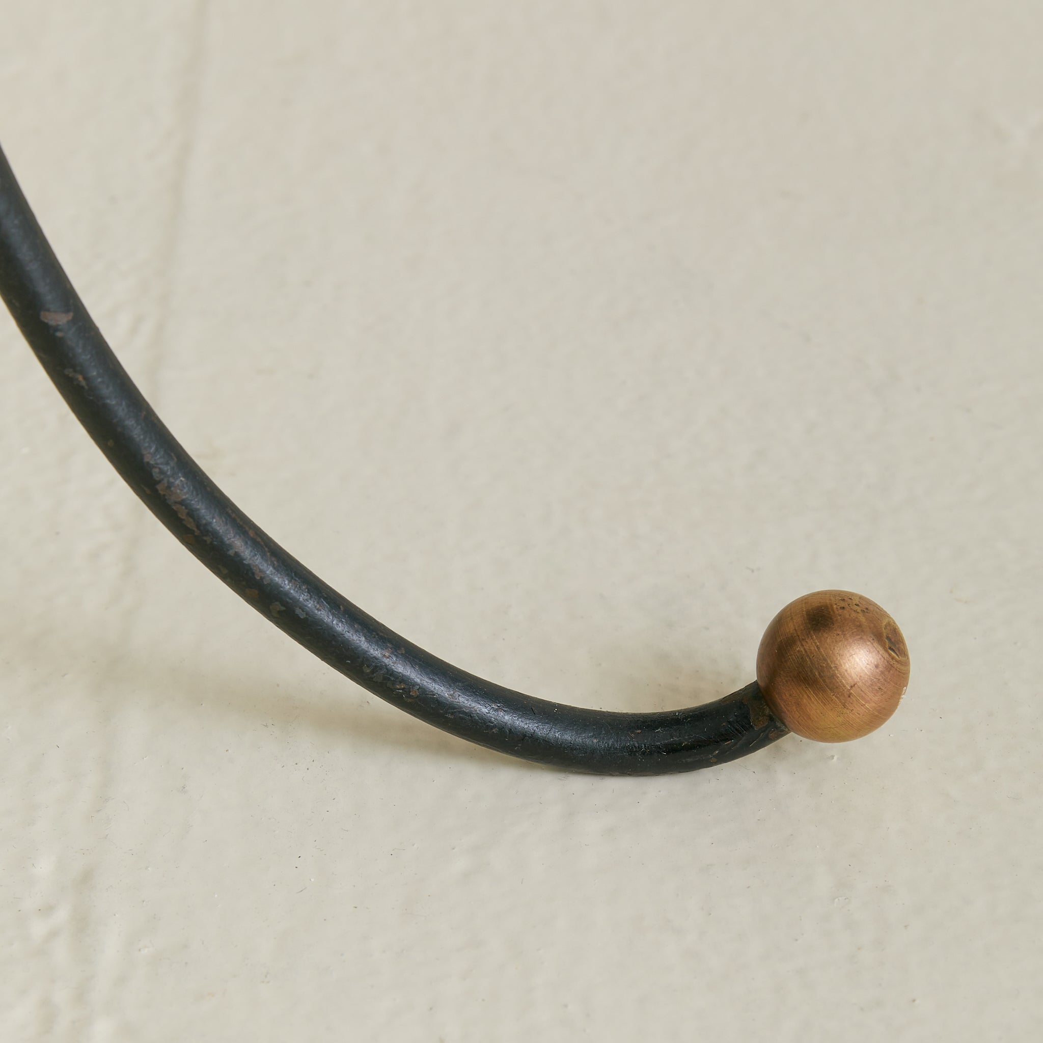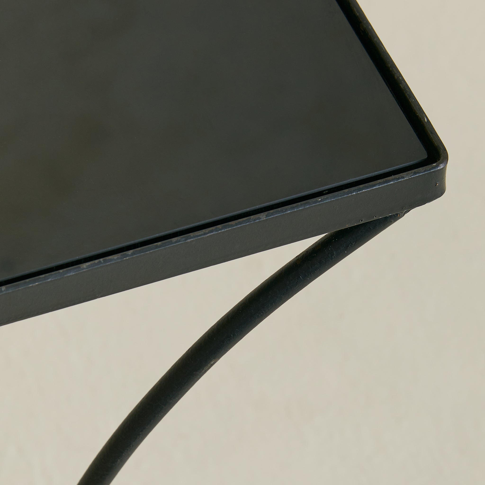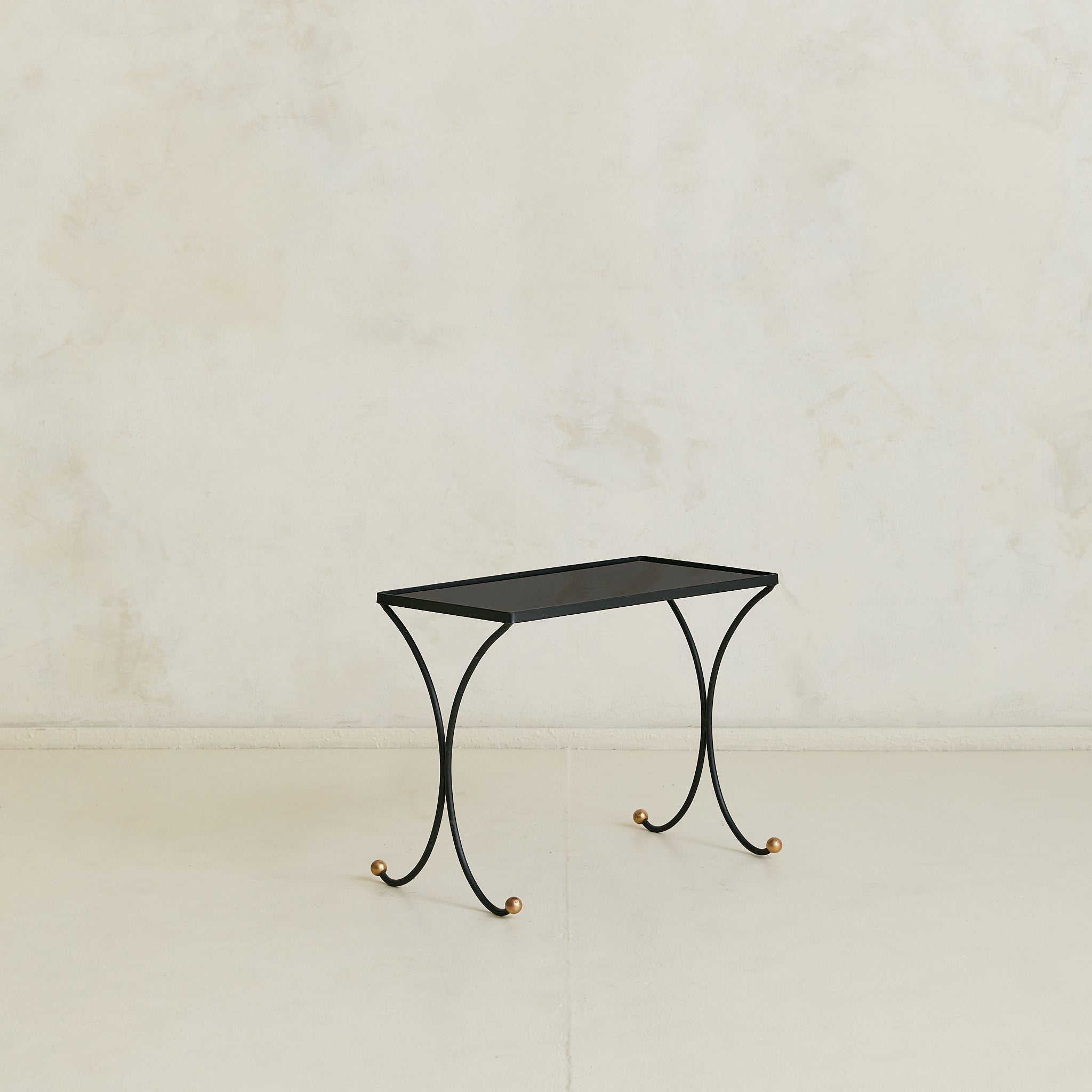 A trio of French nesting tables from the 1950s, in the manner of Jean Royère. Each table is composed of a delicate iron frame with sweeping scrolled legs, capped by brass ball feet. The rectangular tops are inset with black opaline glass, their glossy surface complementing the patinated metal.