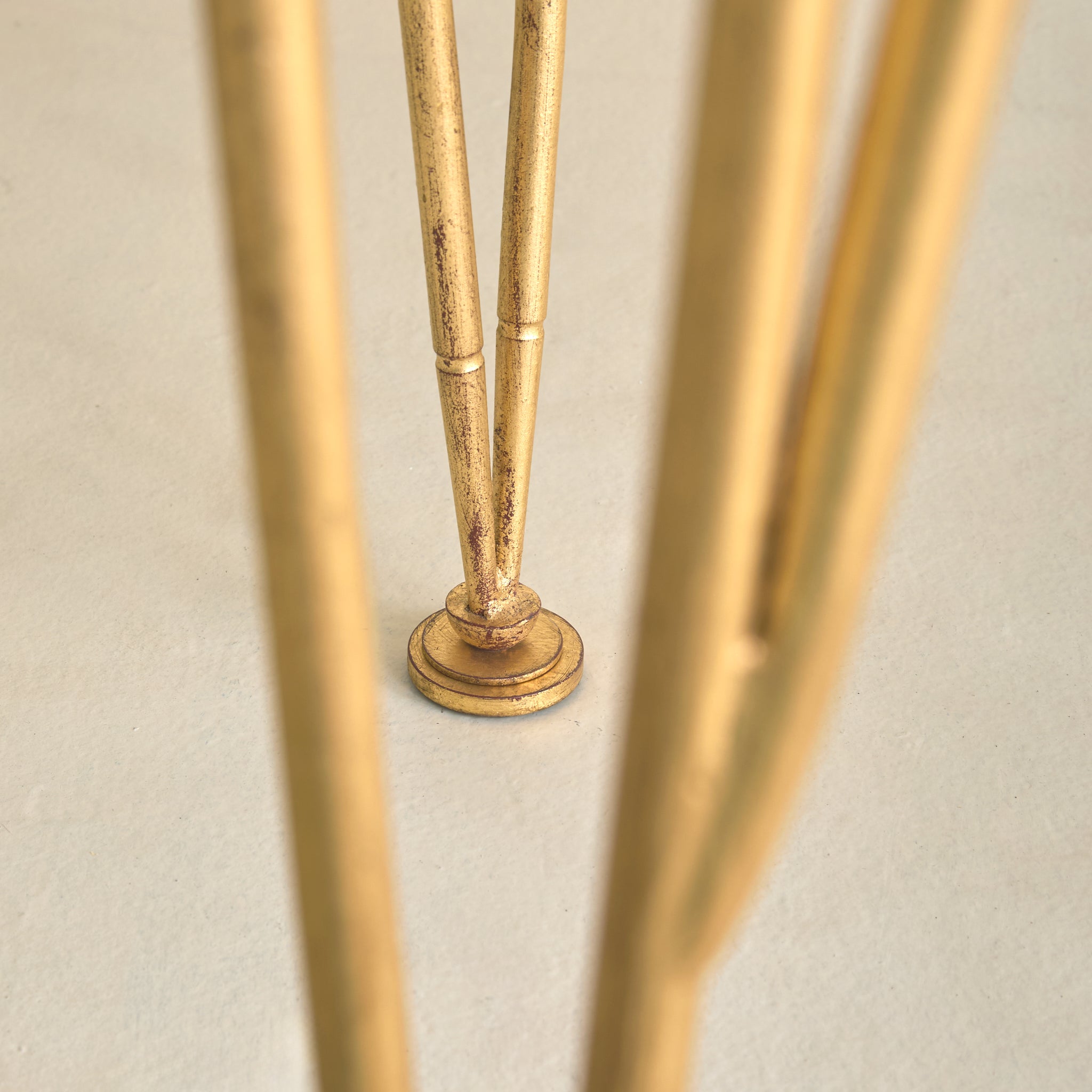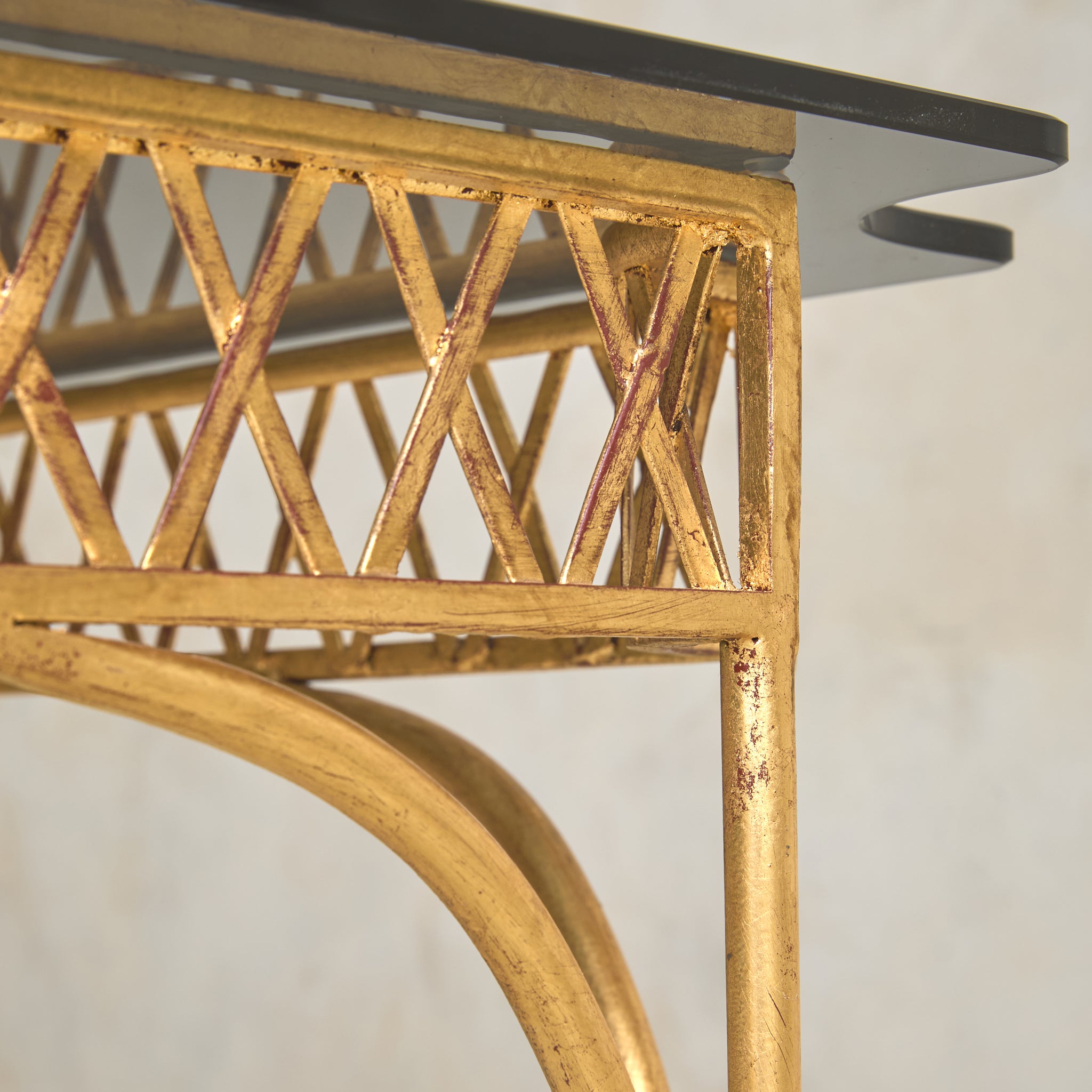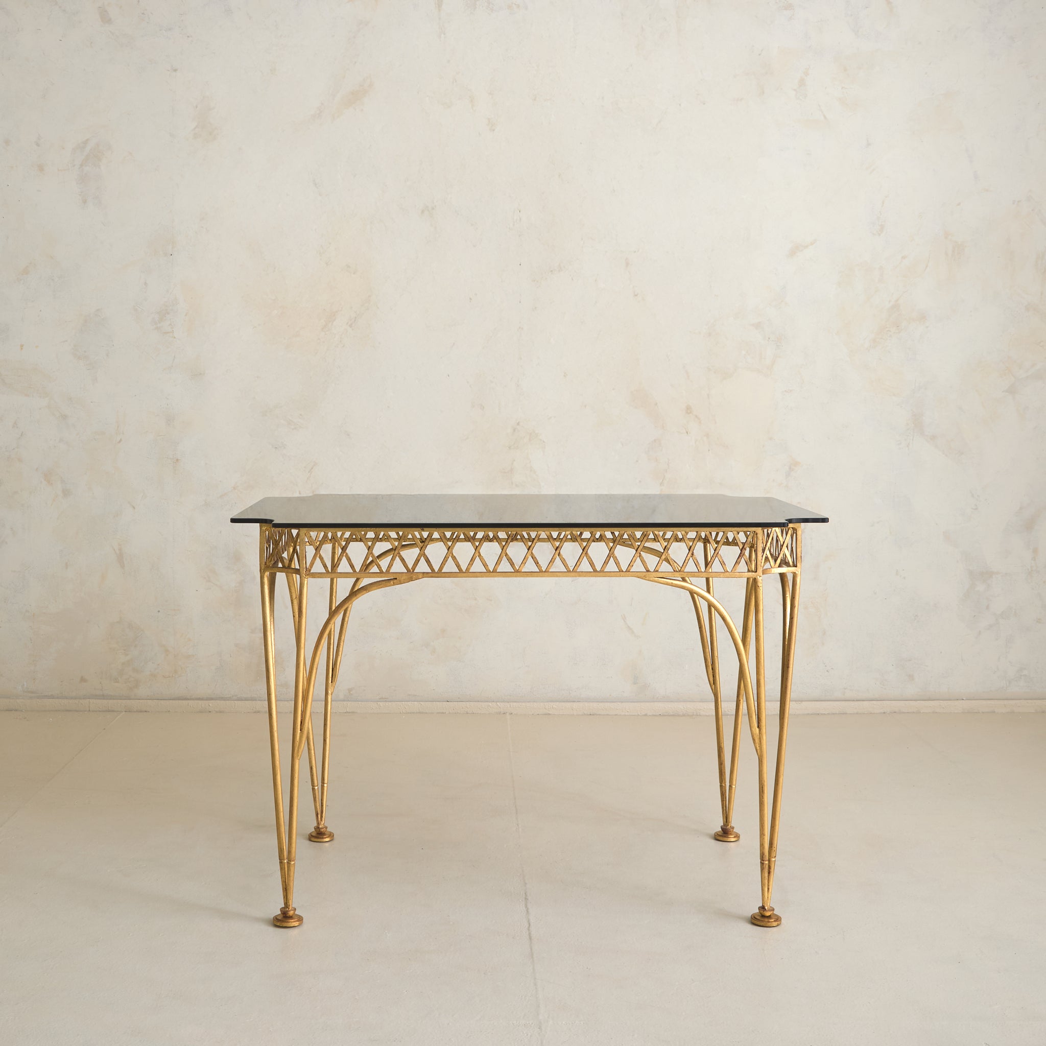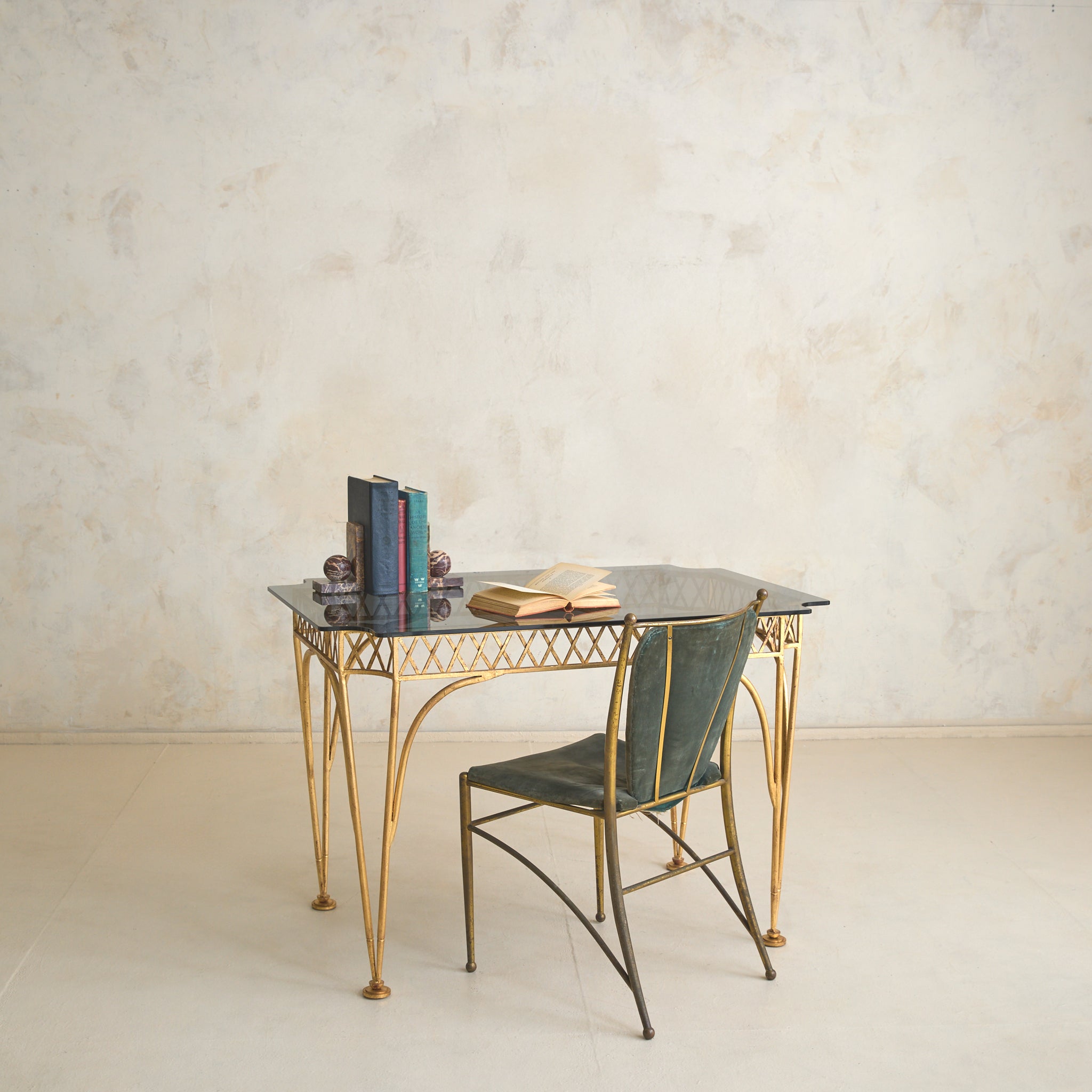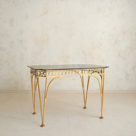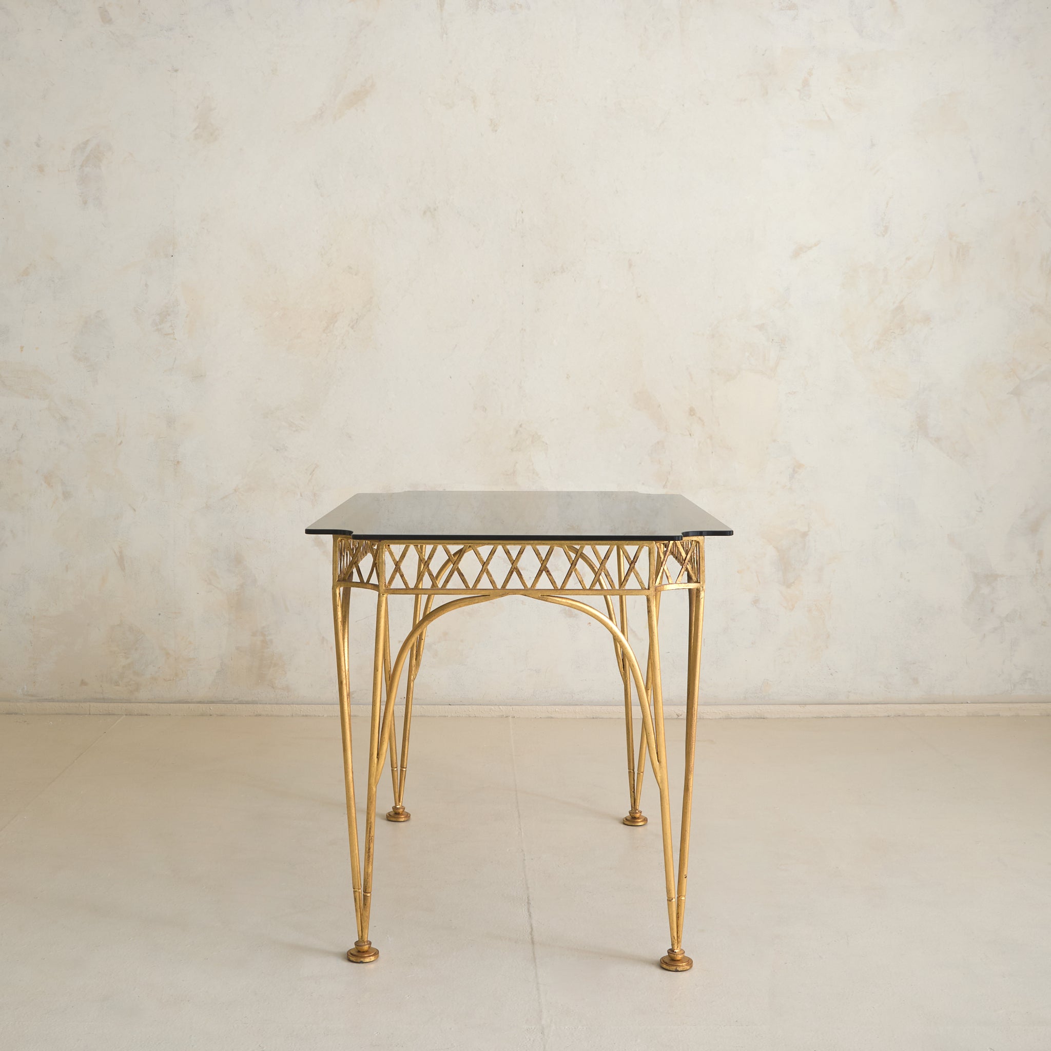 An Italian gilt bronze desk or petite dining table, crafted circa 1950s–1960s and sourced from the Banci family estate in Florence. The slender metal frame is finished with hand-applied gold leaf, its surface softly catching light—its patina earned through time, not polish.