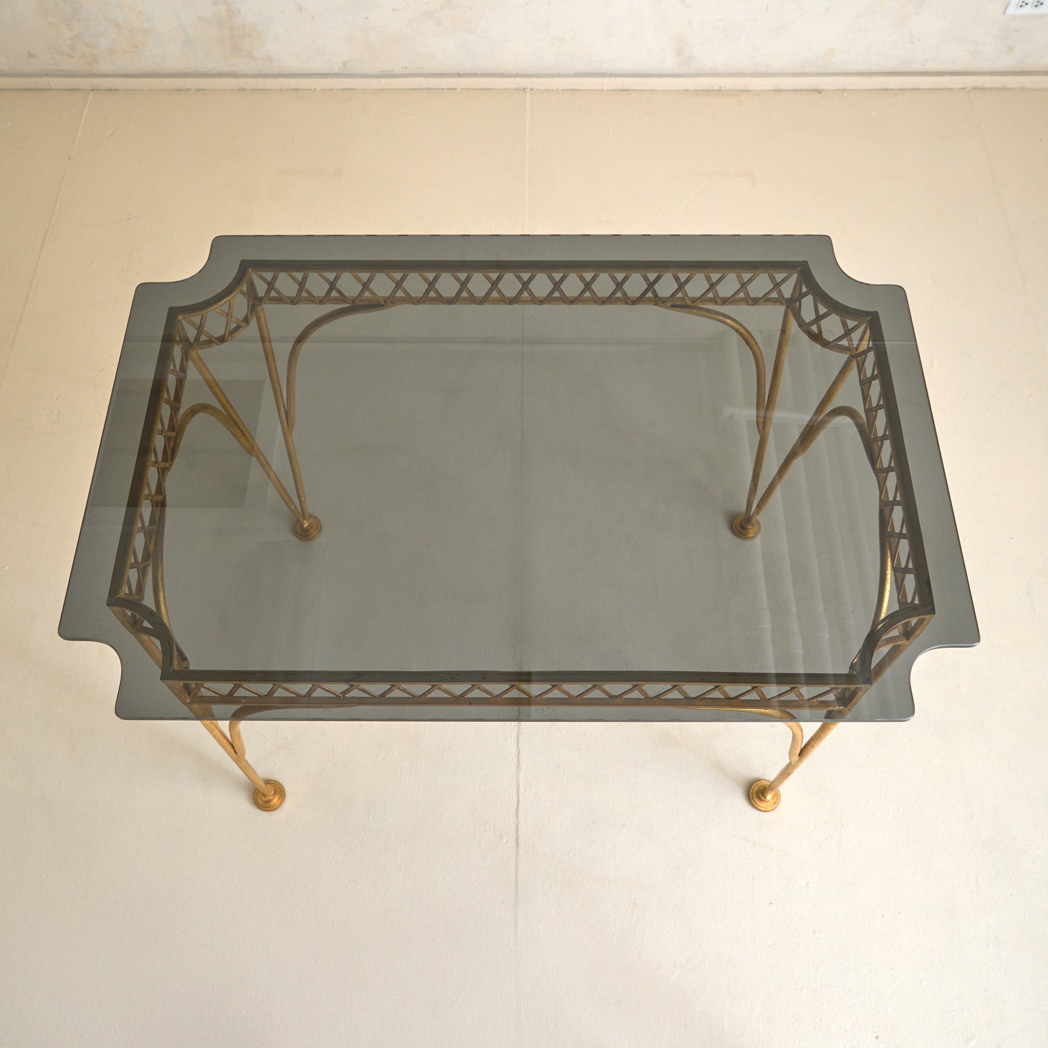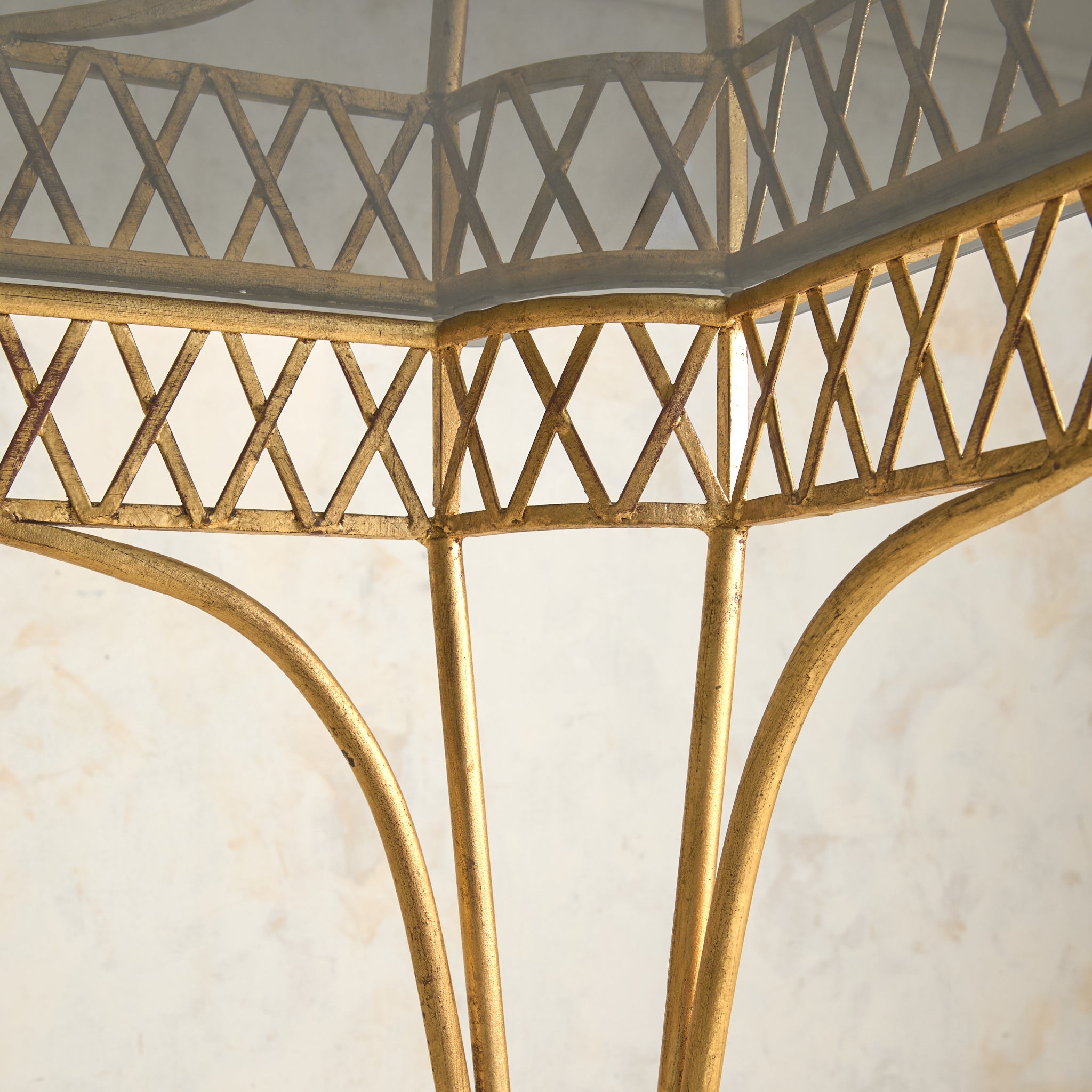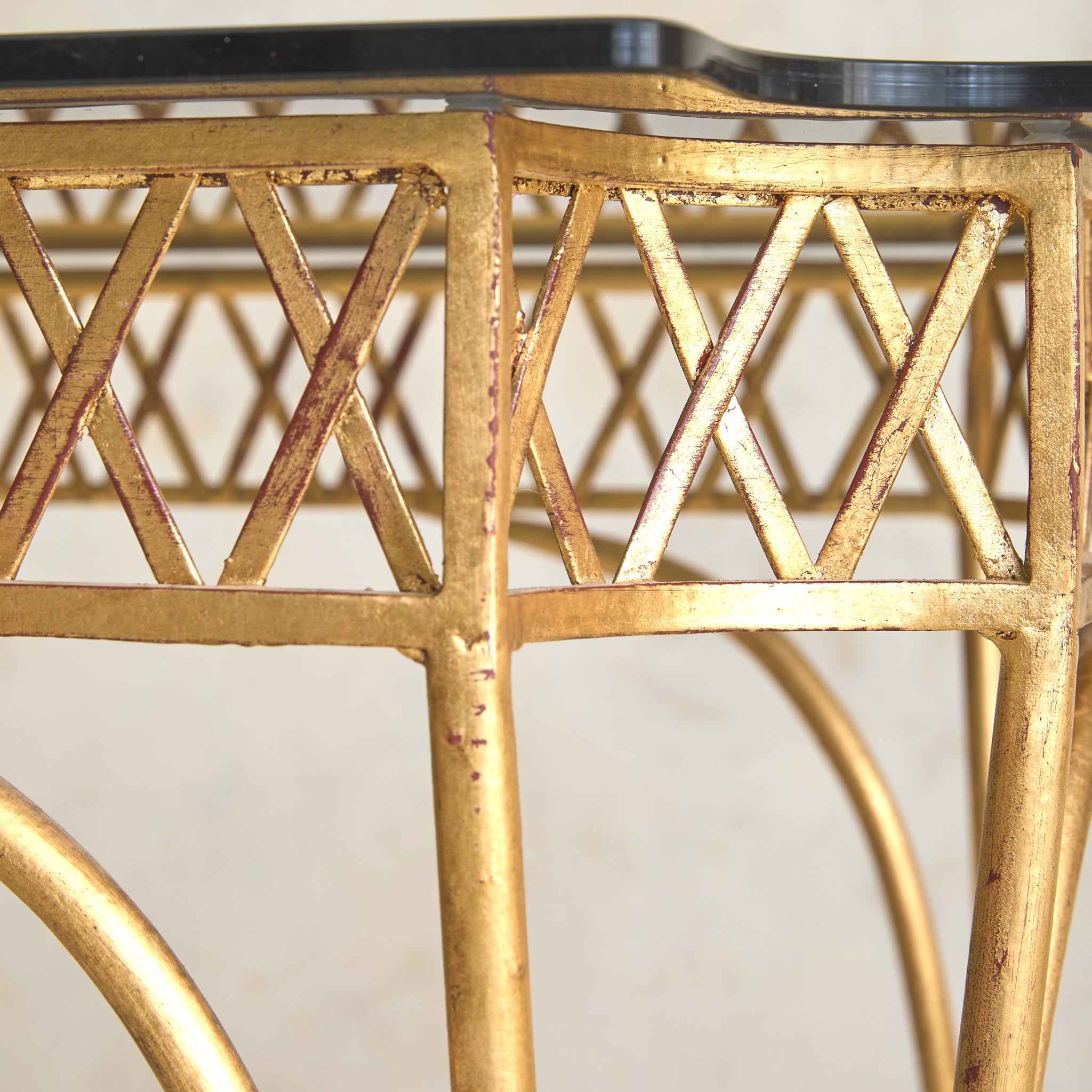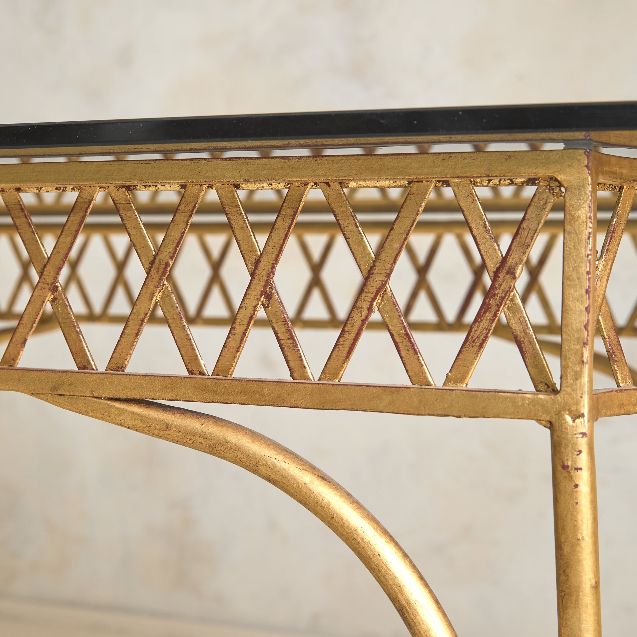 A rhythmic lattice apron wraps the perimeter like a delicate filigree, while gently arched stretchers and tapering legs speak to Florentine decorative tradition. The smoked glass top hovers above the base, tracing the silhouette of the gilded metal below.