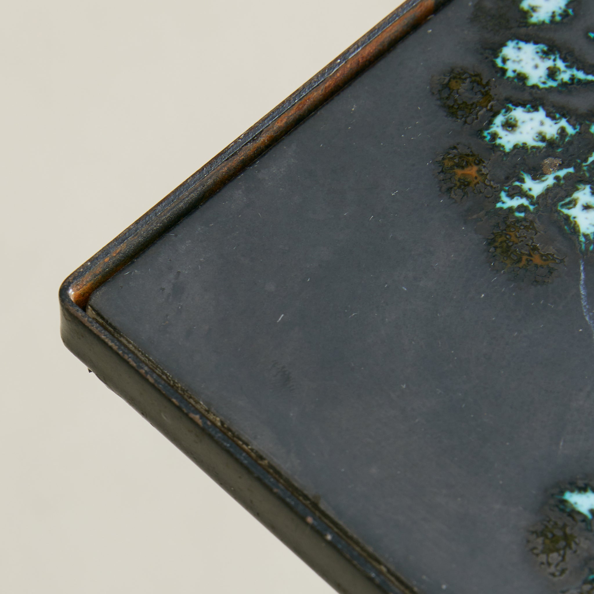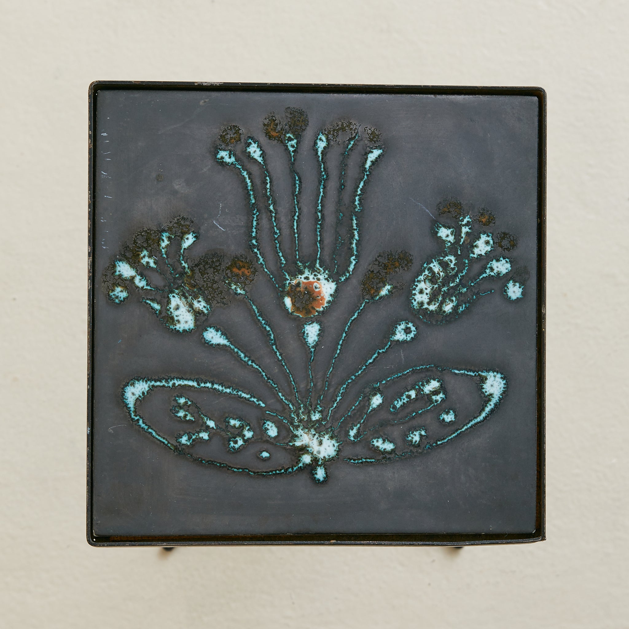 A petite French artisan-made accent table, dating to the mid-20th century. The square top is inset with a hand-fired ceramic tile, its surface animated by a stylized botanical motif in turquoise and earth tones against a deep ground. The tile is framed in slender iron, rising on four legs joined by circular stretchers and flaring to splayed feet.
