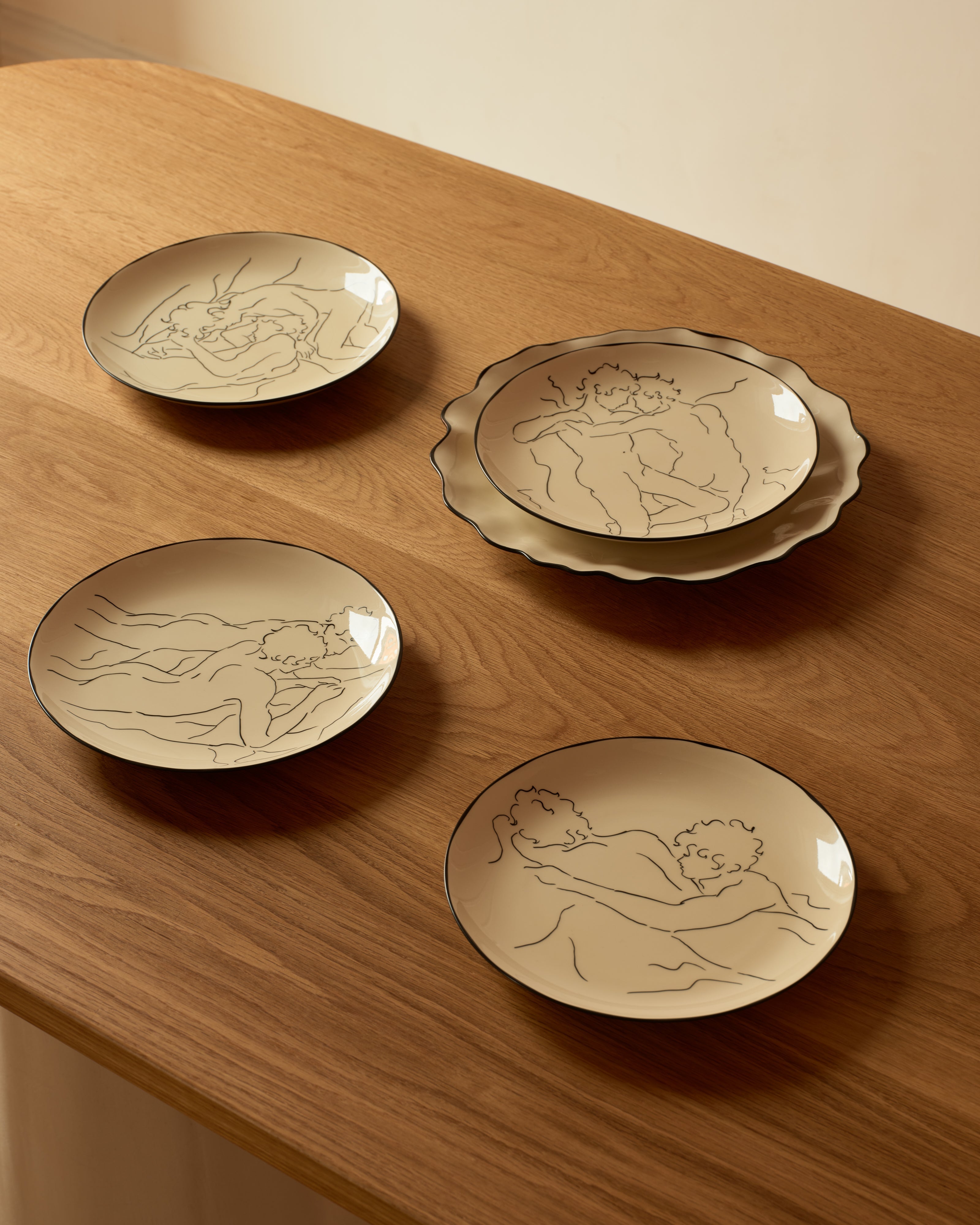 This captivating collection of four porcelain dessert plates showcases Gianfranco Briceño's distinctive artistic vision through original sketches inspired by the timeless myth of Achilles and Patroclus. Each fine porcelain plate in this limited edition set captures a moment of intimate connection and heroic strength, bringing classical Greek beauty to contemporary dining.