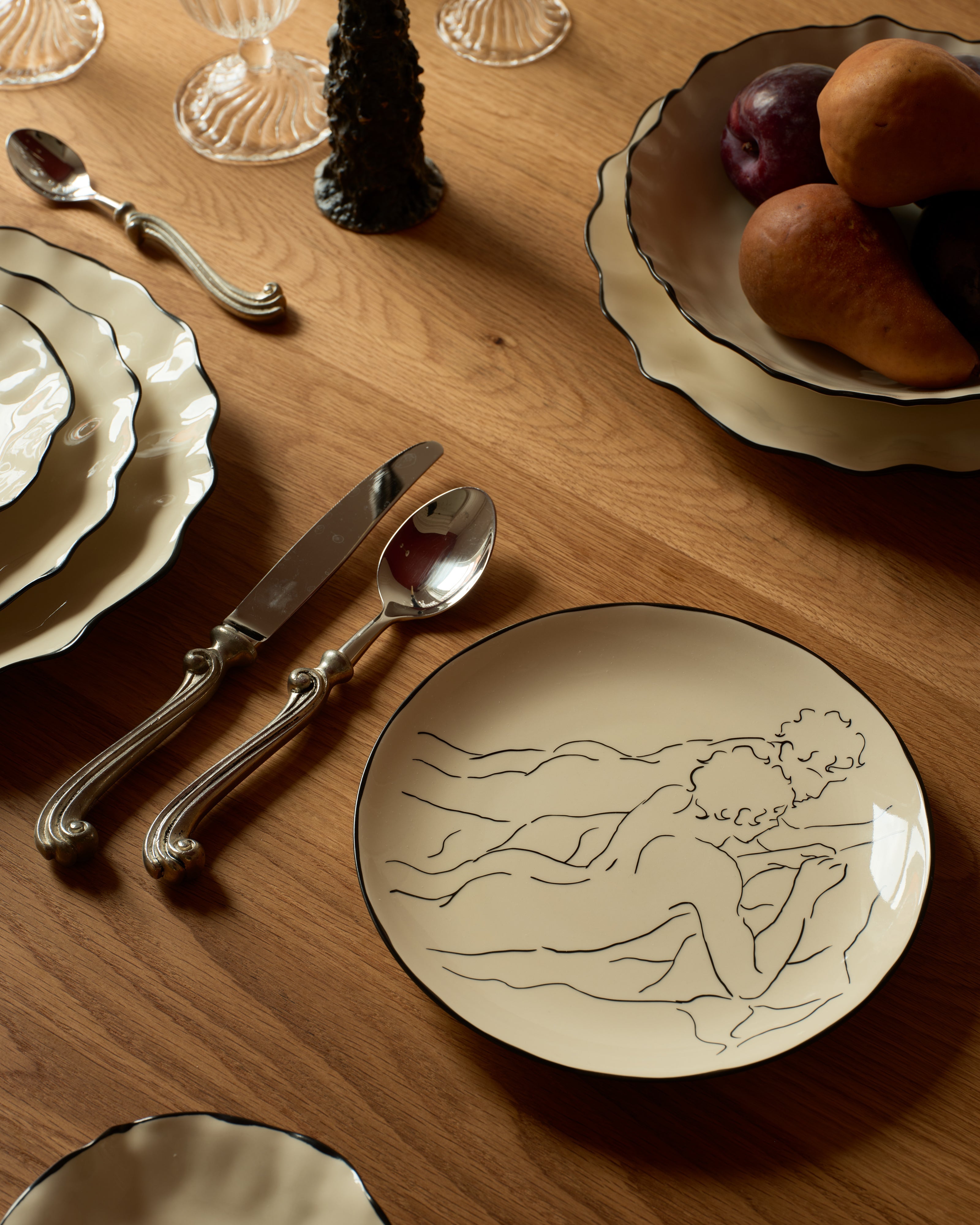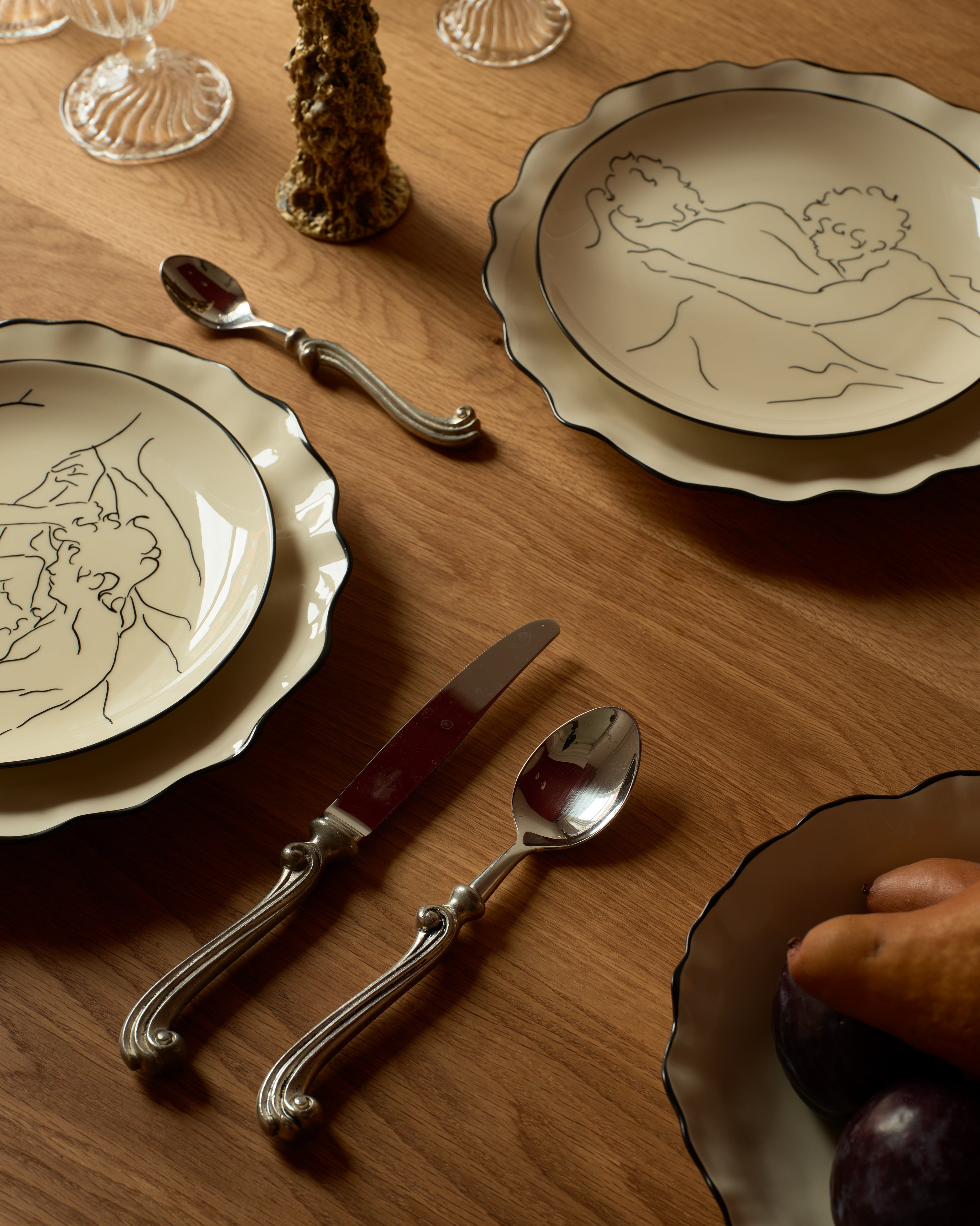 Meticulously crafted in Portugal, these dessert plates balance striking visual impact with everyday functionality. The artistry celebrates one of mythology's most profound relationships—warrior and companion, mentor and student, lovers whose bond transcended battlefield glory. Layer them with the Ribbon collection for a curated tablescape or display them as standalone art pieces that invite conversation and everlasting stories.