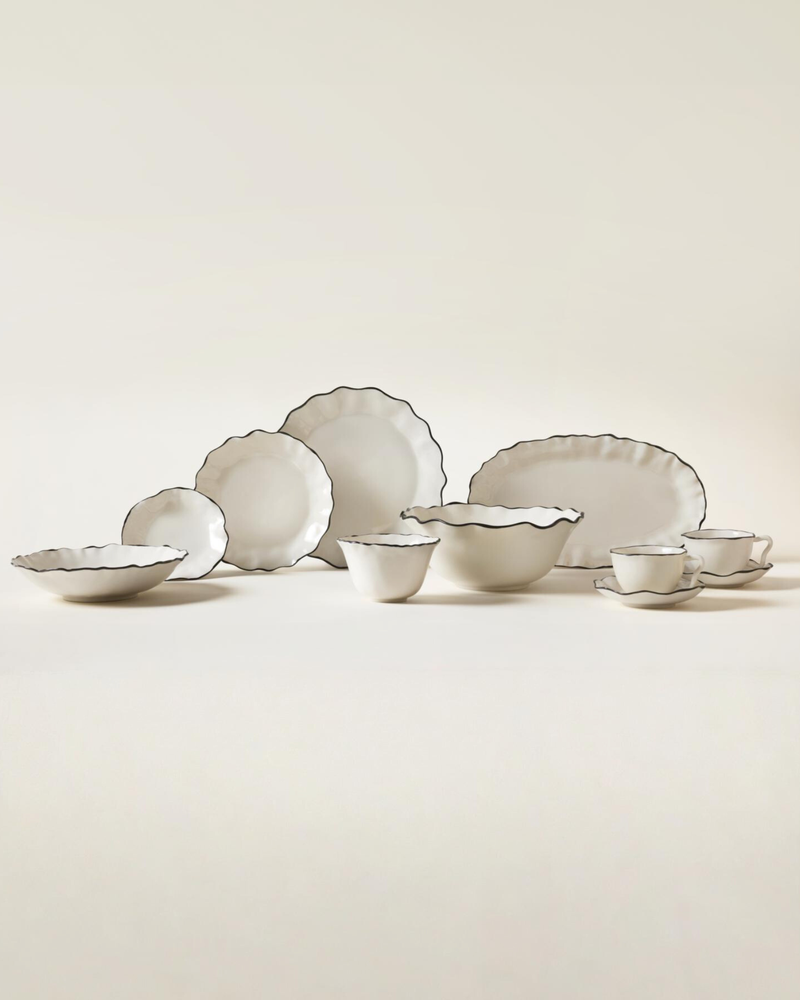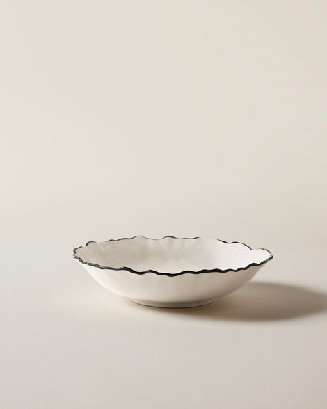 The Ribbon Pasta Bowl, crafted in Portugal from the finest porcelain, features a subtle ribbon around the edge and a thin, hand-painted black line accenting the perfect shade of cream.