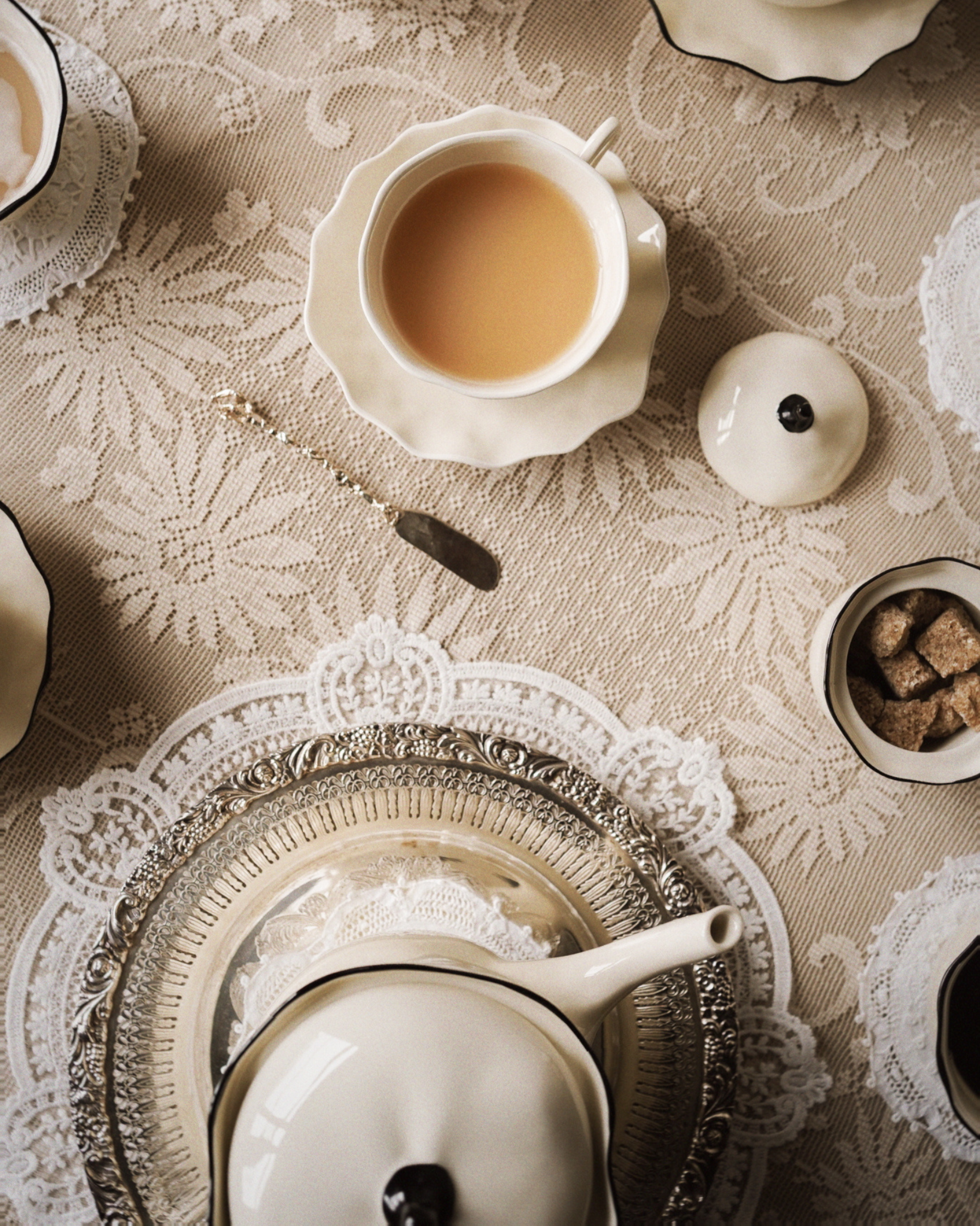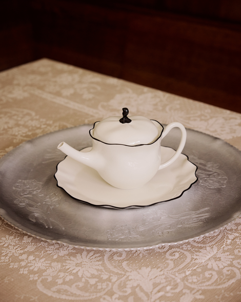 The Ribbon Teapot carries the classic Ribbon Collection details: a soft, cream-colored porcelain base and a hand-painted black edge that is just slightly wonky—a whimsical addition to the collection.