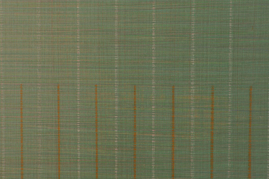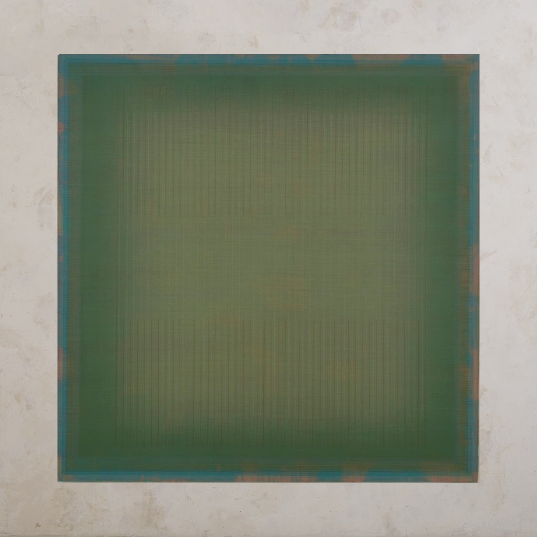 A color pencil and acrylic painting on canvas by American artist Marc Ross, 2020. This minimal abstract painting features an impressive gradation of green and teal hues, giving it an astonishing sense of depth. Signed, dated, and titled en verso. Presented unframed.