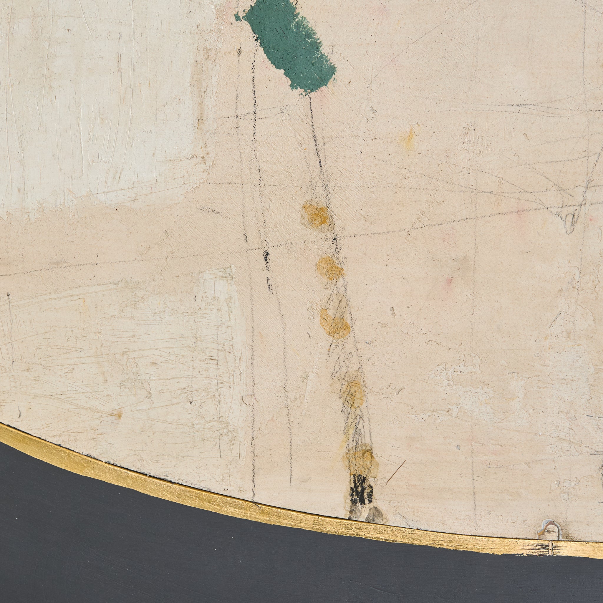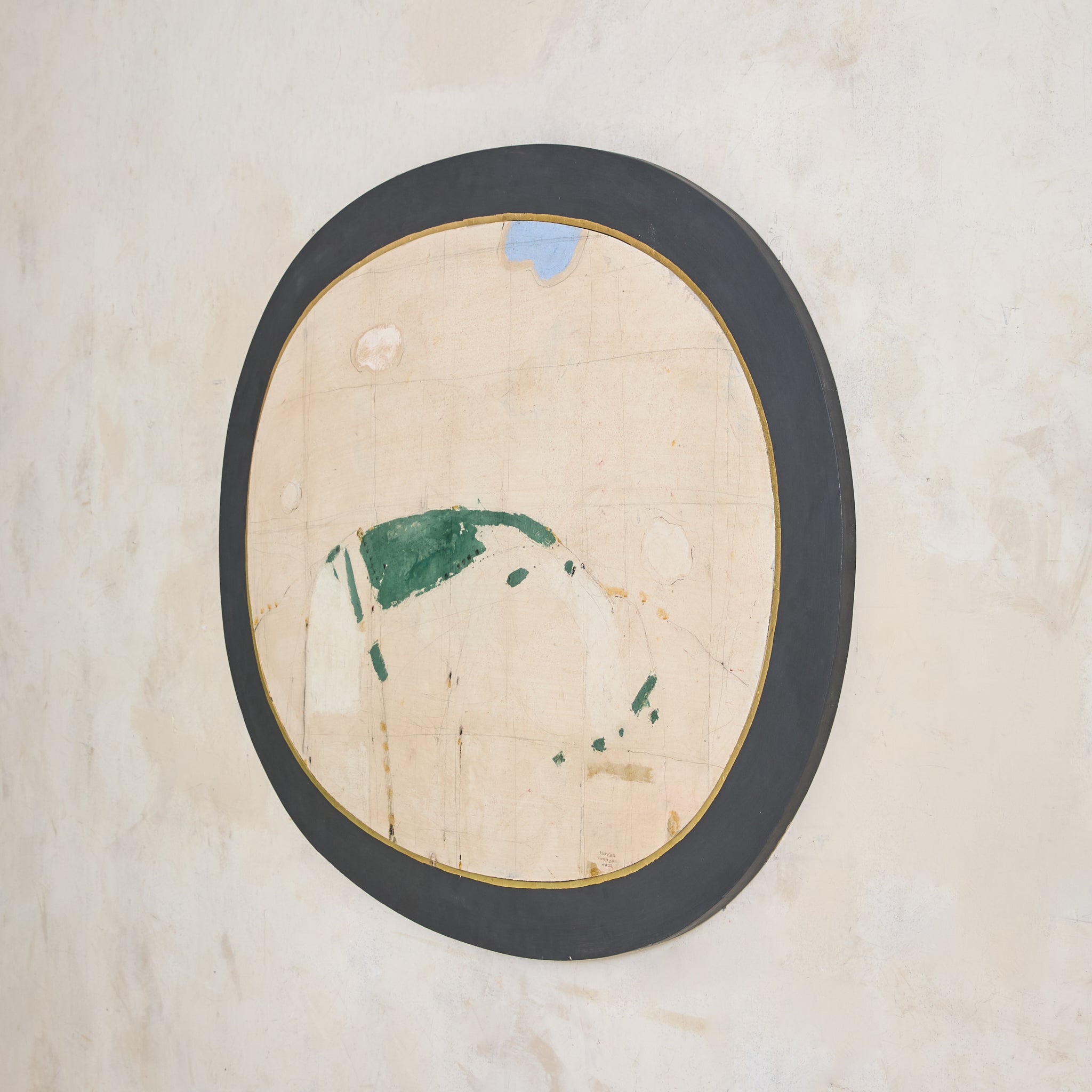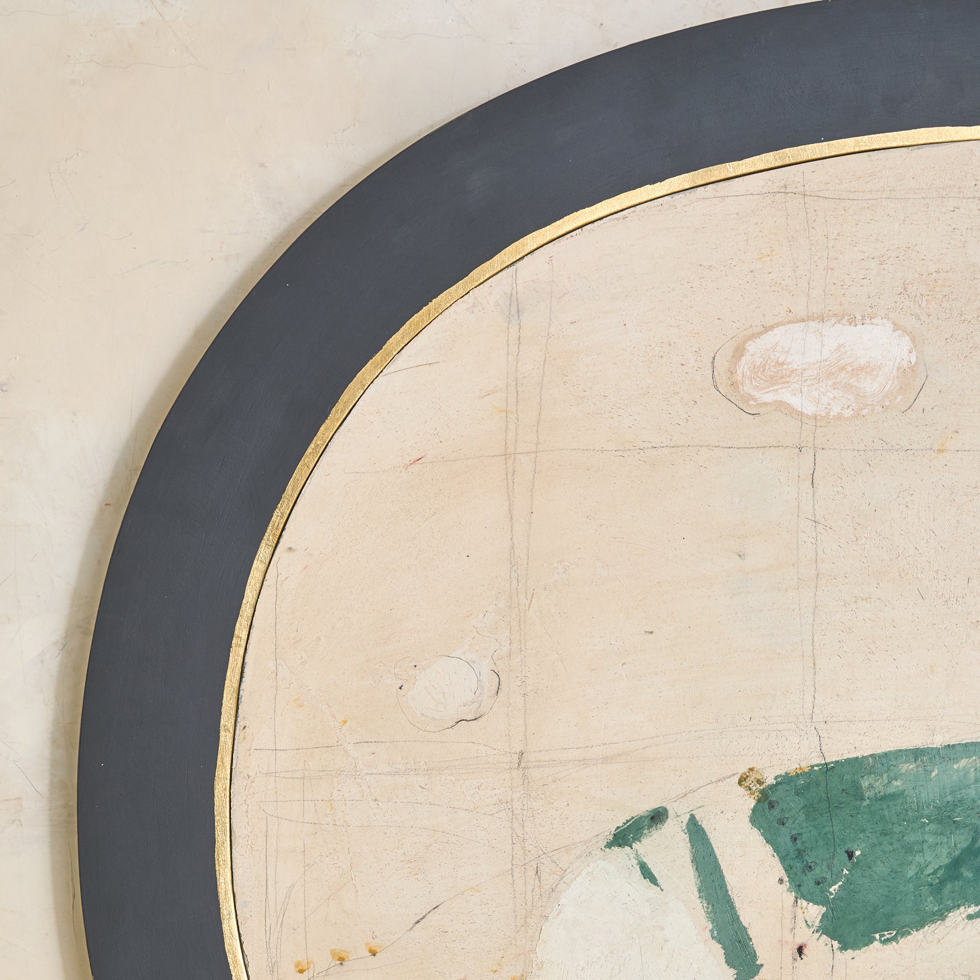 An acrylic painting on board by Italian artist Mauro Fornari. This layered abstract features warm ivory, green, and soft powder blue hues with charcoal accents. Signed ‘Mauro Fornari MM 22’ on the bottom right. Presented in an oval floating black and gold wood frame. Italy, 2022.