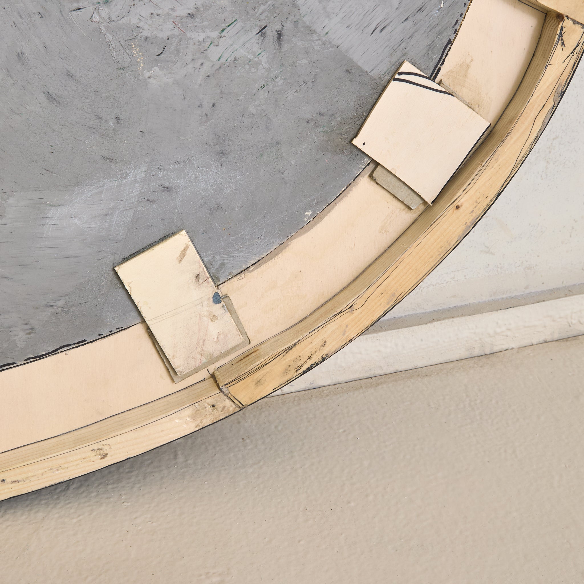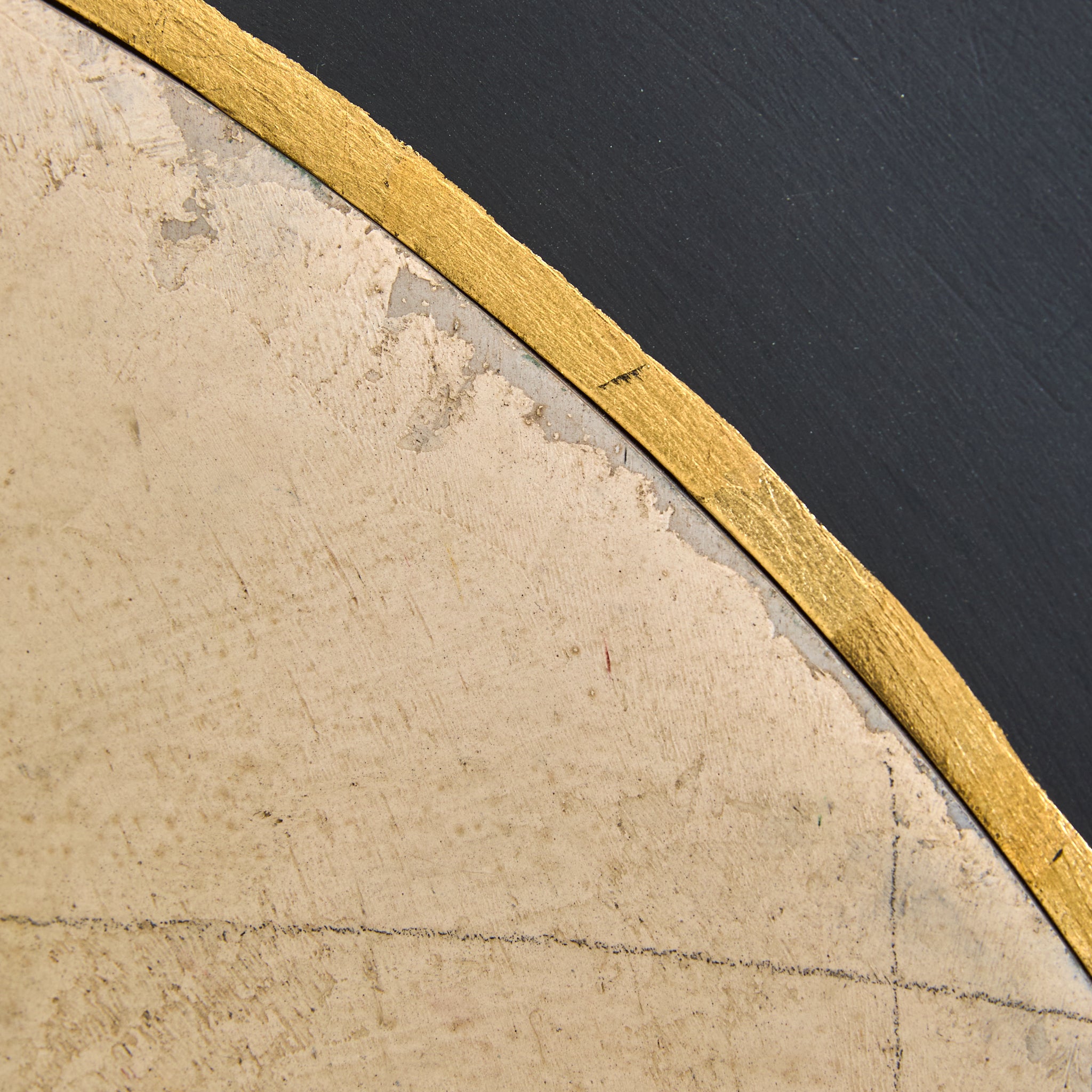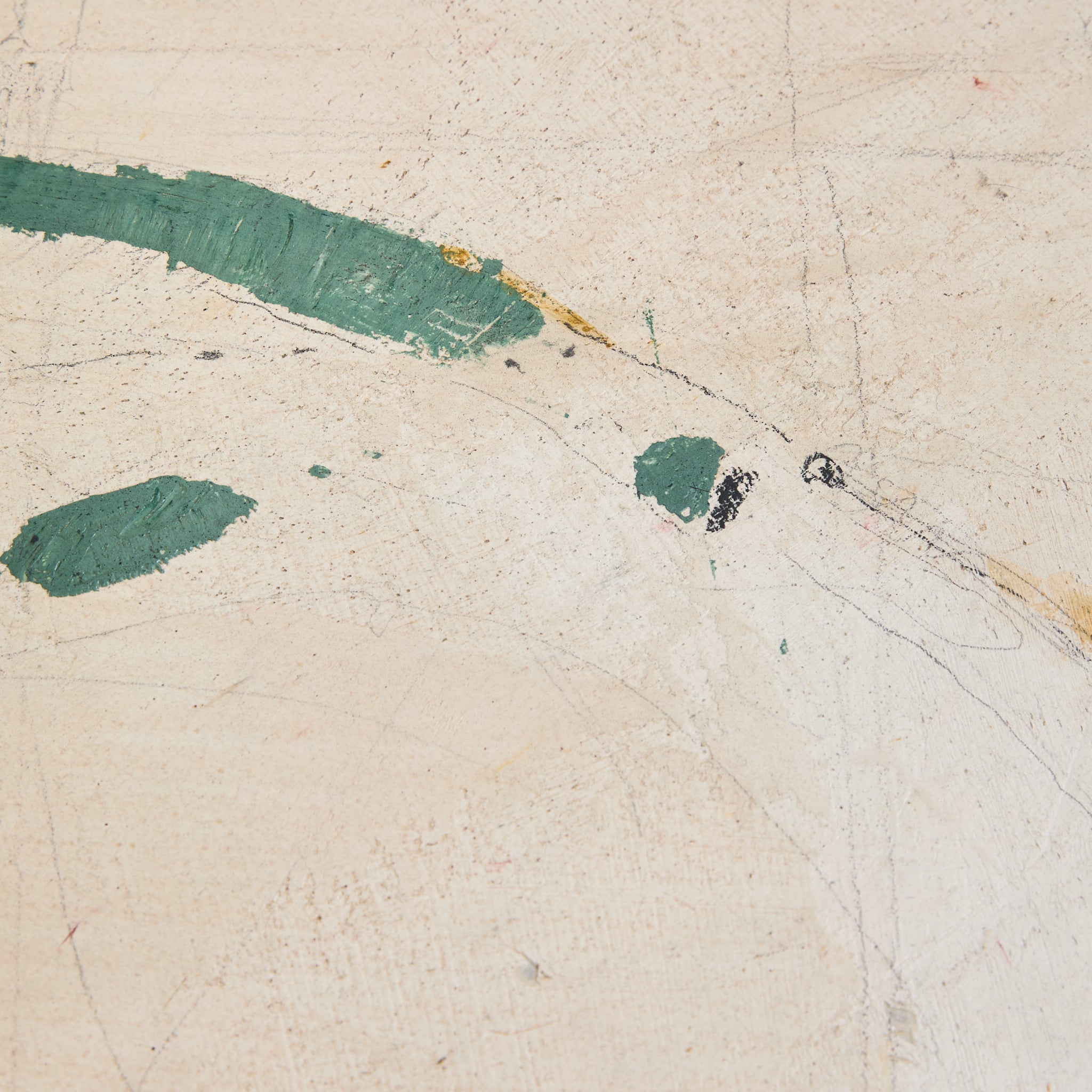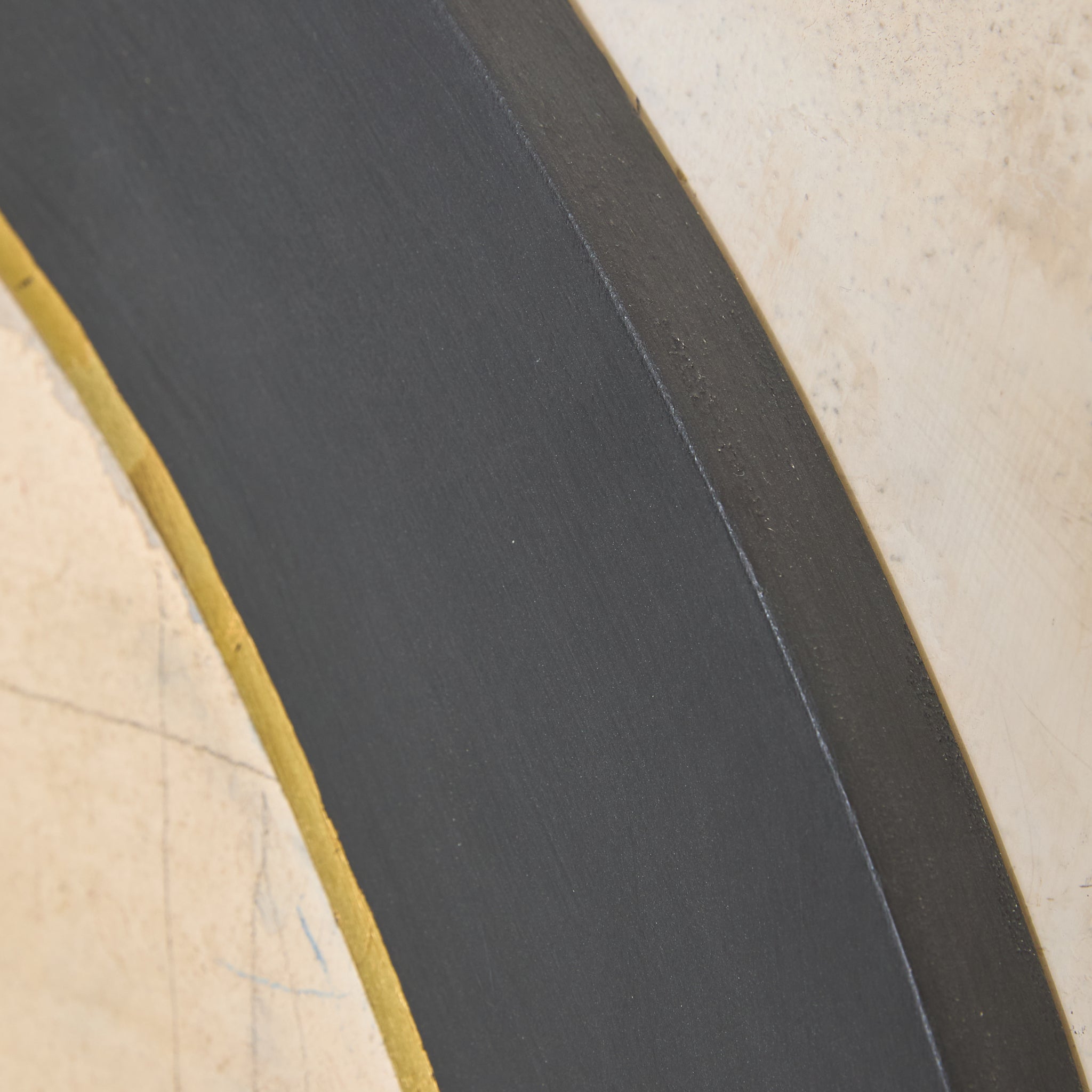 An acrylic painting on board by Italian artist Mauro Fornari. This layered abstract features warm ivory, green, and soft powder blue hues with charcoal accents. Signed ‘Mauro Fornari MM 22’ on the bottom right. Presented in an oval floating black and gold wood frame. Italy, 2022.