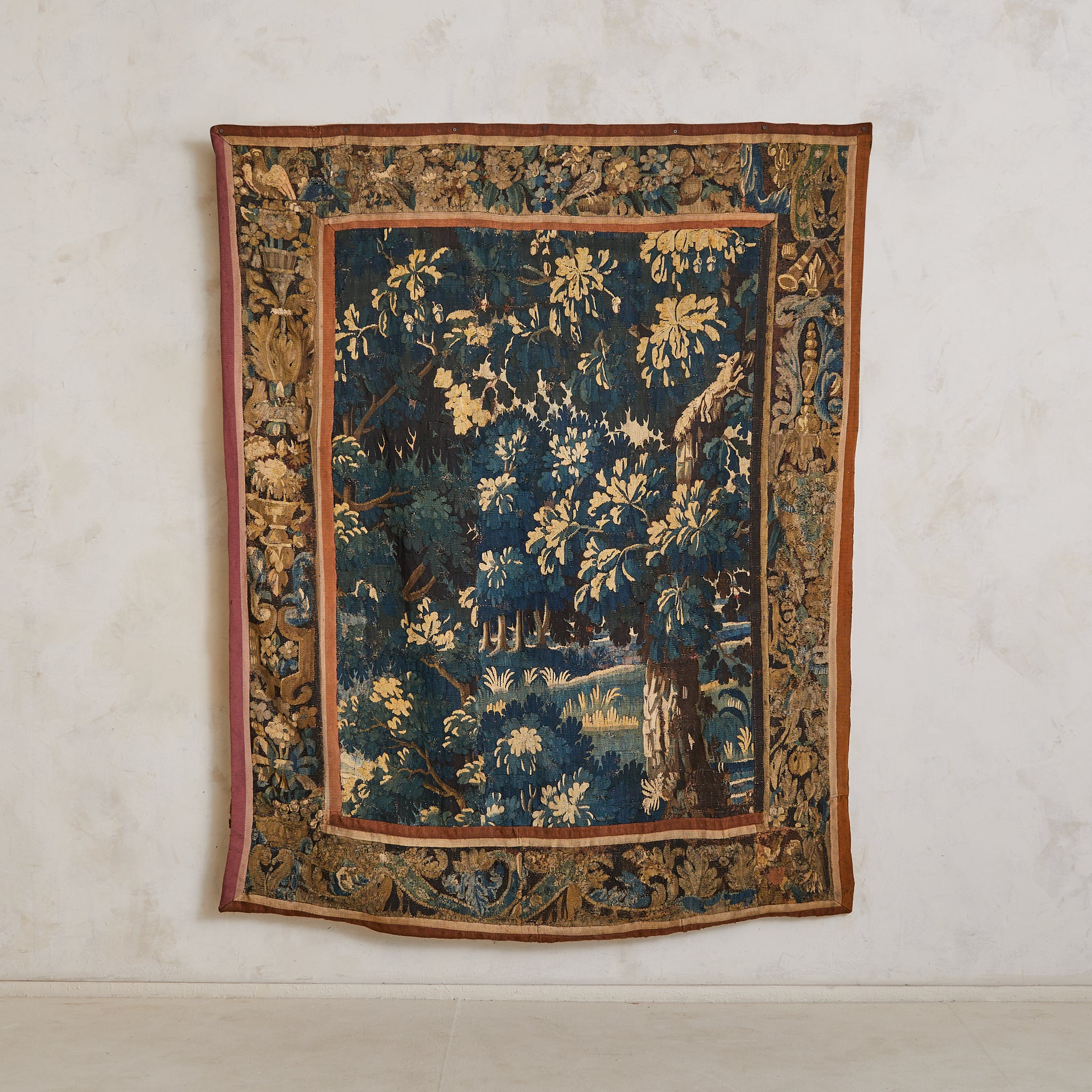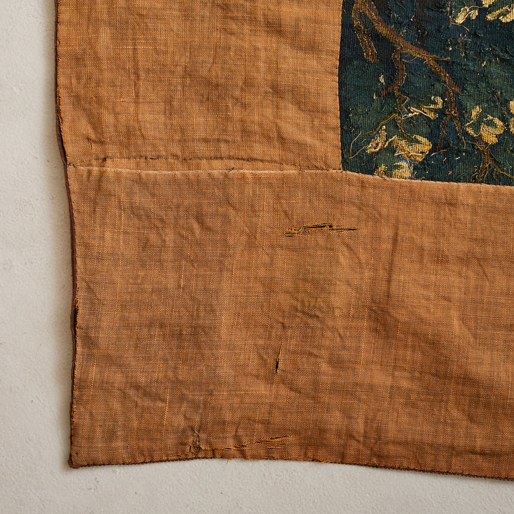 A rare surviving example of monumental textile artistry—romantic, immersive, and steeped in history. Nearly mural scale, it acts as a soft architectural anchor, infusing the room with warmth and presence.