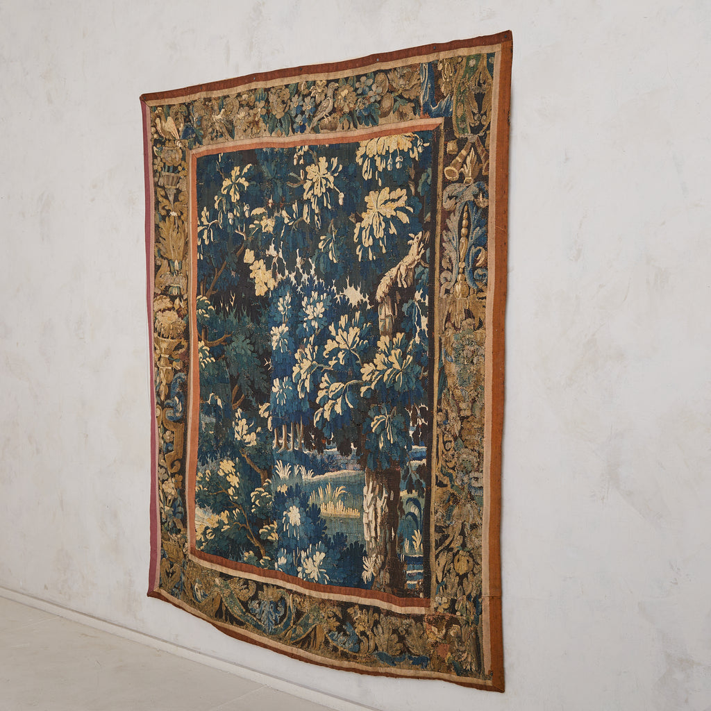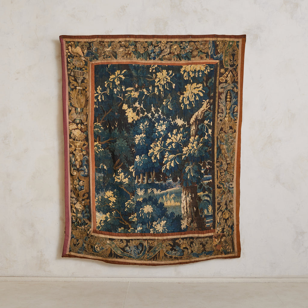 An 18th-century handwoven Aubusson tapestry depicting a verdant woodland in rich, moody tones. Dappled foliage cascades across the scene, rendered in deep indigos, mossy greens, and golden ochres—a pastoral dream suspended in time. A florid border of scrolling acanthus and fruiting vines frames the composition, evoking the grandeur of French decorative arts at their height.