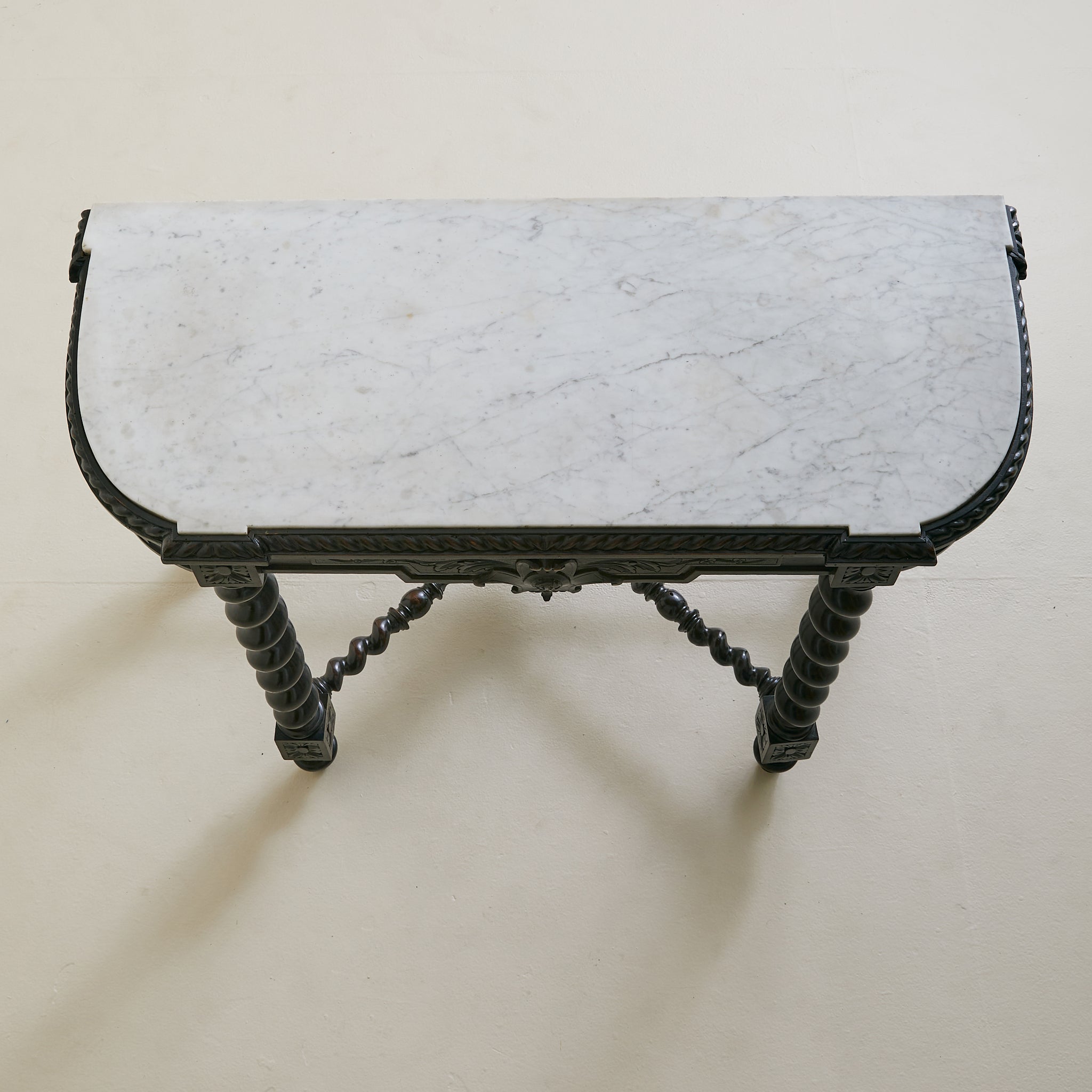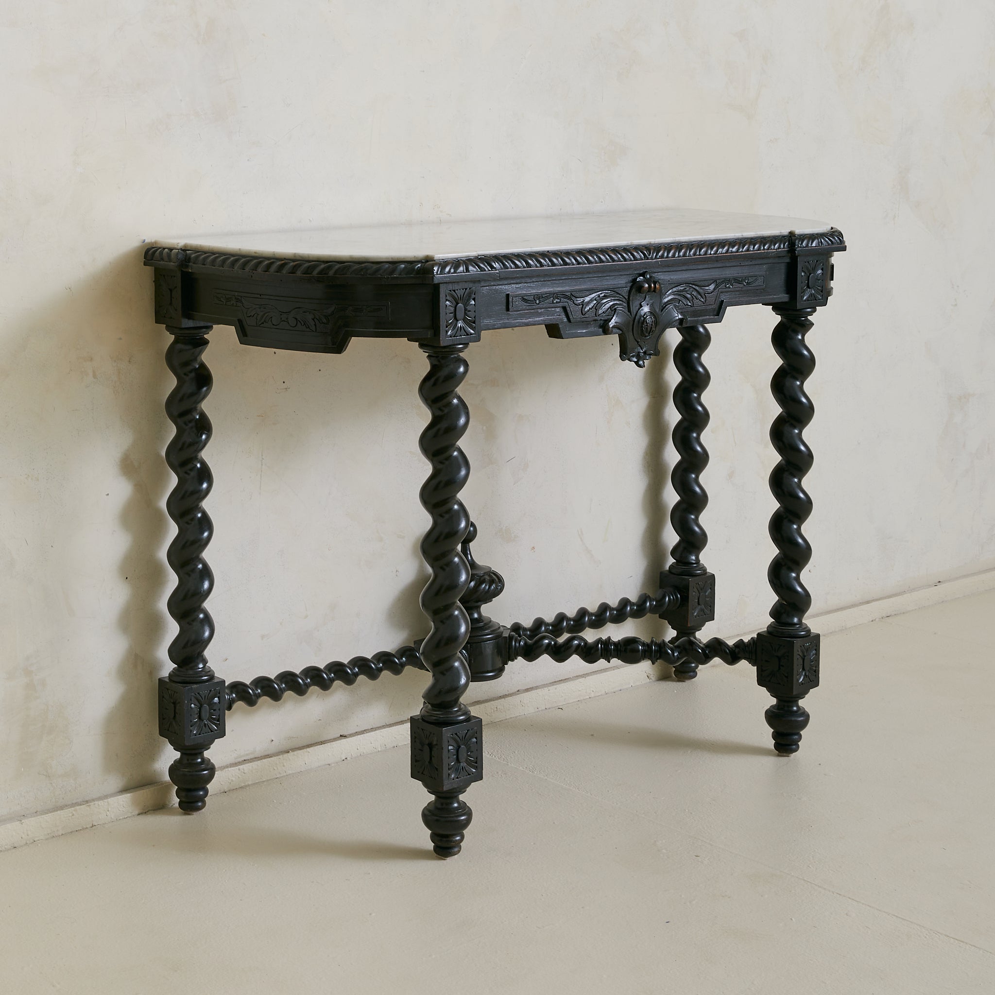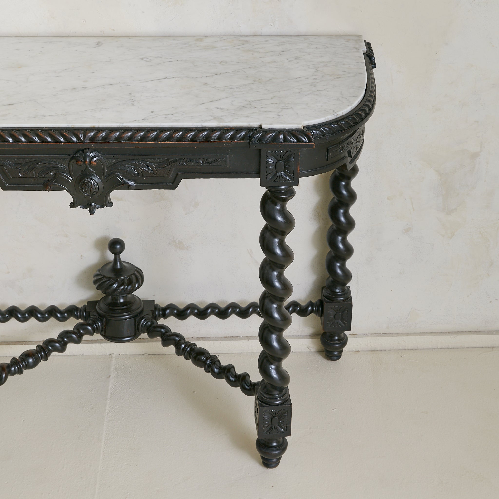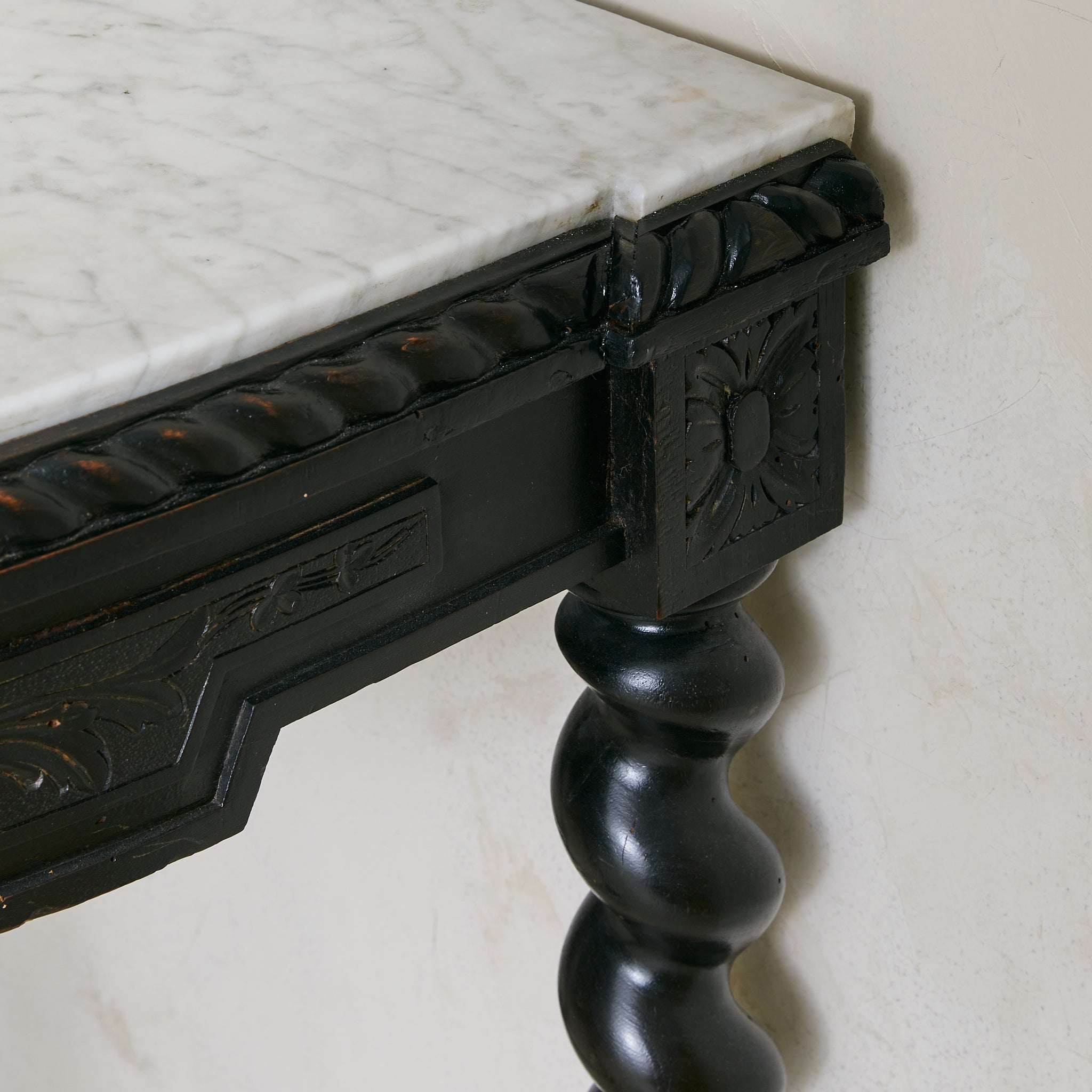 A 19th-century French console table with its original Carrara marble top. The carved ebonized wood base is richly ornamented—floral reliefs, roped edges, and a central medallion complement its form. Barley twist legs are joined by stretchers that meet at a turned finial. The white marble top, softly veined in dove grey, is precisely carved to fit flush with the base.