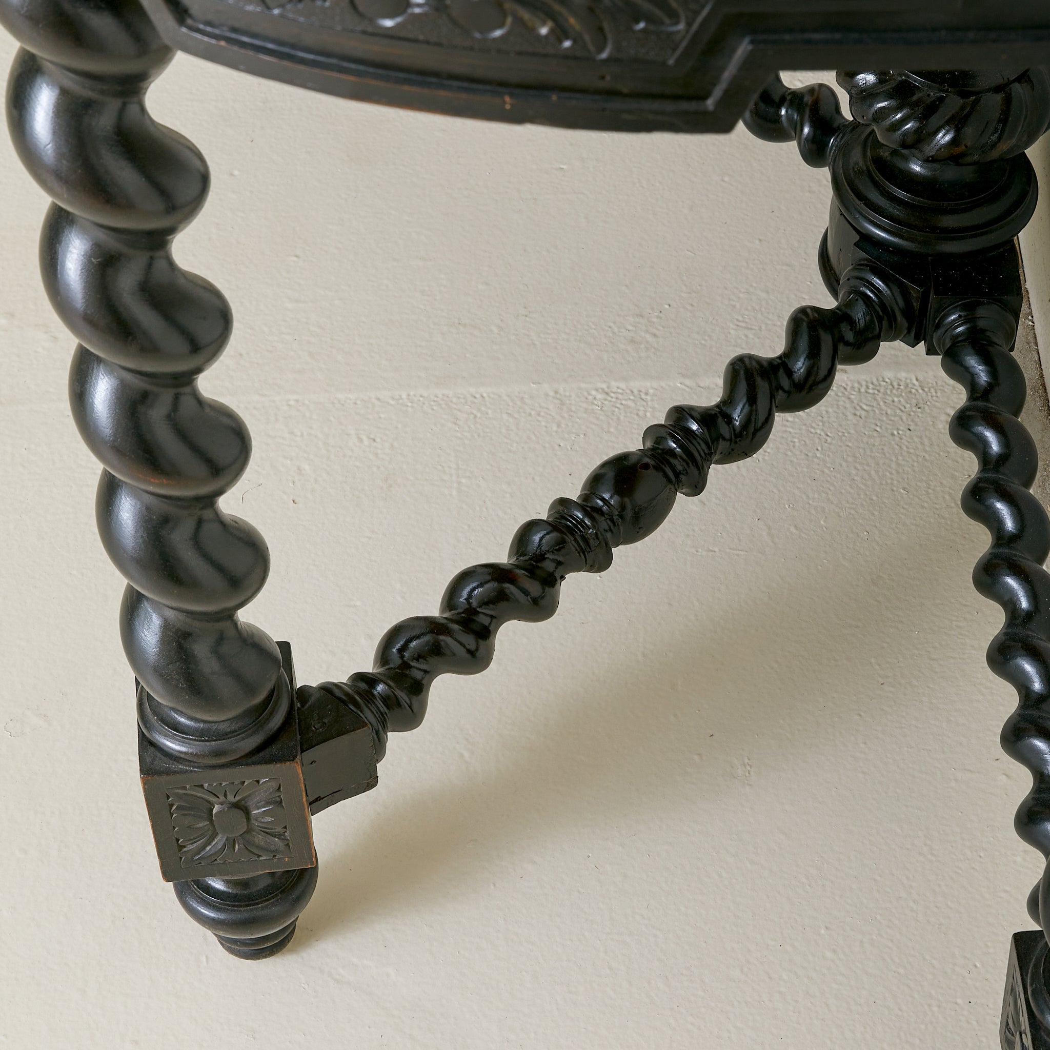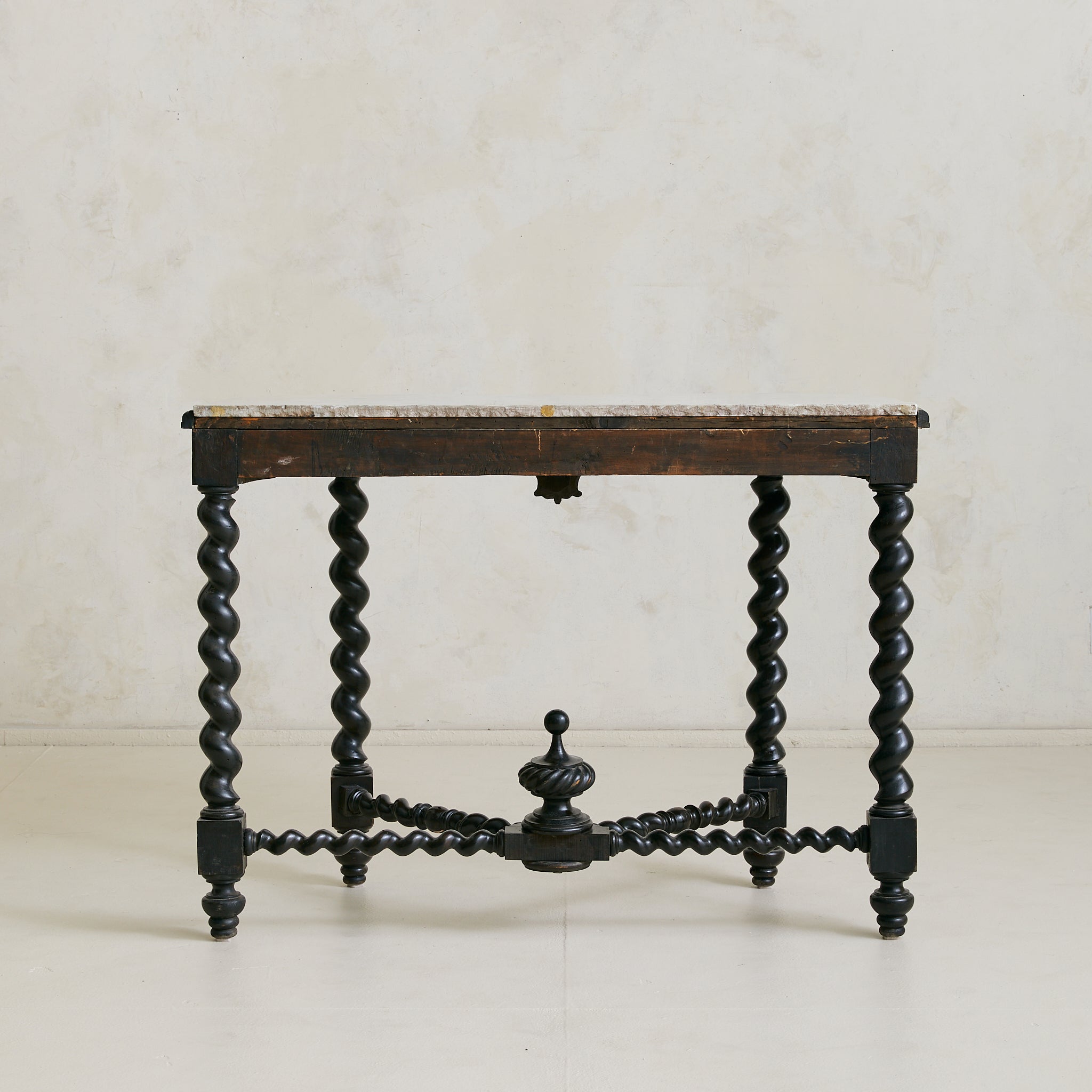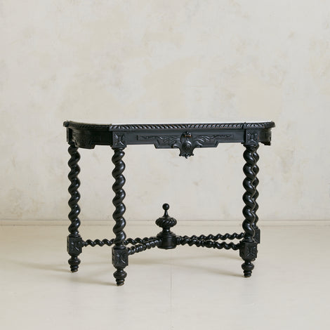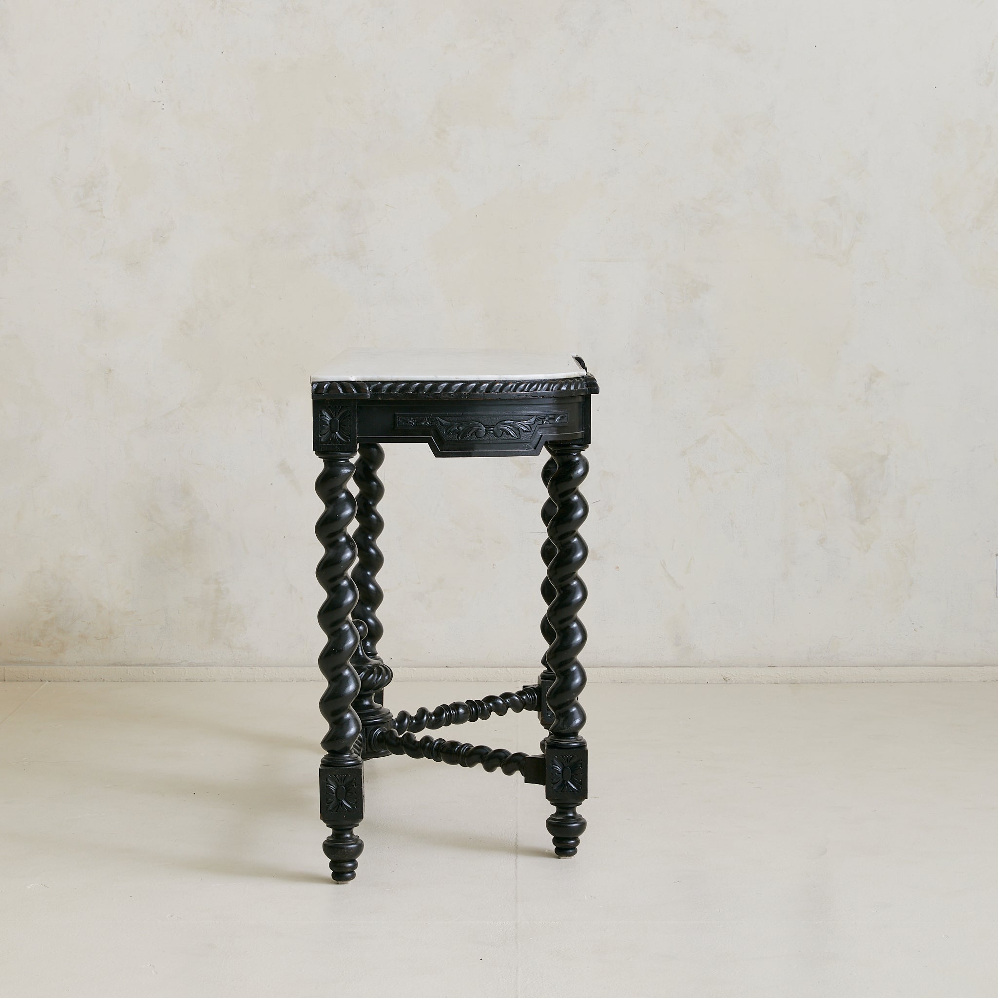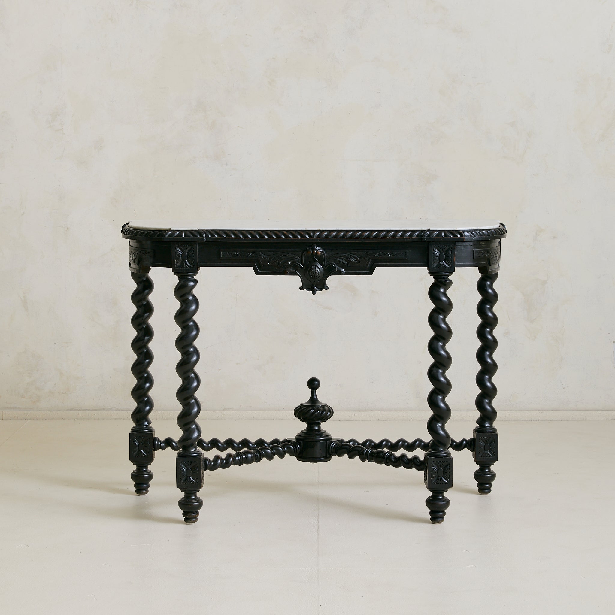 A 19th-century French console table with its original Carrara marble top. The carved ebonized wood base is richly ornamented—floral reliefs, roped edges, and a central medallion complement its form. Barley twist legs are joined by stretchers that meet at a turned finial. The white marble top, softly veined in dove grey, is precisely carved to fit flush with the base.