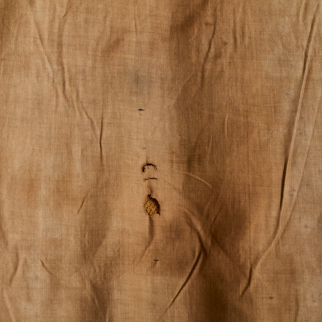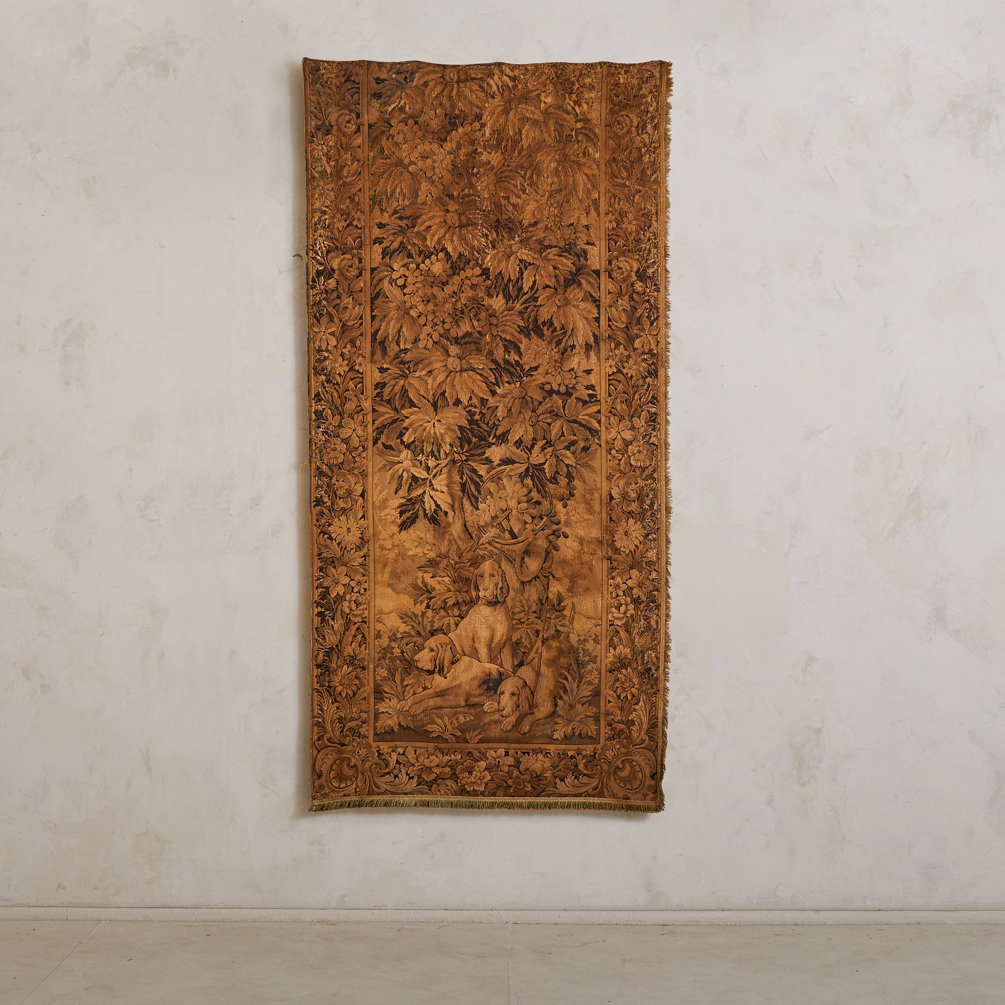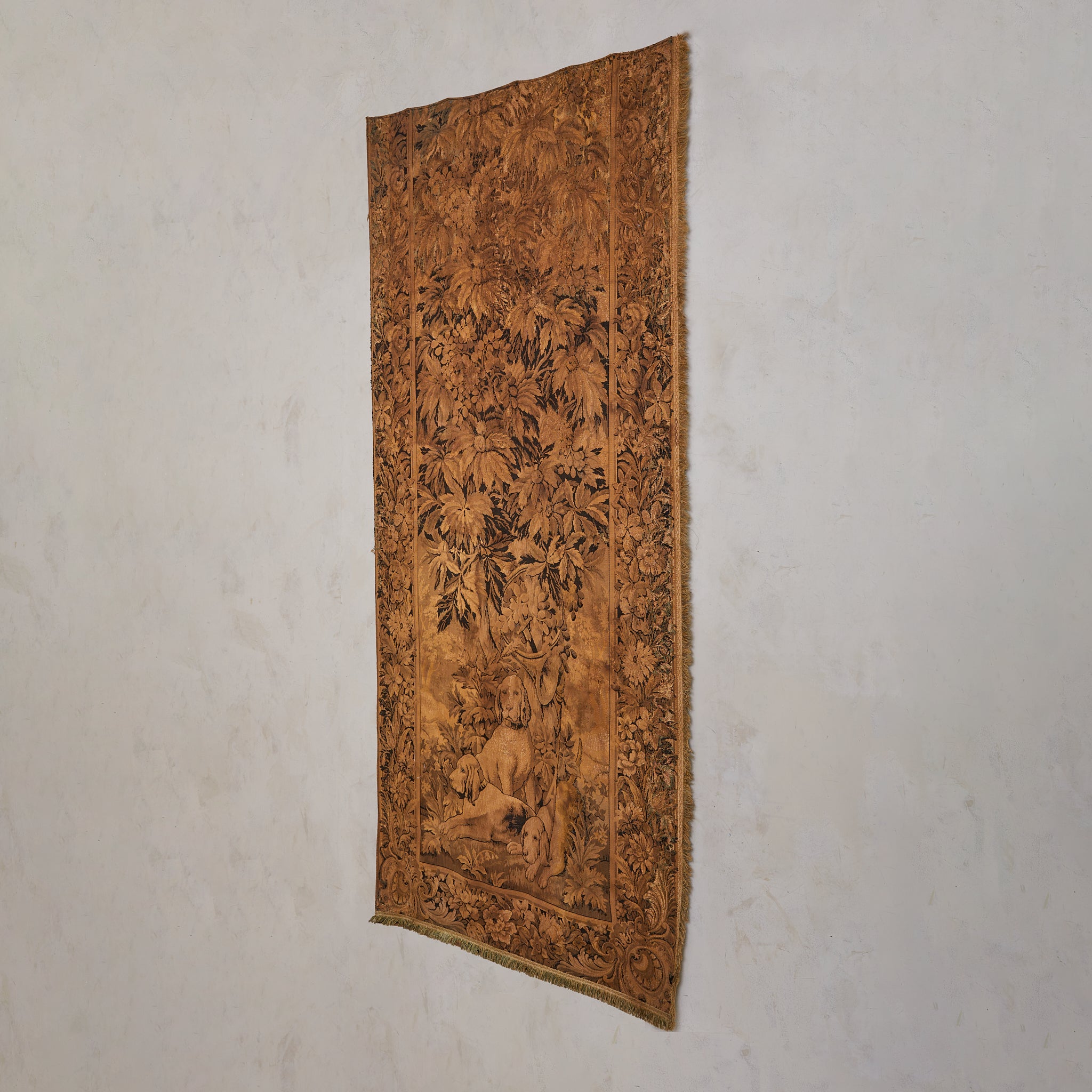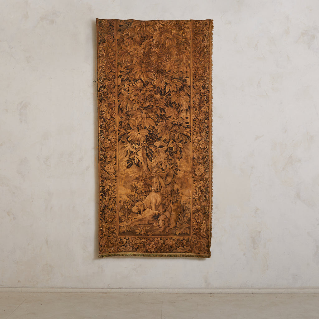 A late 19th-century French tapestry, hand-woven in wool and later backed in cotton for preservation. Rendered in a restrained palette of sepia and umber, the limited coloration only amplifies the depth and nuance of its composition. At its heart, three loyal hunting dogs rest beneath a vaulted canopy of chestnut leaves—still, yet watchful, their expressions tender with quiet alertness.