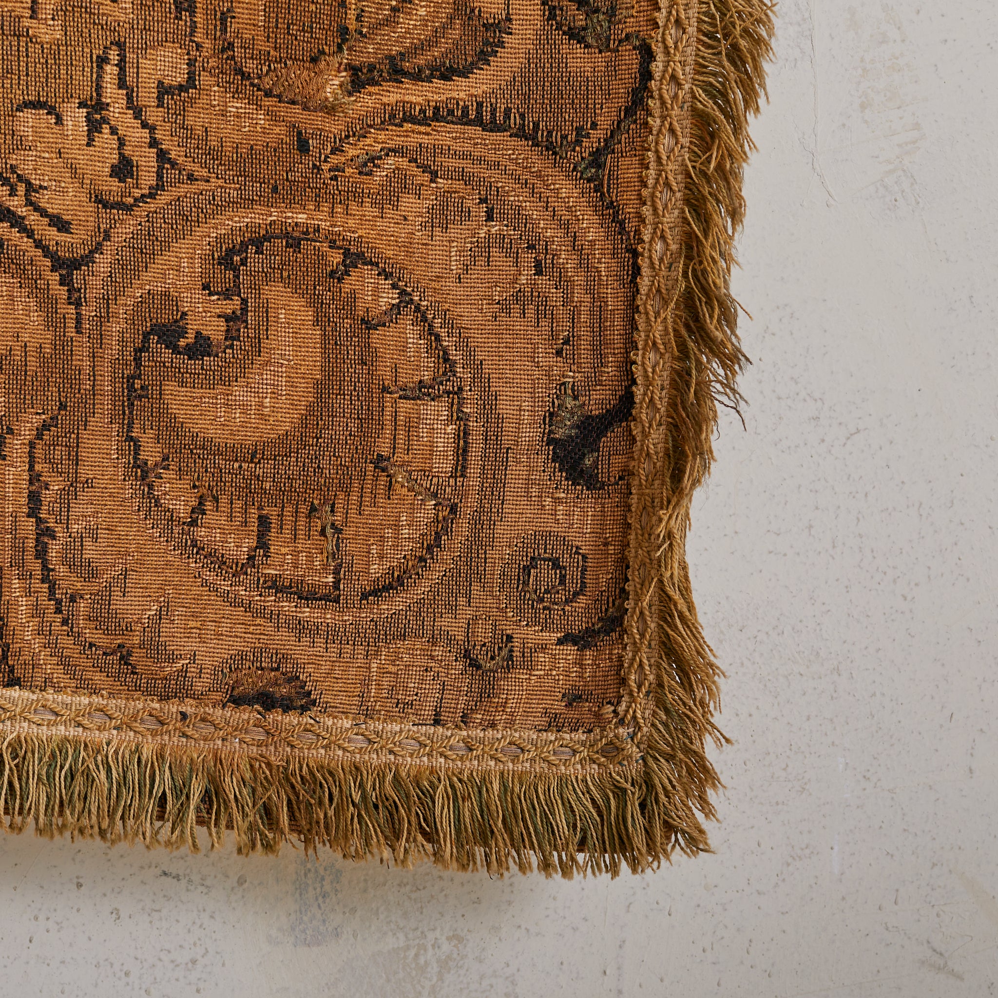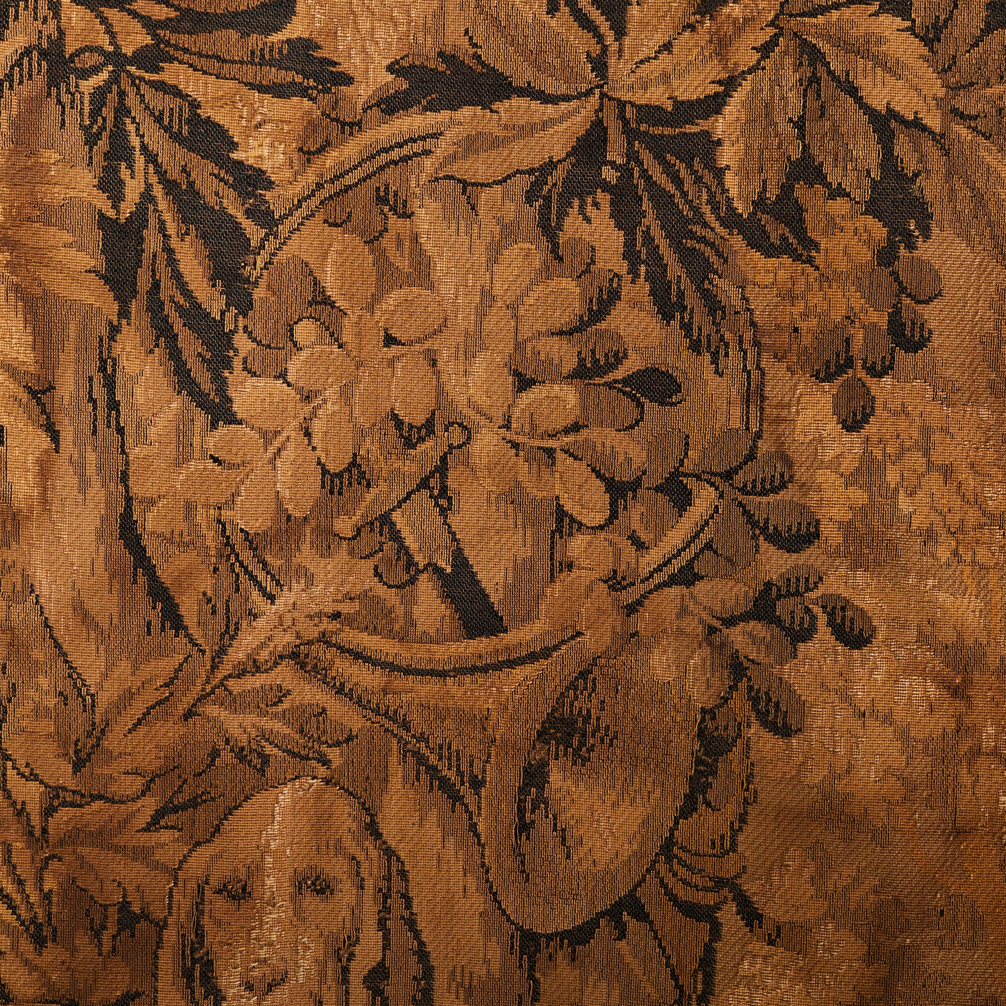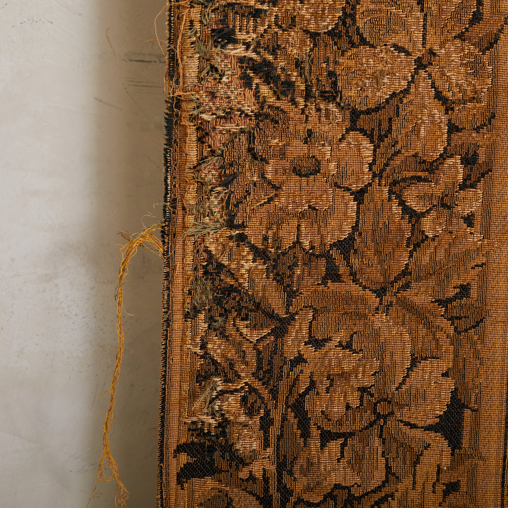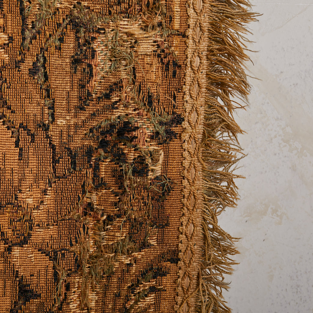 An ornate border of curling acanthus, ripe fruit, and scrollwork frames the tableau like a living reliquary—florid but controlled, baroque in spirit. Woven not just as decoration but as narrative, the piece carries a melancholy grace: a still from a pastoral past, full of silence and story.