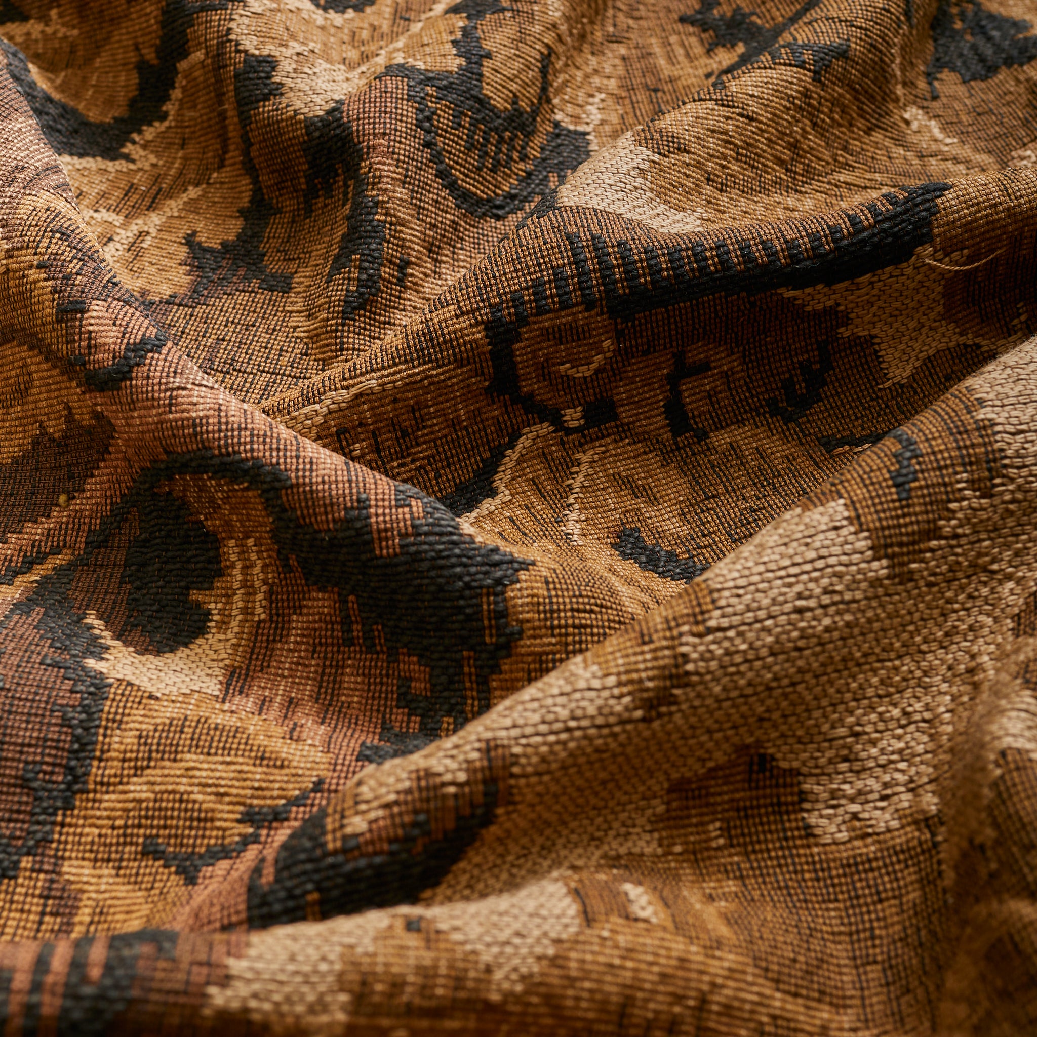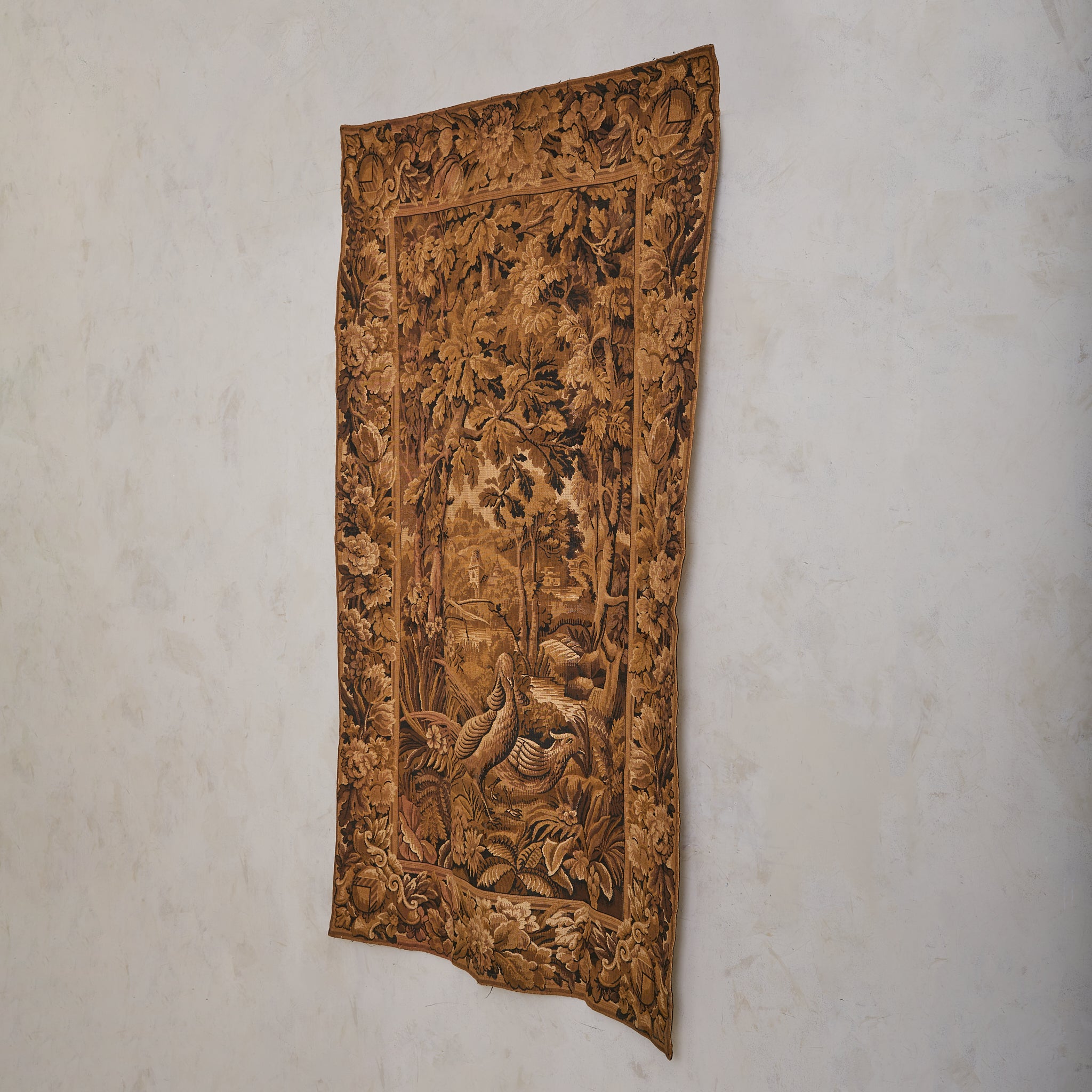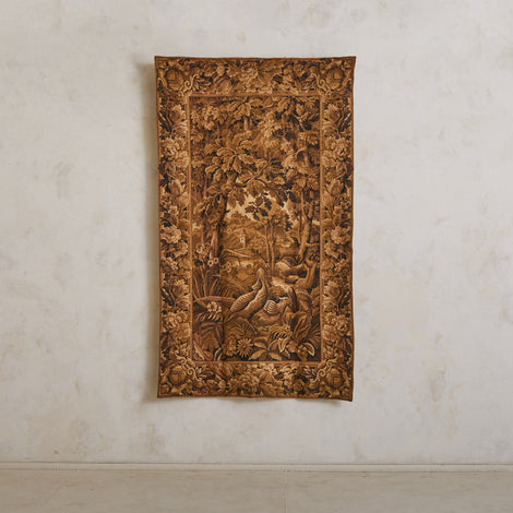 Earthy, theatrical, and intricately textured, this textile captures the pastoral imagination of Belle Époque France. Mural in spirit but easier to place—measuring 47.5 inches across—it serves as both statement and softness, anchoring a wall with warmth, depth, and quiet grandeur.