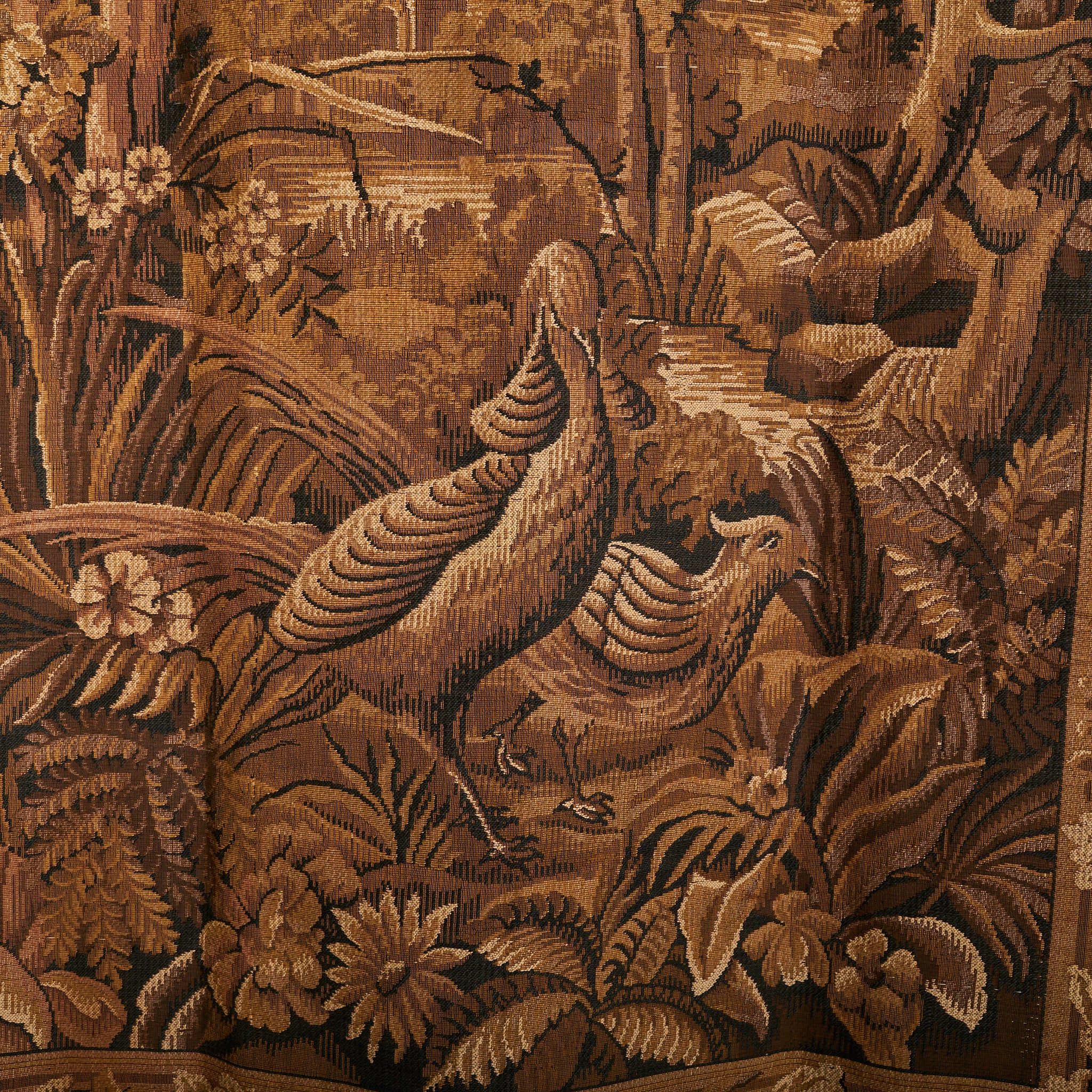 A late 19th-century French tapestry, hand-woven in wool and later backed in cotton, composed in a warm palette of sepia, umber, and burnt gold. The scene is lush and dreamlike: a pair of peacocks nestled among wild grasses and oversized foliage, their forms softly echoed by the curling ferns and blooming undergrowth that surrounds them.