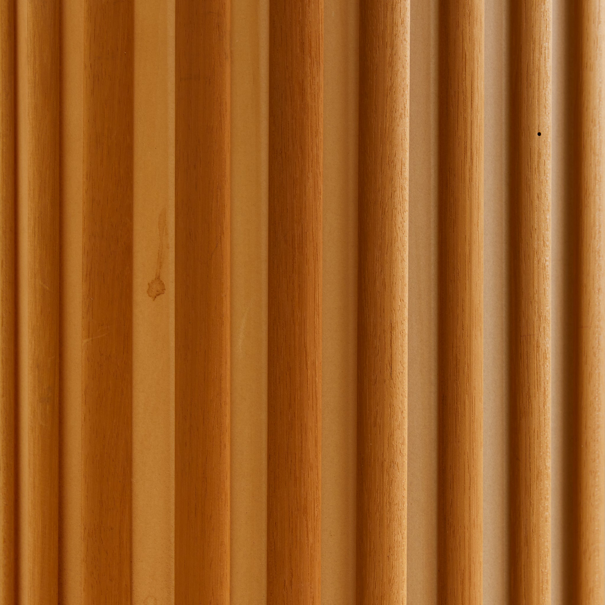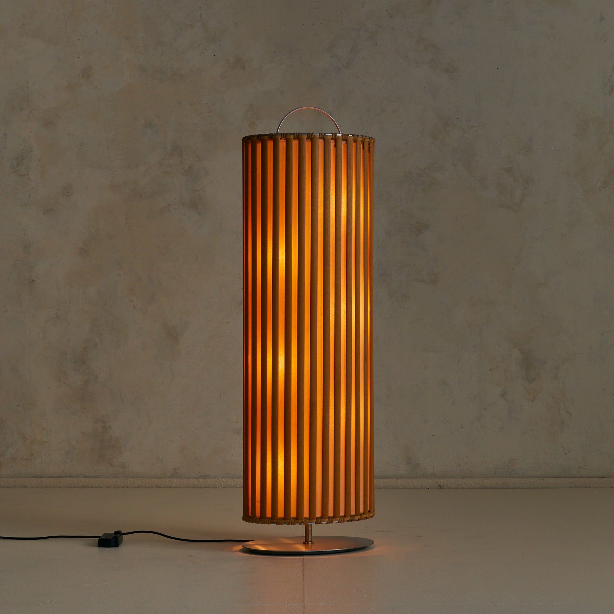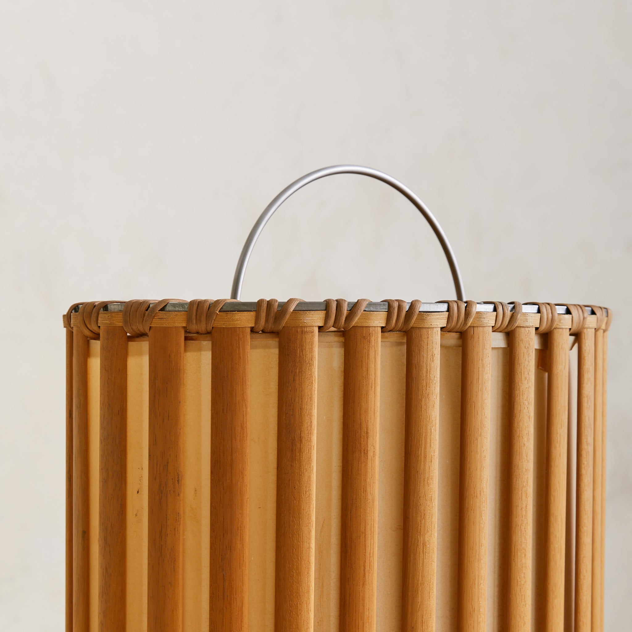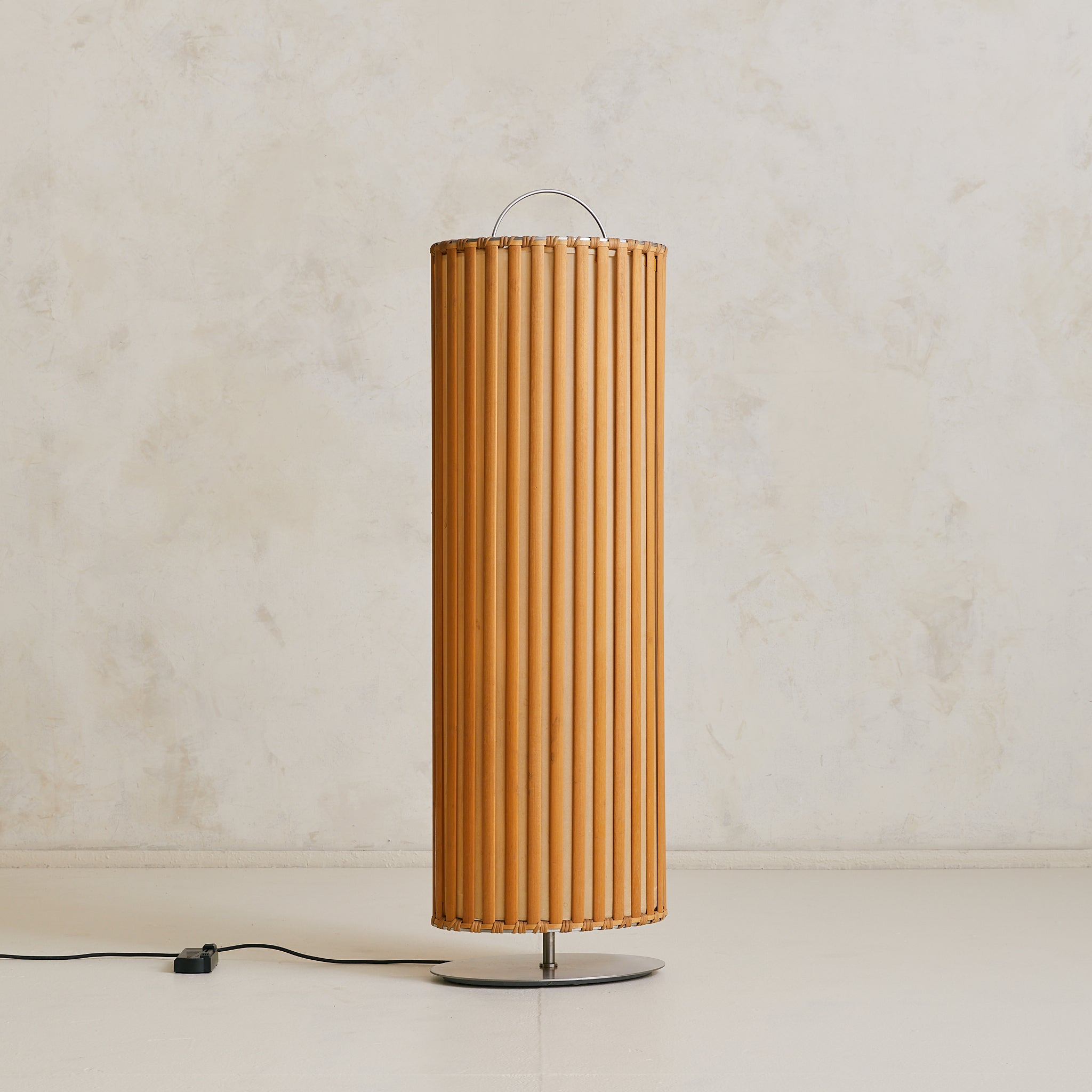 A rare ‘Aia’ floor lamp designed by Toshiyuki Kita for Sawaya & Moroni in 2002. Standing over four feet tall, the cylindrical form is composed of vertical wood slats framing panels of delicate shoji-like paper, anchored by a metal base. When illuminated, the paper glows with a gentle, diffused radiance, its warmth playing against the subtle grain of the wood. Balancing traditional Japanese materiality with contemporary lines, it feels equally at home in a minimalist living room, gallery-style interior, or serene corner setting.