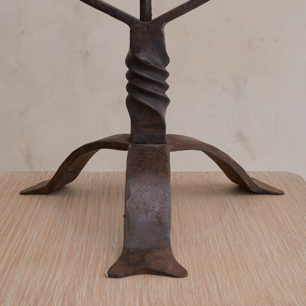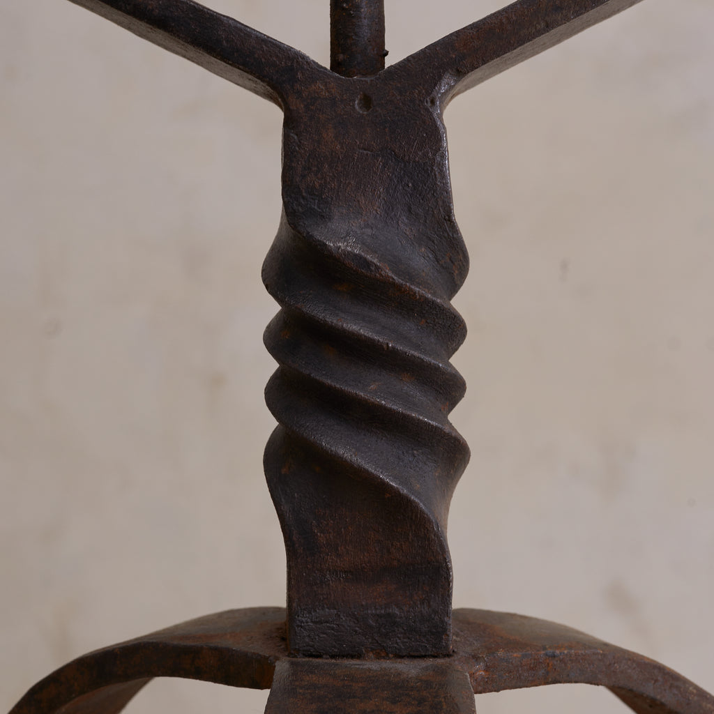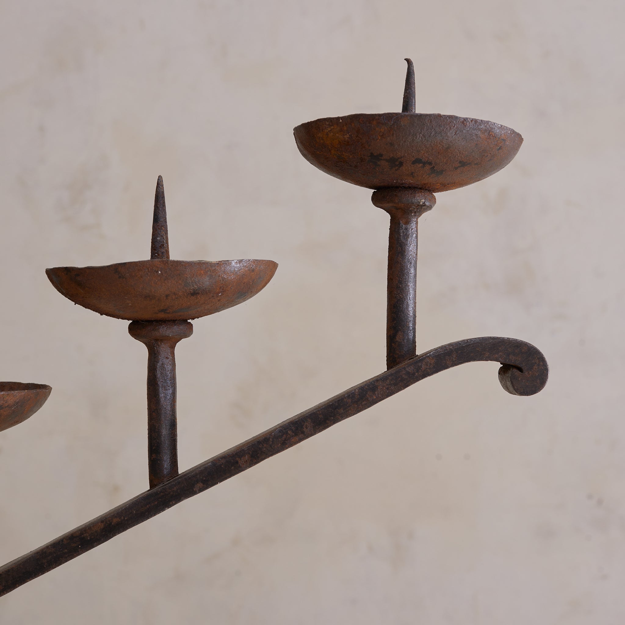 An early 20th-century French candelabra, hand-forged in iron with a sculptural presence. Measuring three feet across, its sweeping arms and twisted central column speak to the artisanal strength of traditional blacksmithing. Each cup is spiked to hold a candle, balanced on splayed legs that ground the form with weight.