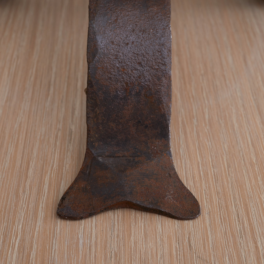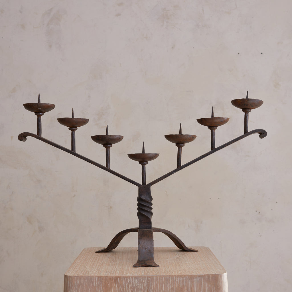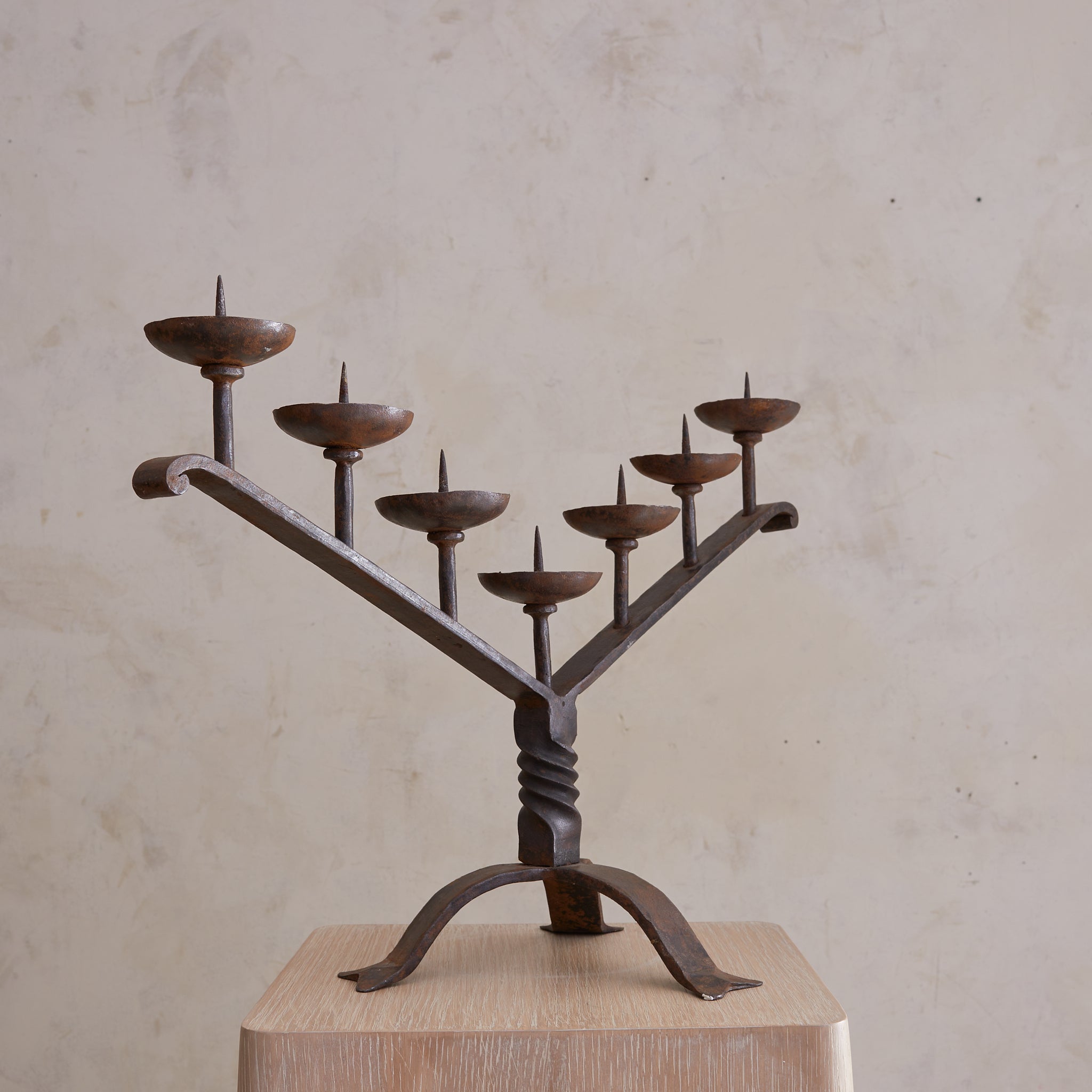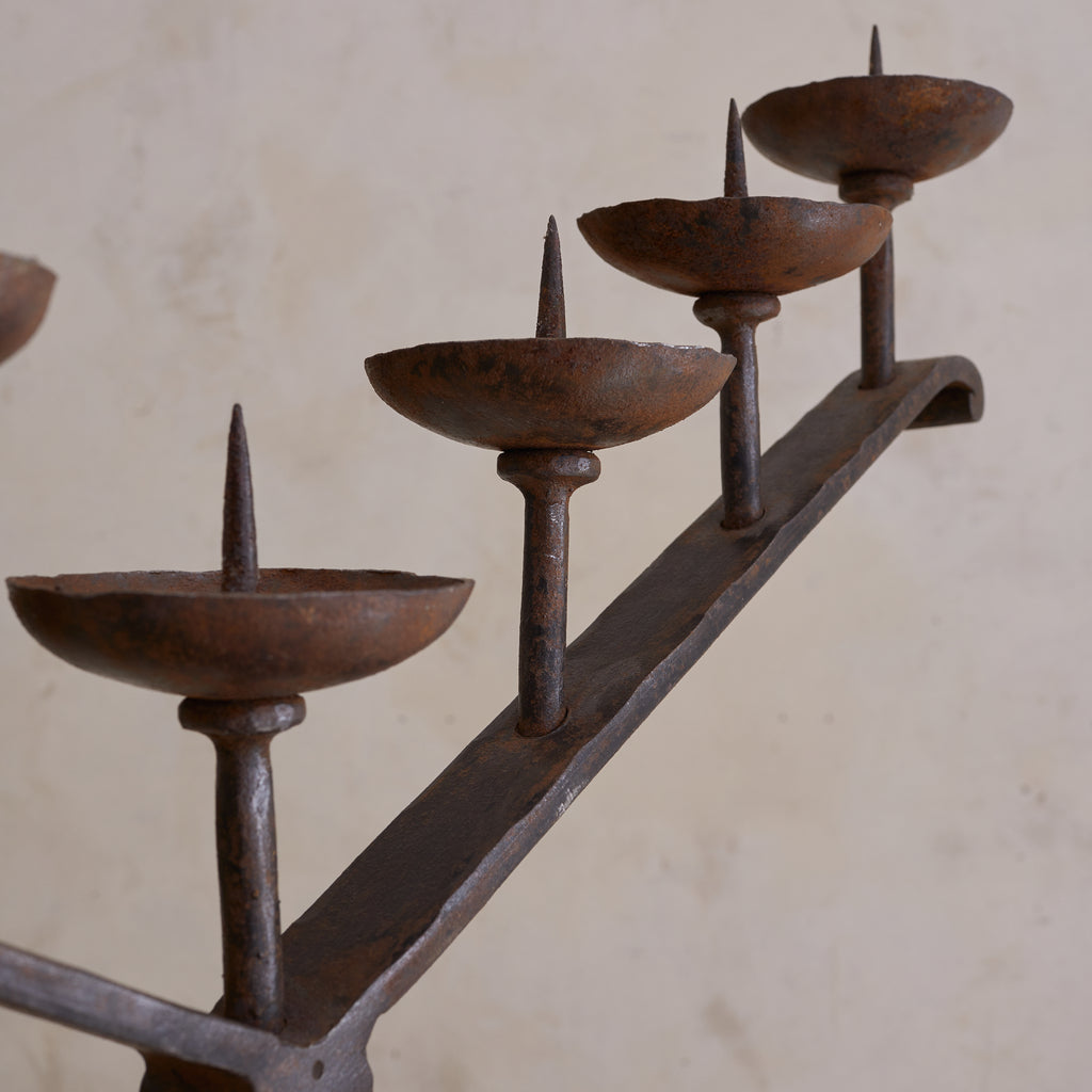 An early 20th-century French candelabra, hand-forged in iron with a sculptural presence. Measuring three feet across, its sweeping arms and twisted central column speak to the artisanal strength of traditional blacksmithing. Each cup is spiked to hold a candle, balanced on splayed legs that ground the form with weight.