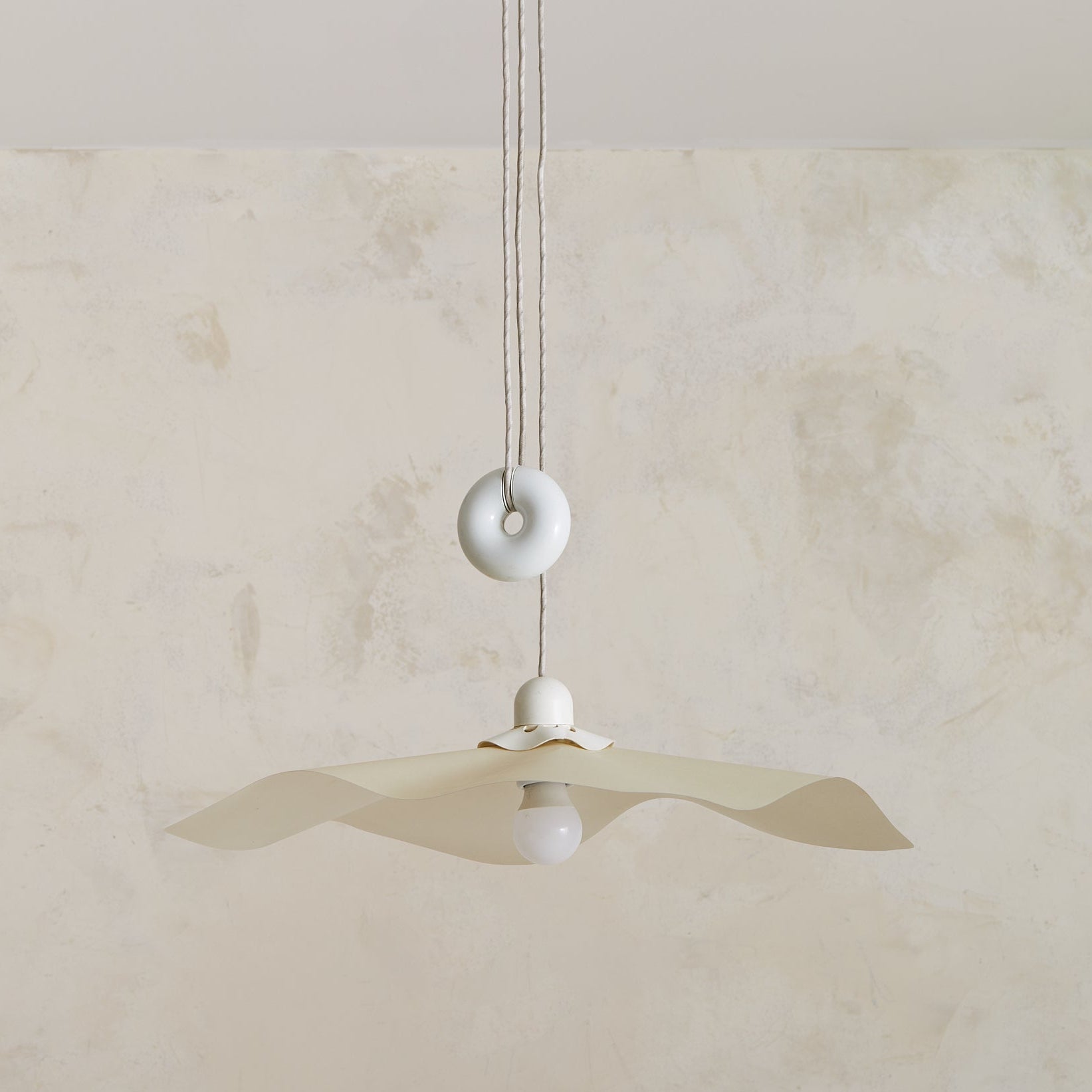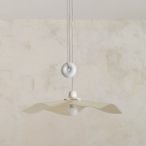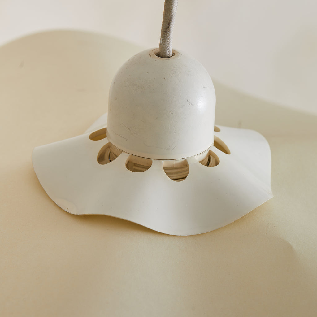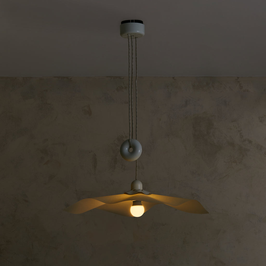 The ‘Area 50’ pendant light, designed by Mario Bellini, is a rare and iconic piece produced by Artemide in 1976. The resin shade, delicately folded like flowing fabric, diffuses light in a soft, ambient glow, enhancing its poetic presence. It retains its original metal canopy and doughnut-shaped counterweight in a white enameled finish, allowing for variable height adjustments.