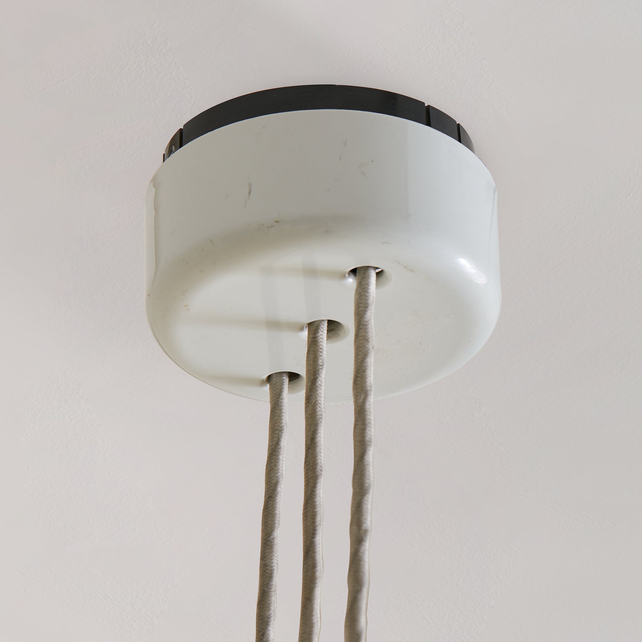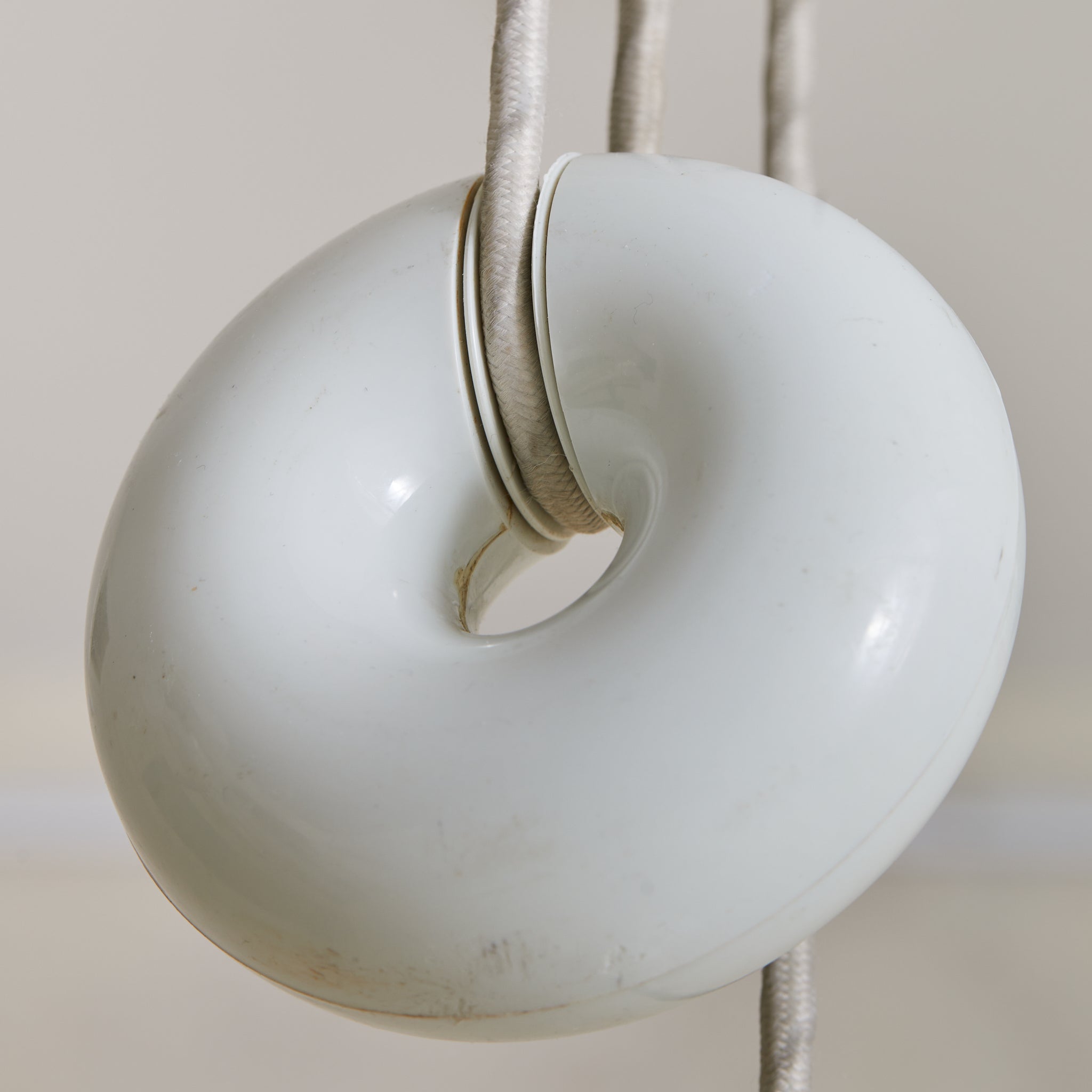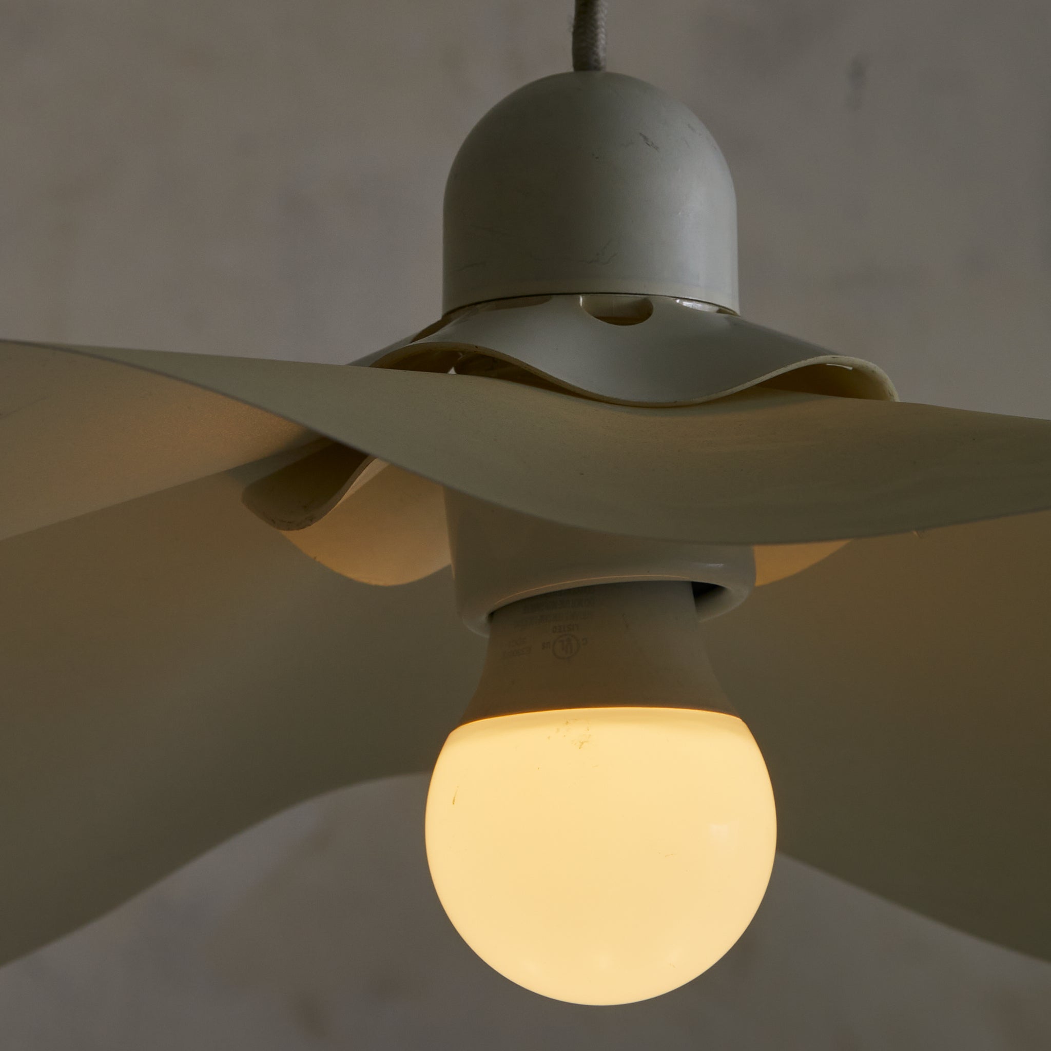 The ‘Area 50’ pendant light, designed by Mario Bellini, is a rare and iconic piece produced by Artemide in 1976. The resin shade, delicately folded like flowing fabric, diffuses light in a soft, ambient glow, enhancing its poetic presence. It retains its original metal canopy and doughnut-shaped counterweight in a white enameled finish, allowing for variable height adjustments.