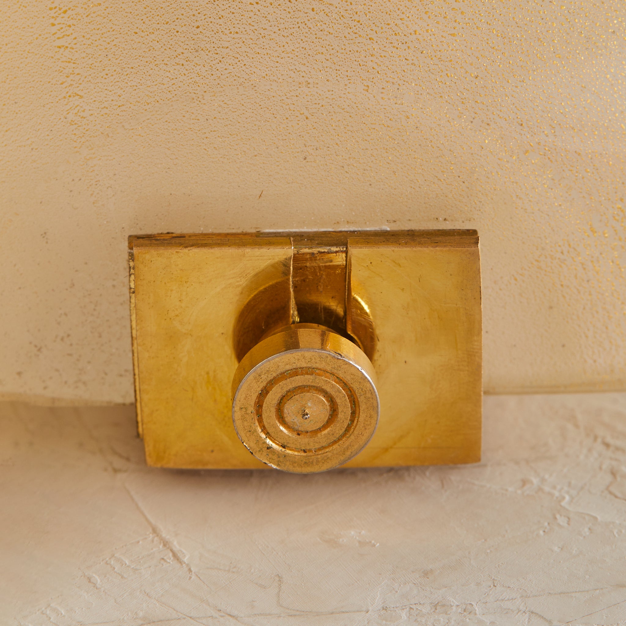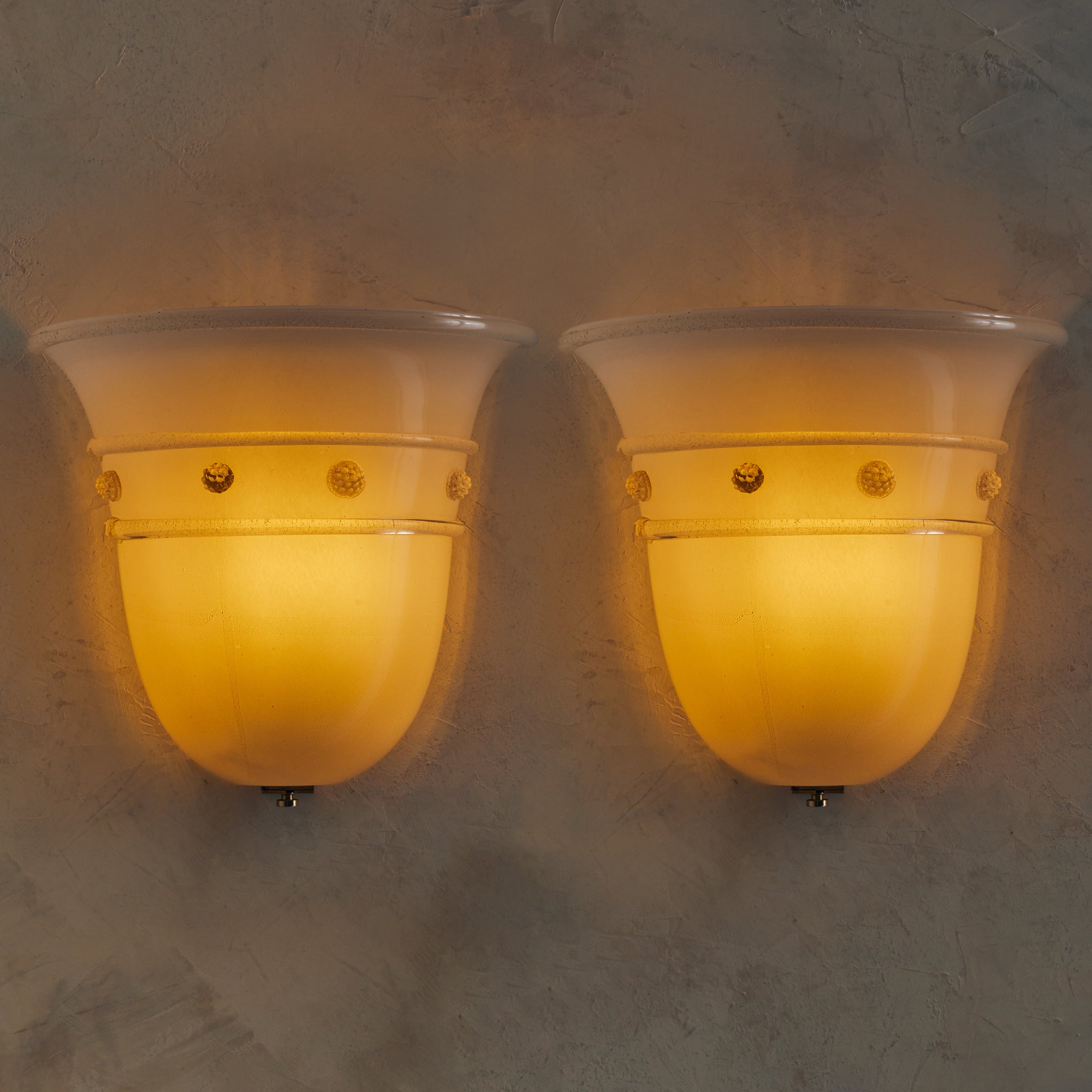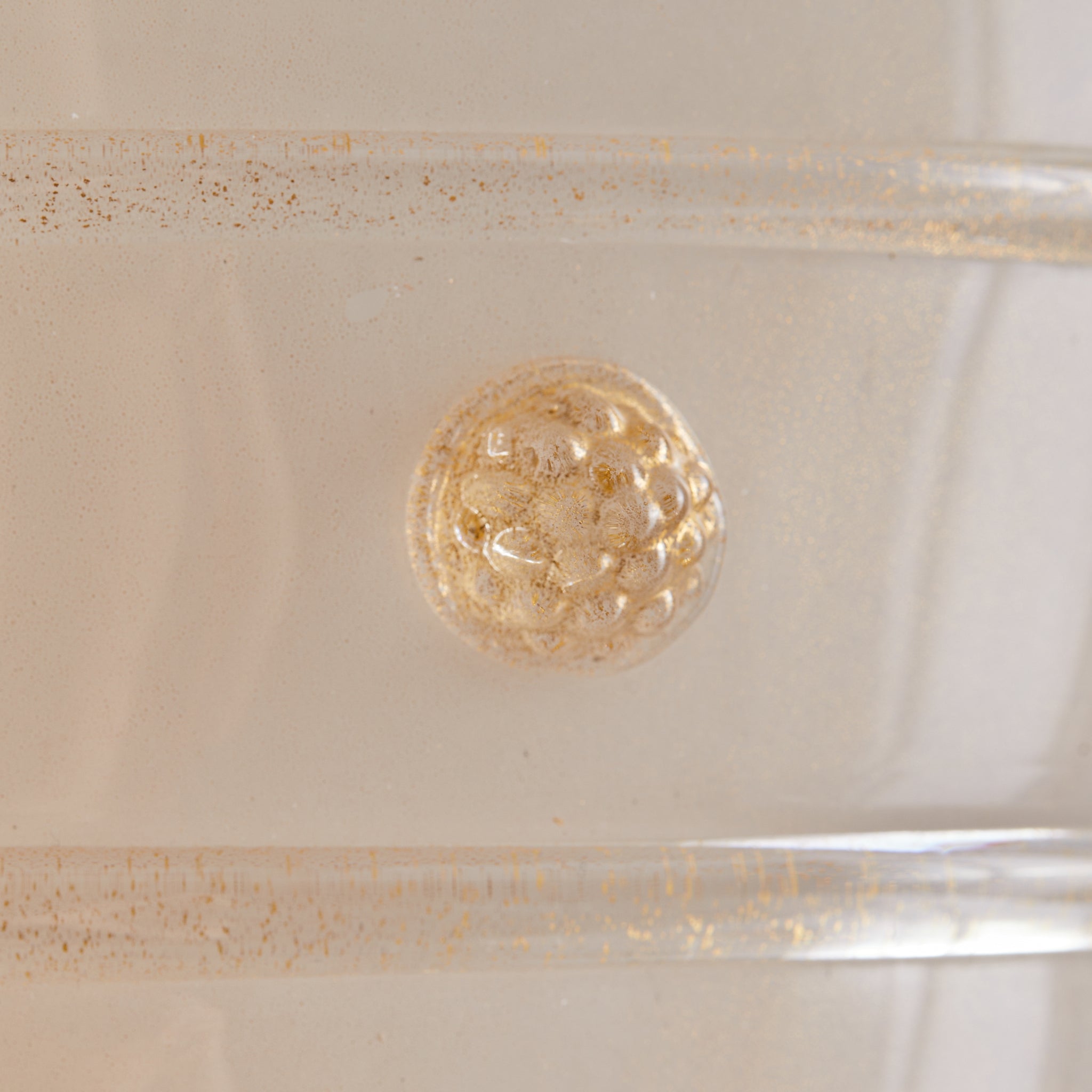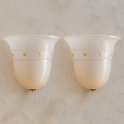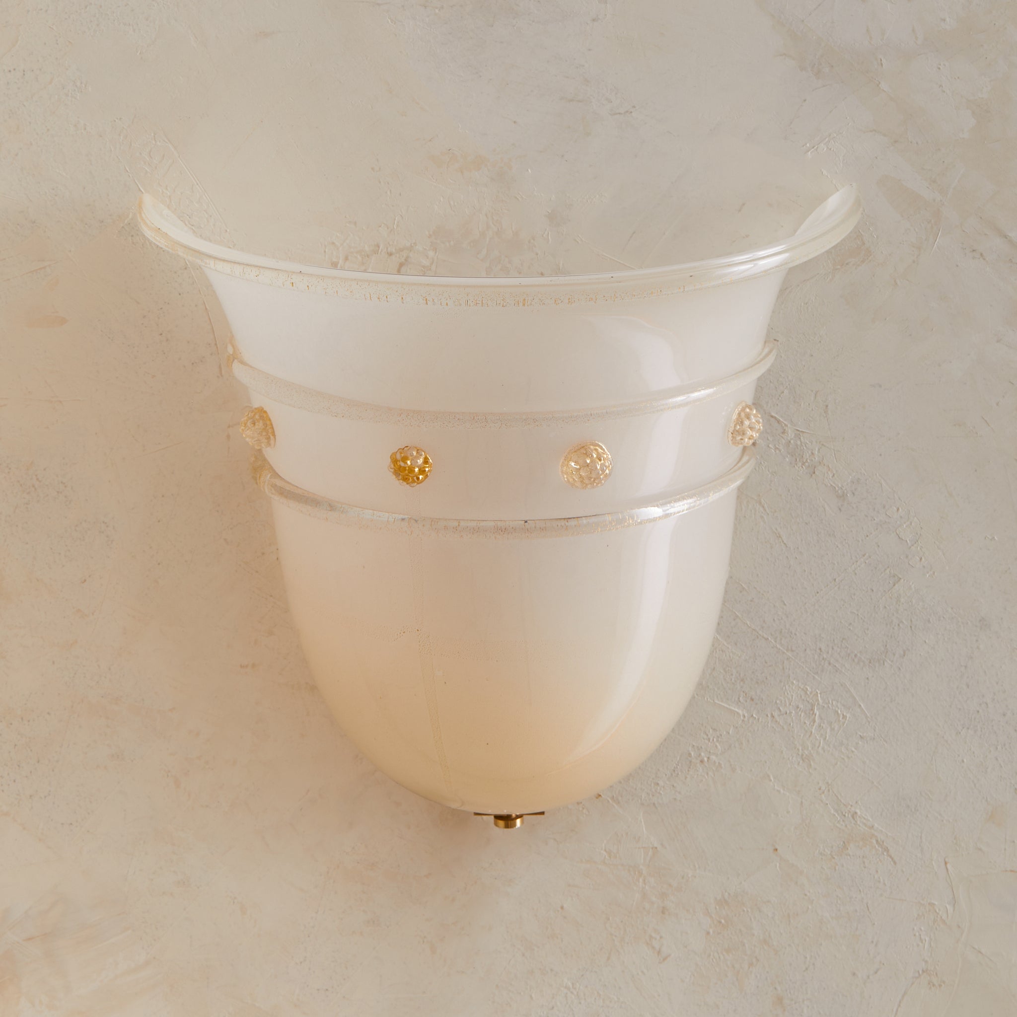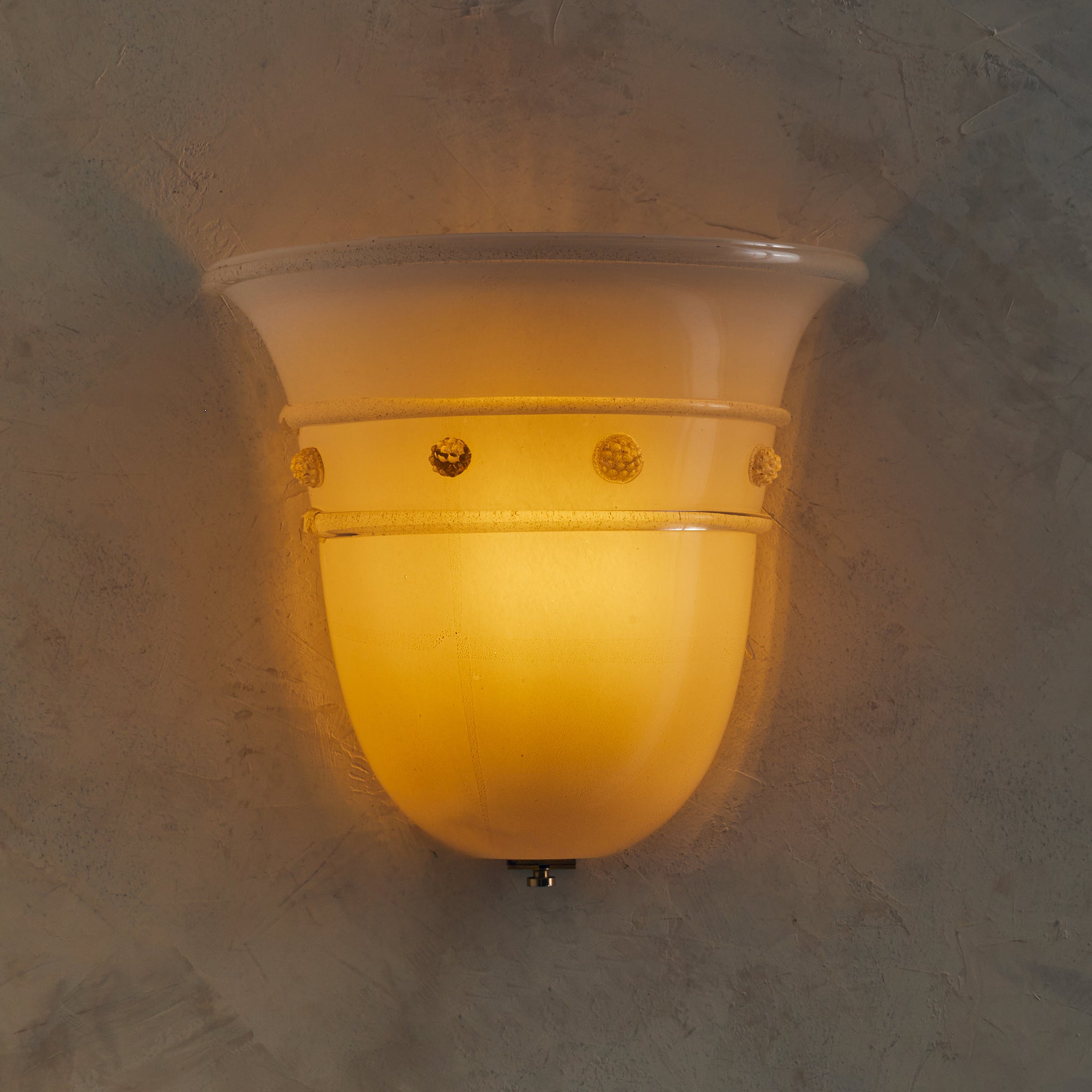 An Italian Murano glass sconce by the esteemed Barovier & Toso atelier, model “Empire.” Hand-blown in milky glass with soft gilt flecks suspended throughout. The flared silhouette is banded with rings and adorned with applied florets in subtle relief—each one catching the light with a quiet shimmer. Designed in the mid 1980's by the Atelier.